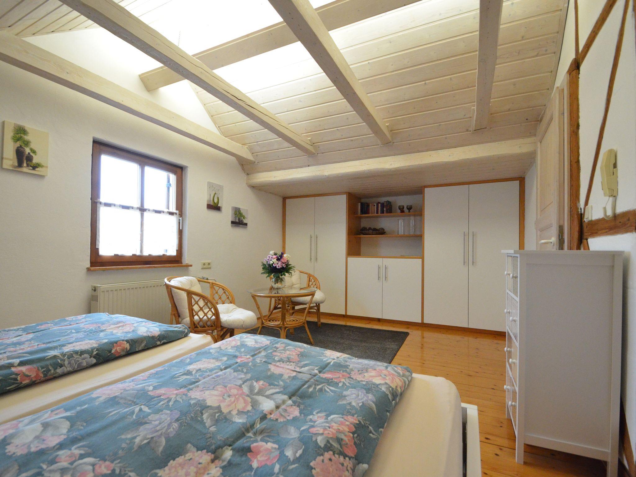 Ihr Schlafzimmer bietet Ihnen ein großes Doppelbett (2x2 m) mit verstellbarem Lattenrost und Allergiker geeignete Betten. Ausreichend Bettwäsche ist vorhanden. Ein geräumiger Wandschrank (inkl. mehrerer Kleiderbügel), ein Regal und eine Sitzgruppe sorgen für die nötige Ablagefläche. Ein Kinderbett ist ebenfalls vorhanden.