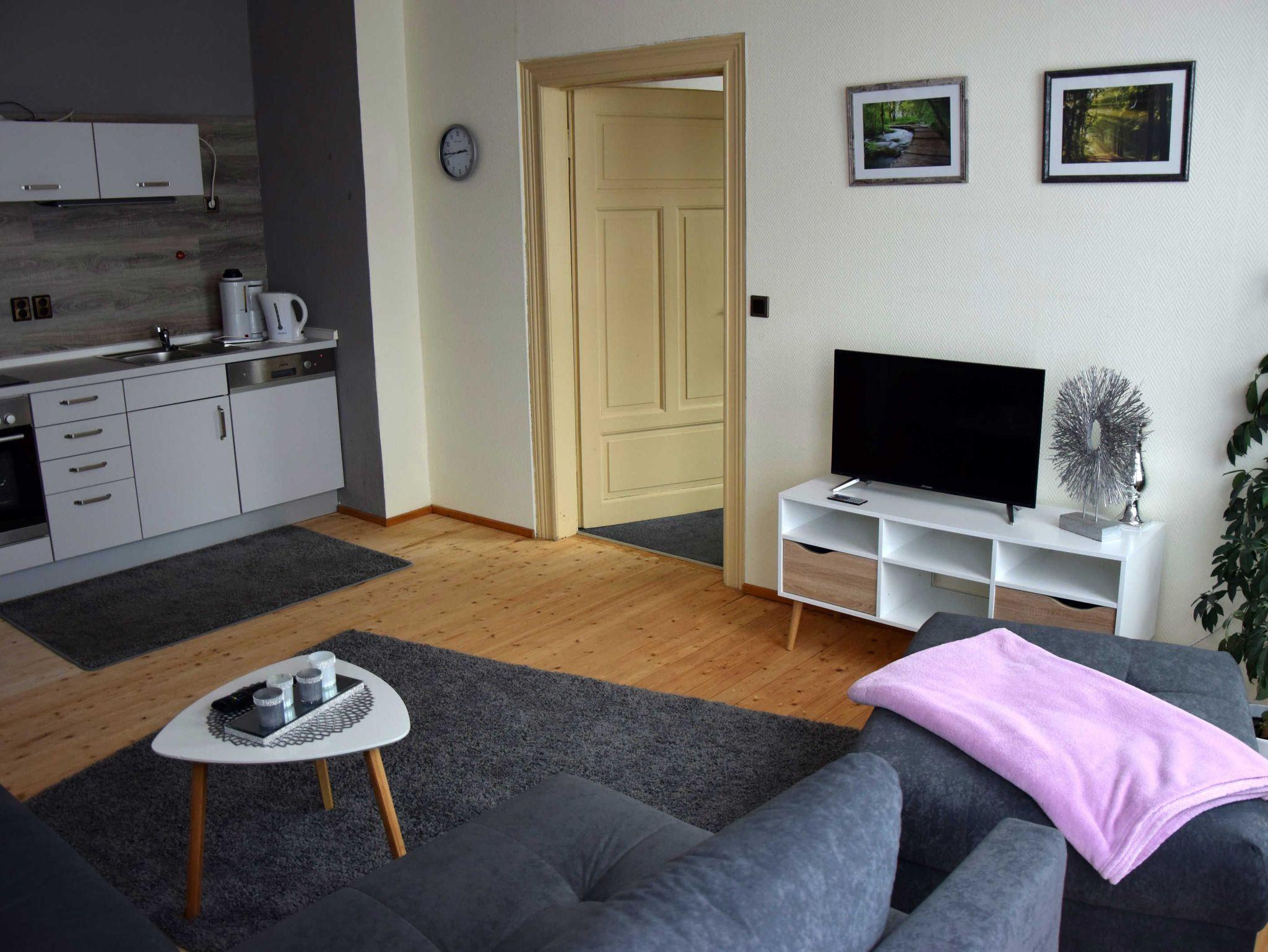 Zusätzlich zu der Größe von 80 m² zählt auch ein großer Balkon, welcher an das große Wohnzimmer mit Couch, Sat TV und offener Küche angrenzt.