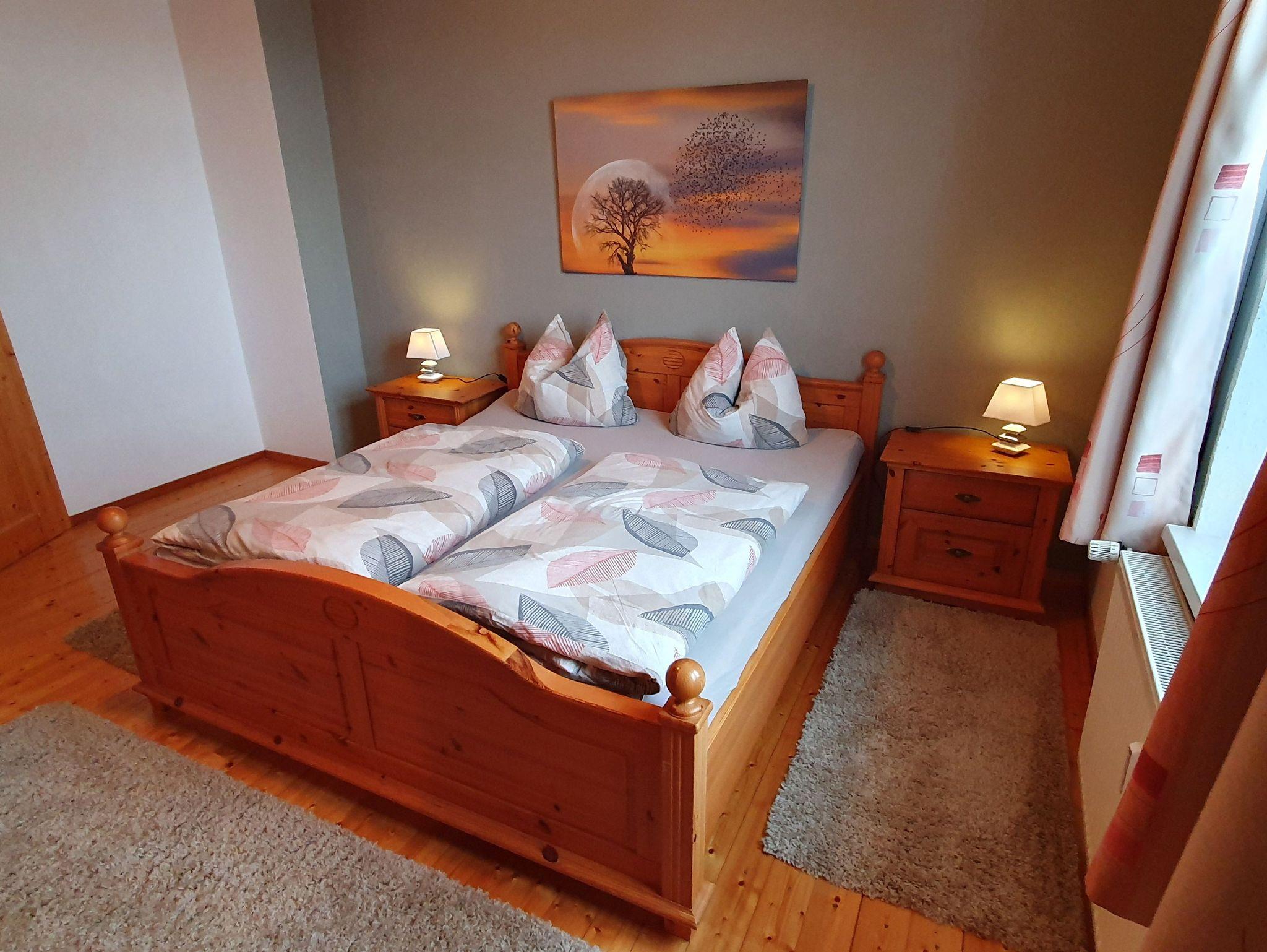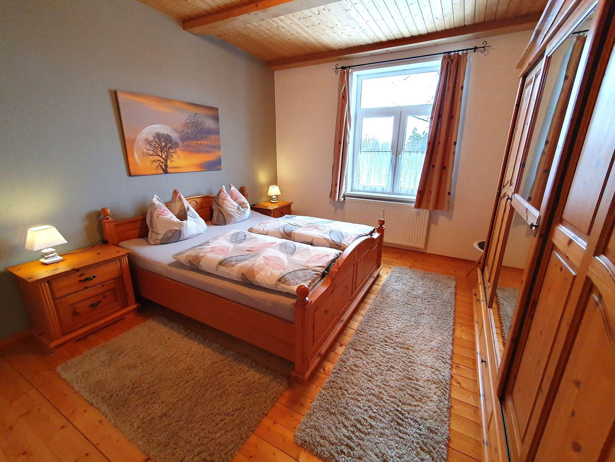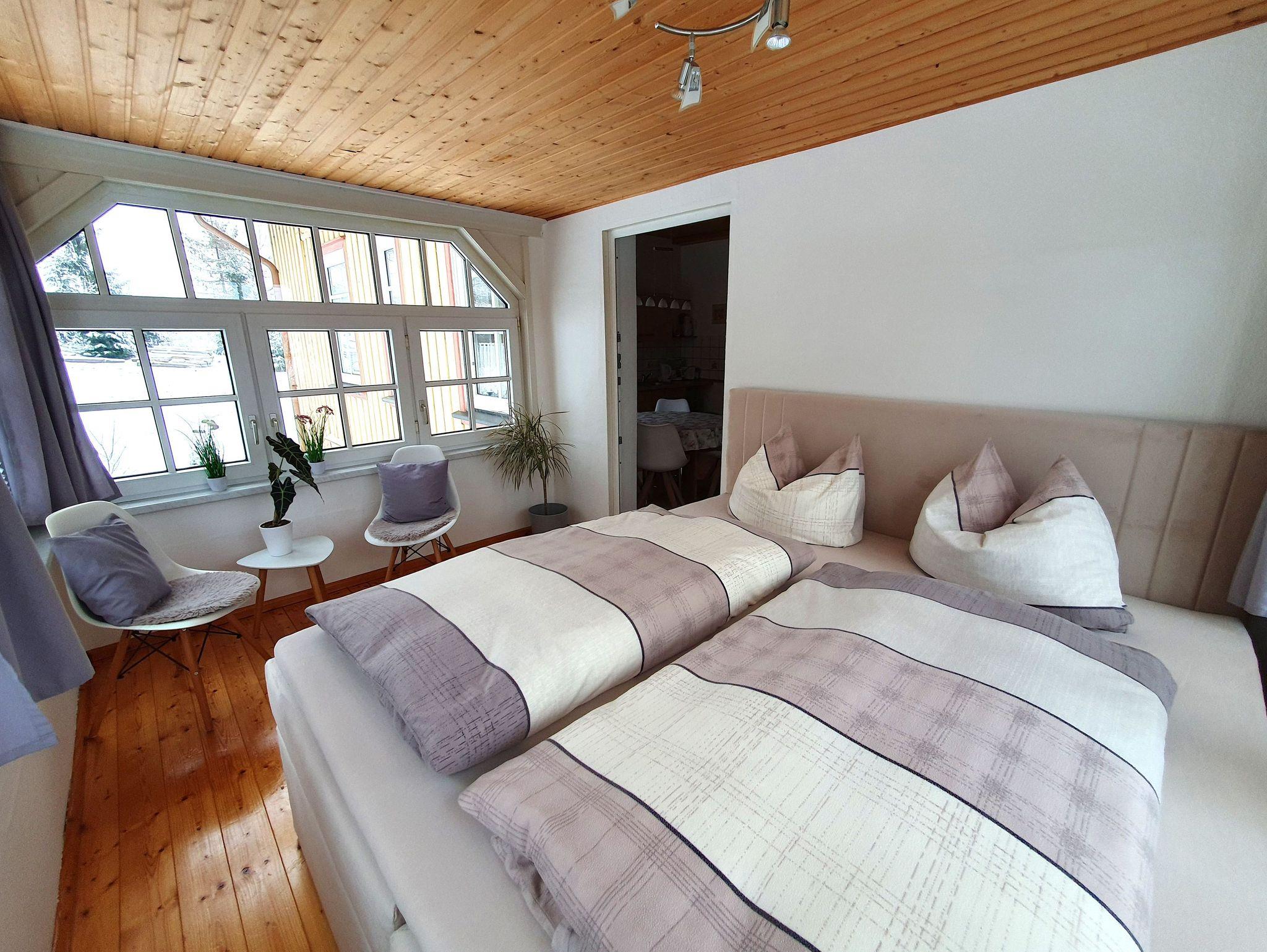 Zu der Ferienwohnung gehören zwei Schlafräume, ein Elternschlafzimmer mit einem Doppelbett und großen Kleiderschrank und eine weitere Schlafmöglichkeit in einer lichtdurchfluteten Veranda mit einem Boxspringbett. (Separater Raum)