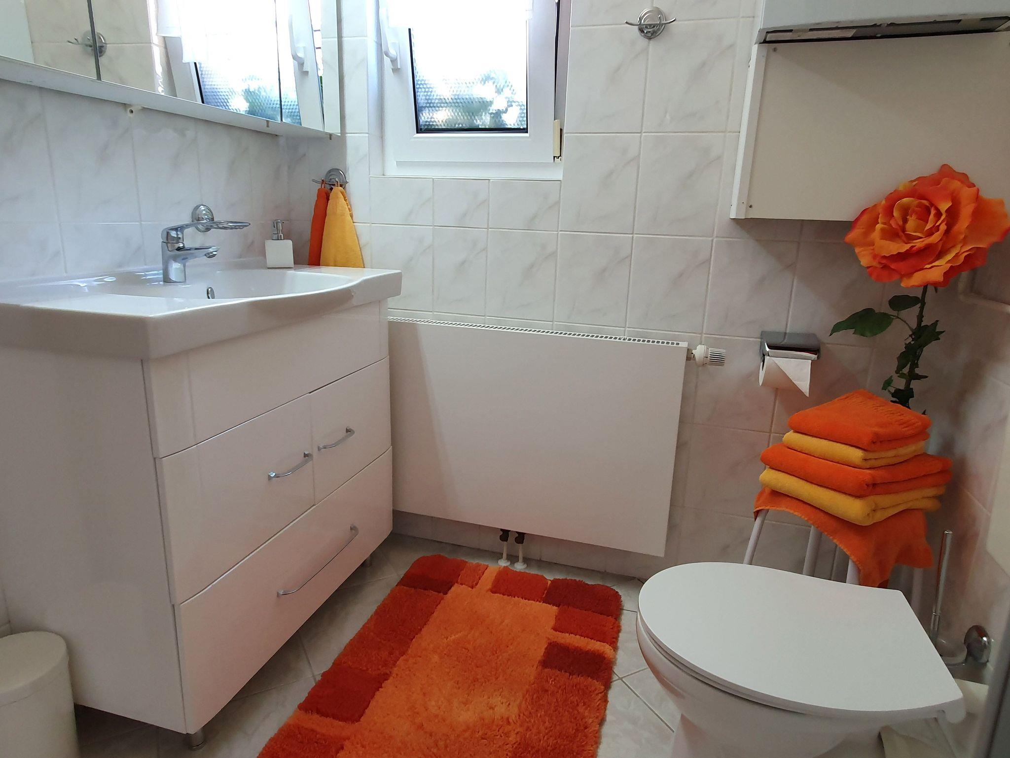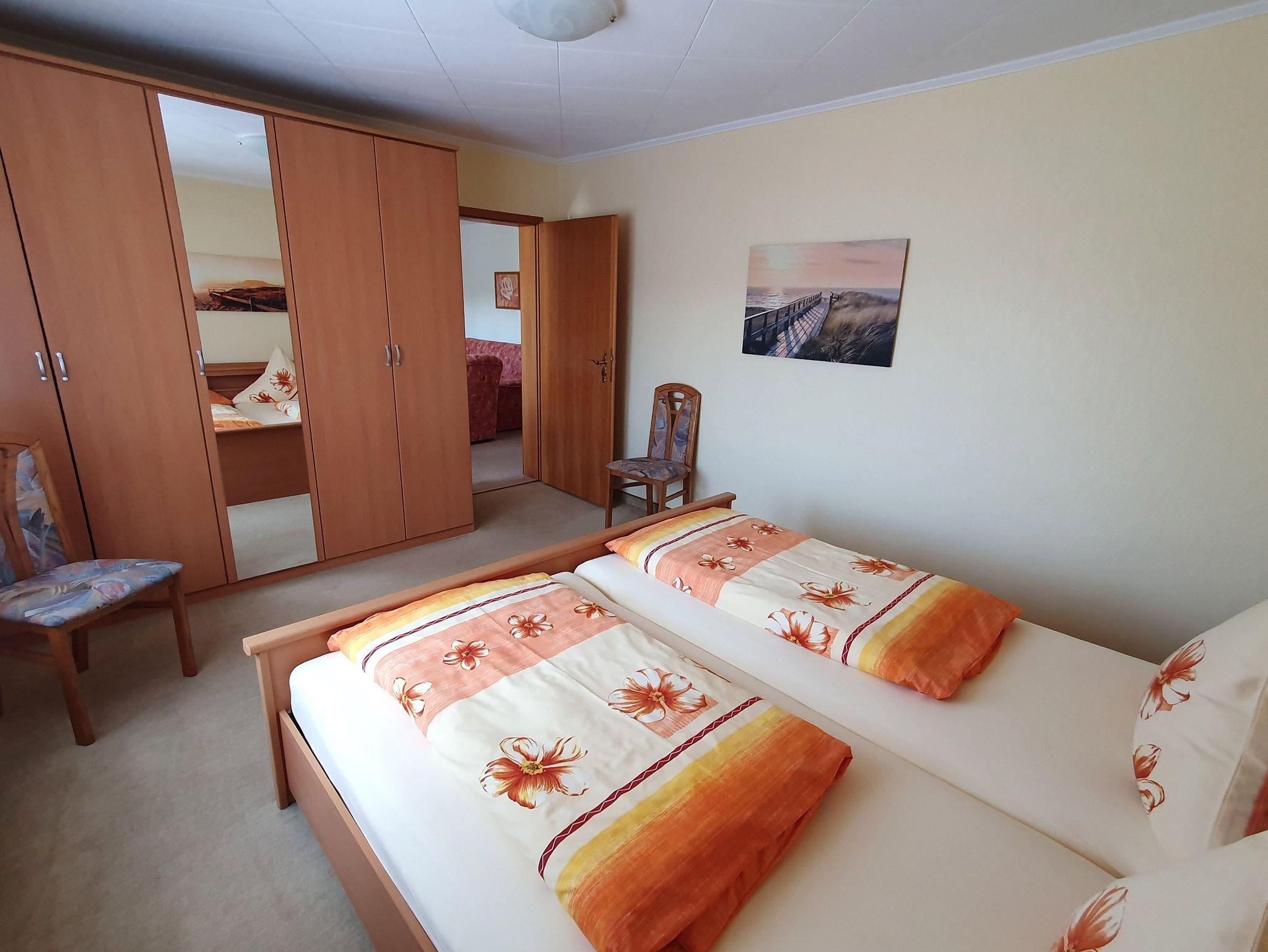 Das Ferienhaus (Nichtraucherwohnung) hat eine Wohnfläche von 70 qm, inkl. Küche sowie Dusche/WC. Es ist ebenerdig, von der Terrasse in den Garten befindet sich eine Treppe mit 5 Stufen. Flur, Bad und Küche sind gefliest, Wohn- und die 2 Schlafzimmer mit Teppichboden ausgelegt. Die Fenster von Bad, Küche und einem Schlafzimmer (1 Doppelbett + Schlafcouch) sind auf der Nordseite, Richtung Südseite befindet sich das Wohnzimmer mit Zugang zur Terrasse und das 2. Schlafzimmer (mit Doppelbett, jeweils 1 x 2 m). Im 3-Bettzimmer befindet sich ein 2. Fernseher.