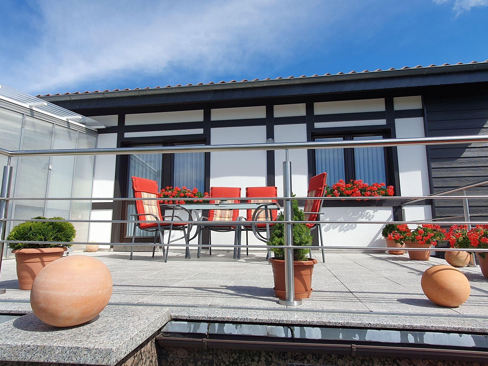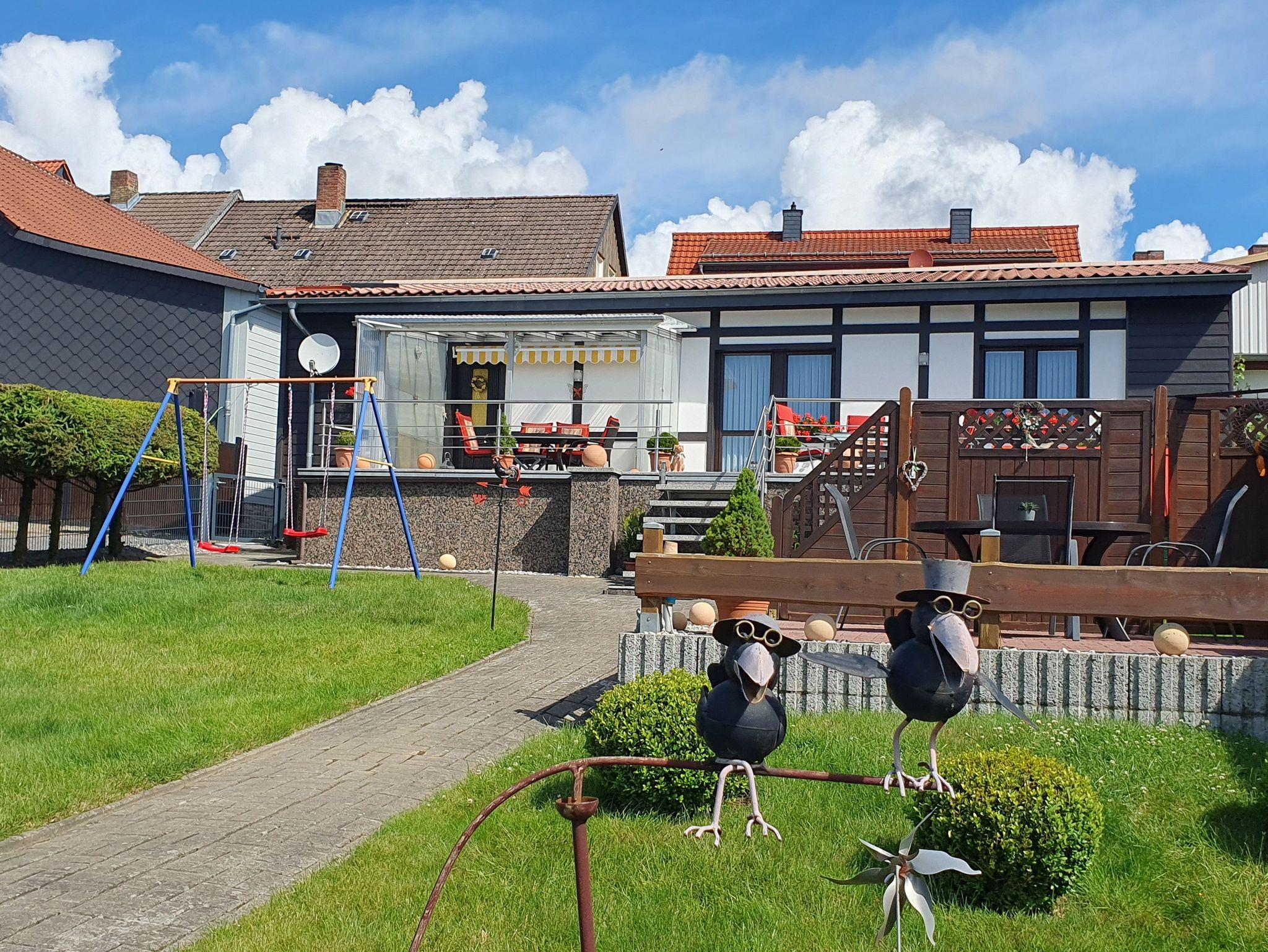 Das Ferienhaus ist ein massiv gebautes, eingeschossiges Haus, zentral beheizt. Es befindet sich oberhalb unseres Gartens in ruhiger Lage. Die große Terrasse (Südseite), mit Gartenmöbel und Grill, ist vom Wohnzimmer direkt zugänglich, man hat einen sehr schönen Blick auf Teile des Ortes und die grünen Hänge der Bergwiesen.