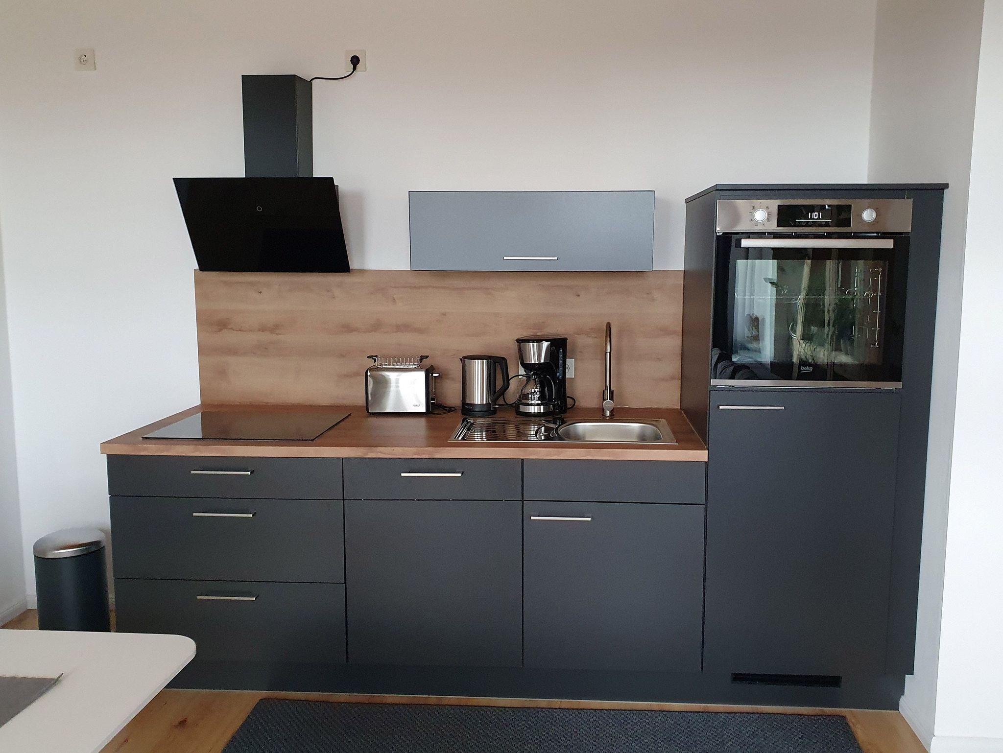 Die helle und offene Gestaltung lädt zum Entspannen ein, während Sie den Komfort einer voll ausgestatteten Küche und einer bequemen und komfortablen Couch genießen. Die Ferienwohnung hat eine Größe von 45 m², wobei der Wohn- und Schlafbereich durch ein offenes Fachwerk getrennt ist. Es erwartet Sie eine Einbauküche mit Ceranfeld und Backofen, Kühlschrank mit Gefriermöglichkeit, Geschirrspüler und Esstisch. Der Schlafbereich ist mit einem Boxspringbett, einem Kleiderschrank und zwei Sessel ausgestattet. Das Bad verfügt über eine Dusche.