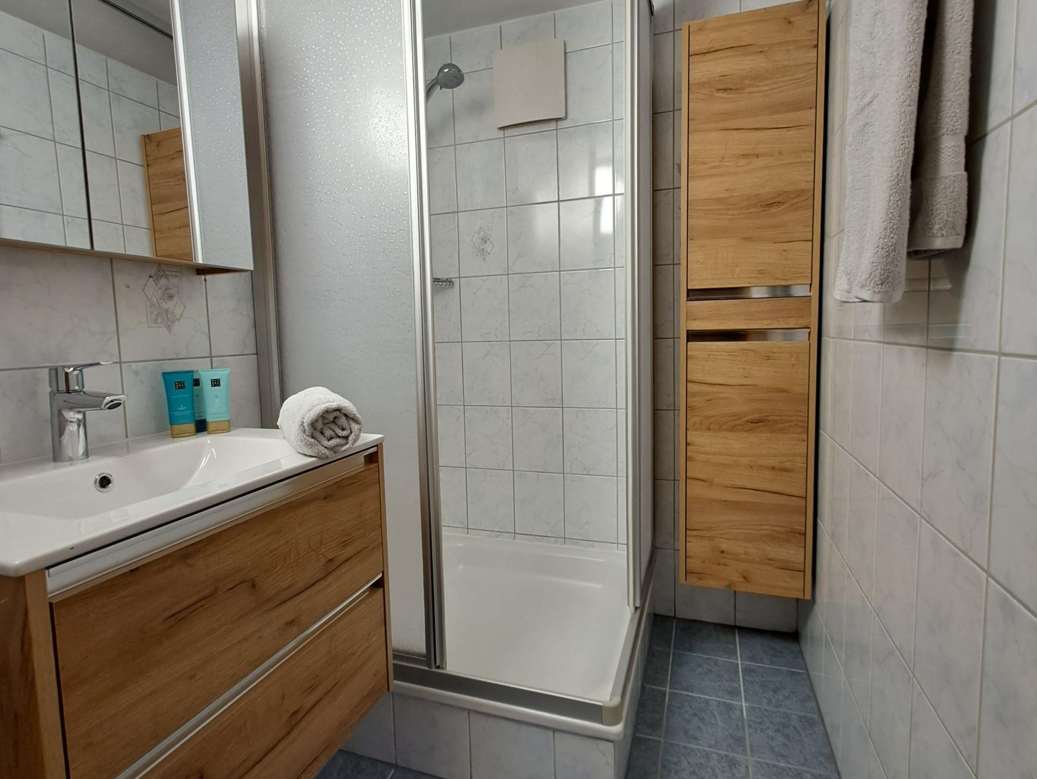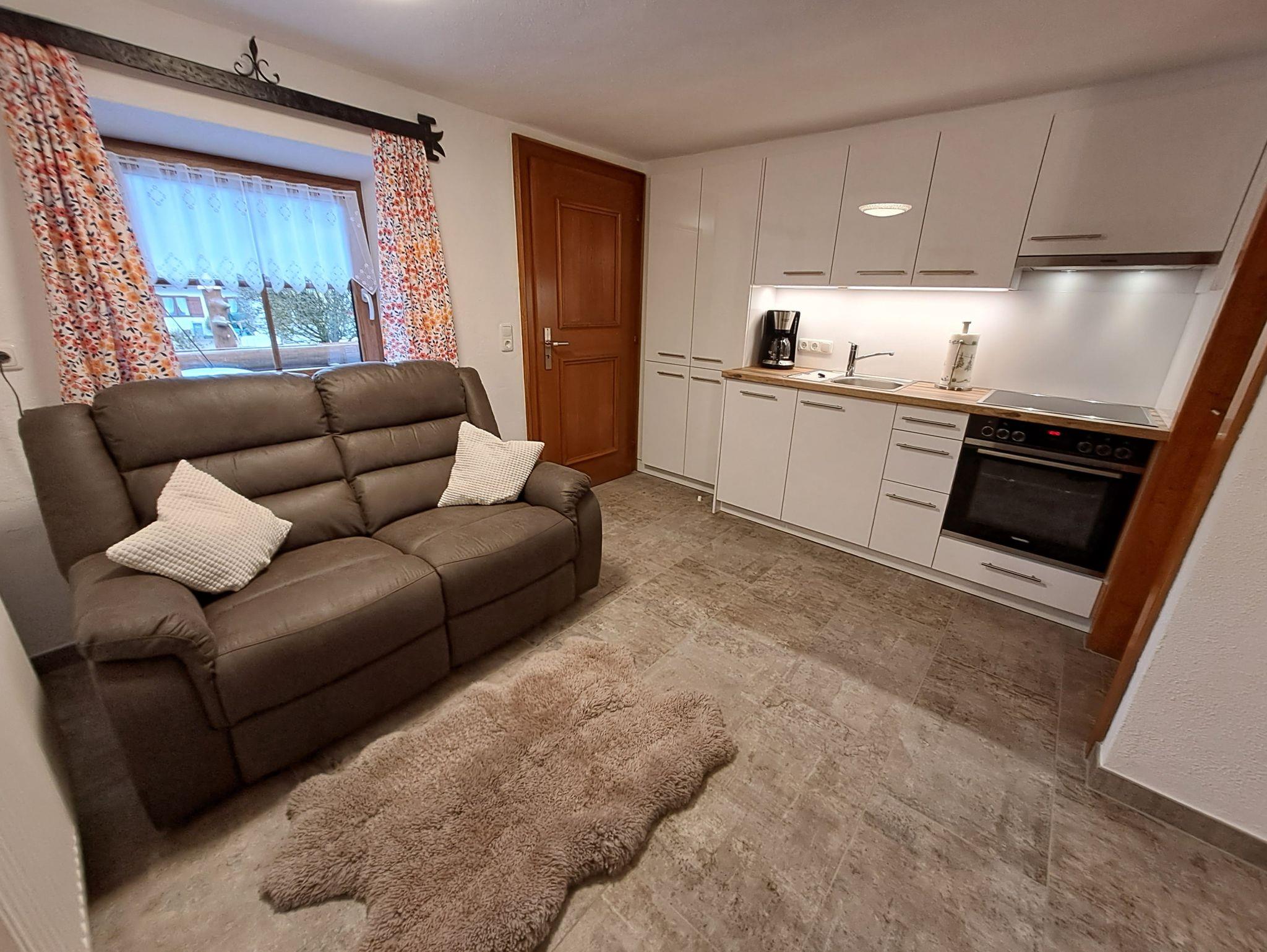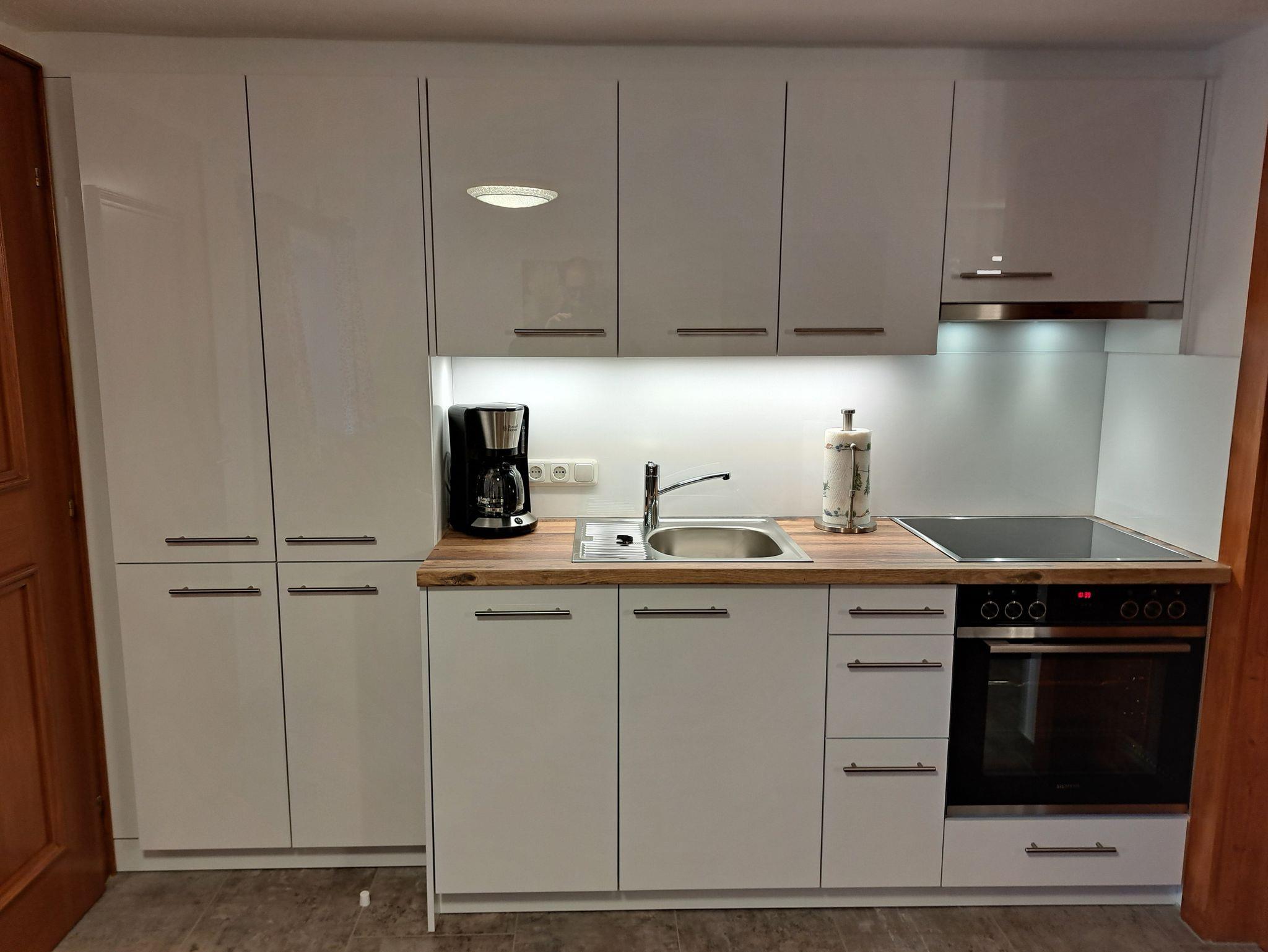 Sie betreten die Wohnung und gelangen in einen kleinen Vorraum, wo sich links das separate WC befindet. Nun betreten Sie die komfortable Wohnküche mit einem Esstisch, einem Relax-Sofa, sowie einer hochwertig ausgestatteten Einbauküche. In der Küche finden Sie eine Spülmaschine, einen E-Herd mit Ceranfeld und Backrohr, Wasserkocher, Kaffeemaschine und Toaster. Kühlschrank mit großem Gefrierabteil. Über die Küche betreten Sie den separaten Duschraum mit Waschbecken und Badmöbeln. Das geräumige, im ländlichen Stil eingerichtete Schlafzimmer ist vom Wohnraum getrennt und lädt zum Ausruhen und Entspannen ein. Auch ein Zustellbett oder ein Babybett würden hier Platz finden. Sämtlicher Service, sowie alle Freizeiteinrichtungen unseres Gästehauses können mitbenutzt werden.
