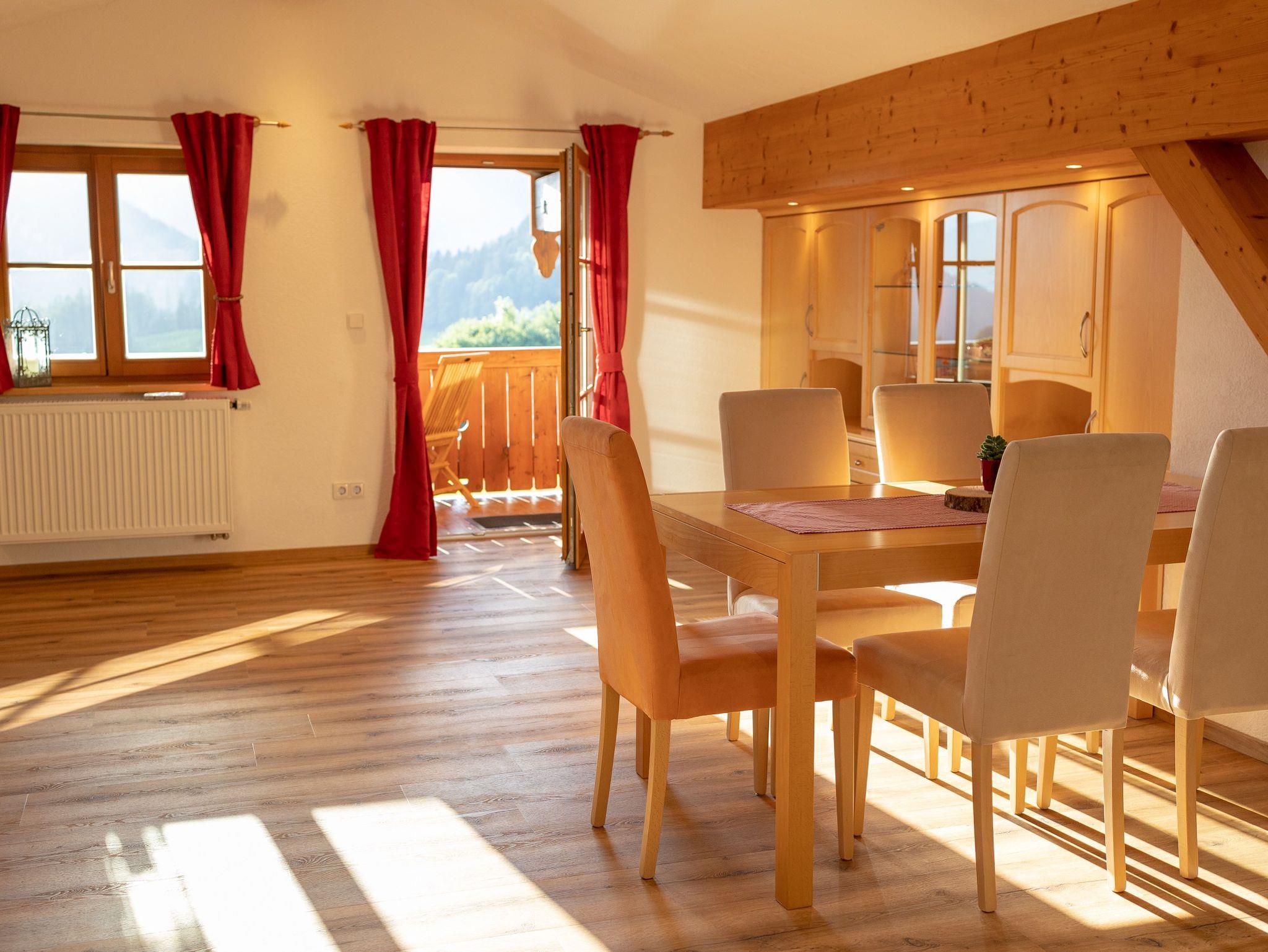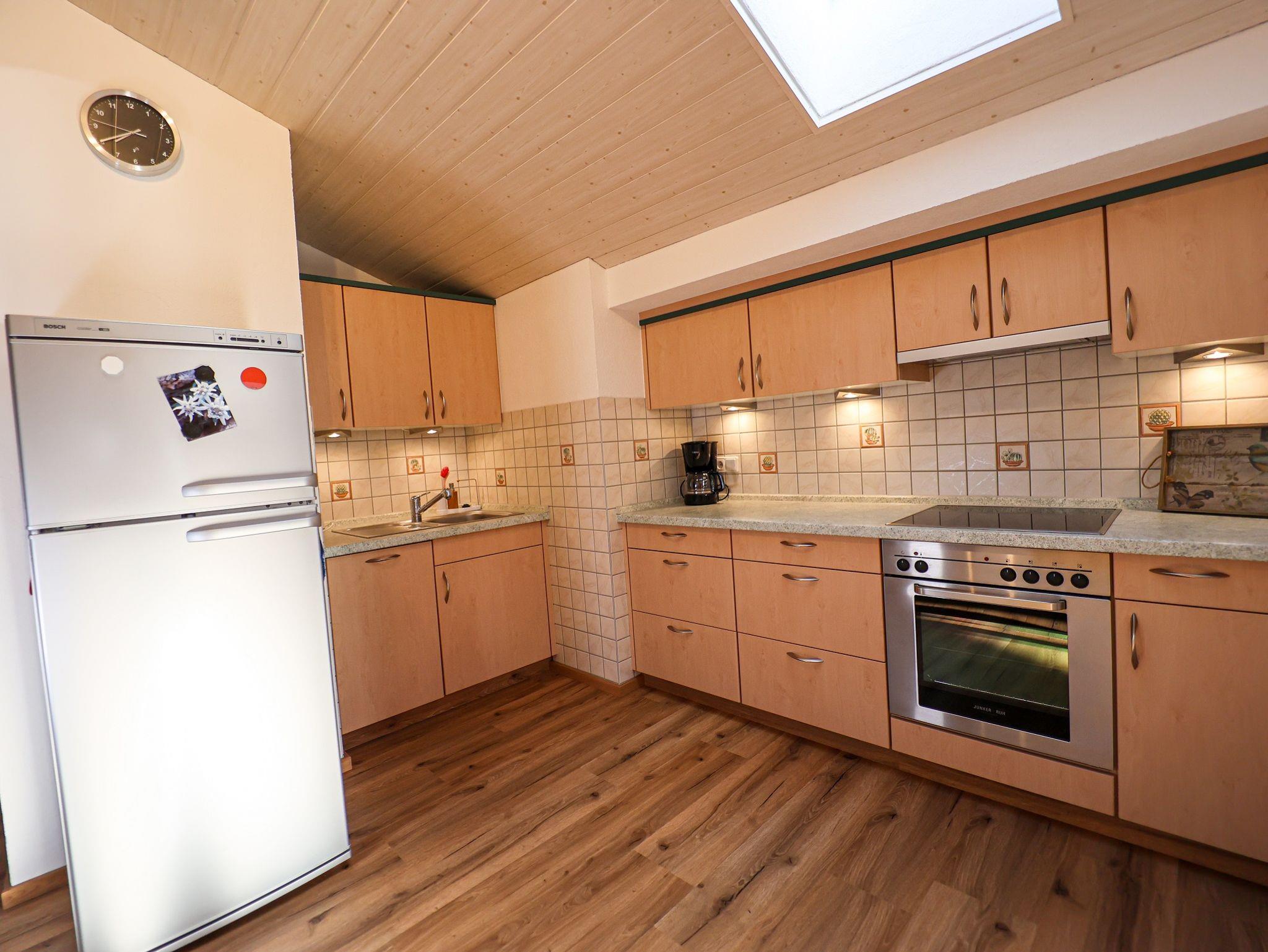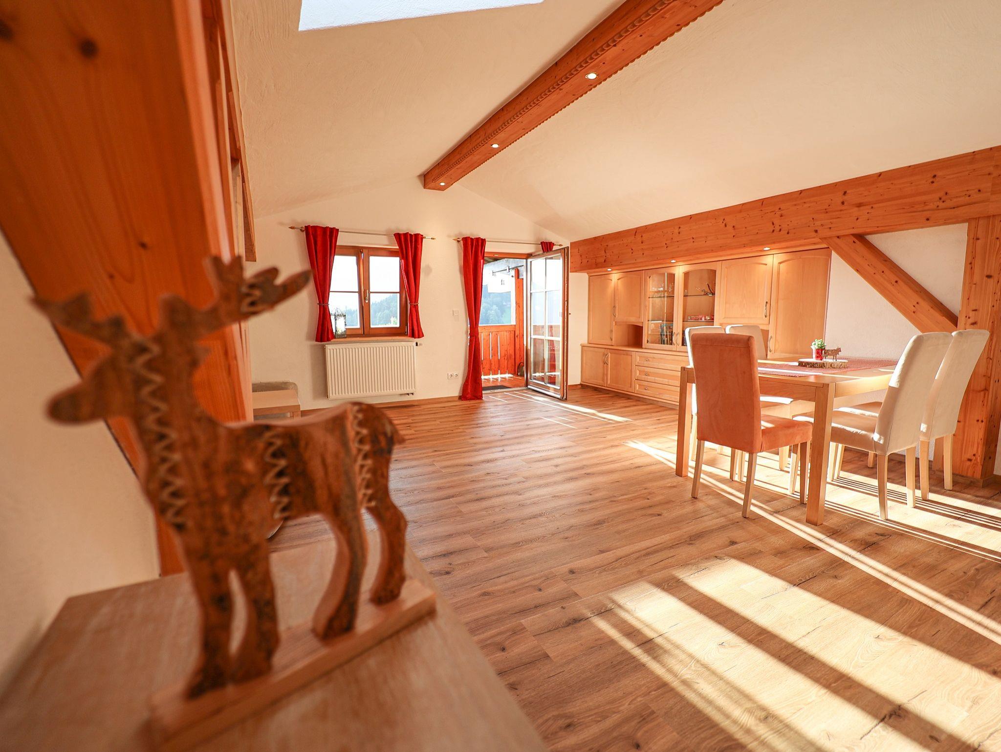Unsere Ferienwohnung Hochthron im Dachgeschoss besteht aus einem sehr großzügigen Wohn-/Essbereich und daran angeschlossener gut ausgestatteter offener Küche mit Geschirrspüler, Backofen, Kaffeemaschine und geräumigen Kühlschrank mit Gefrierfach.