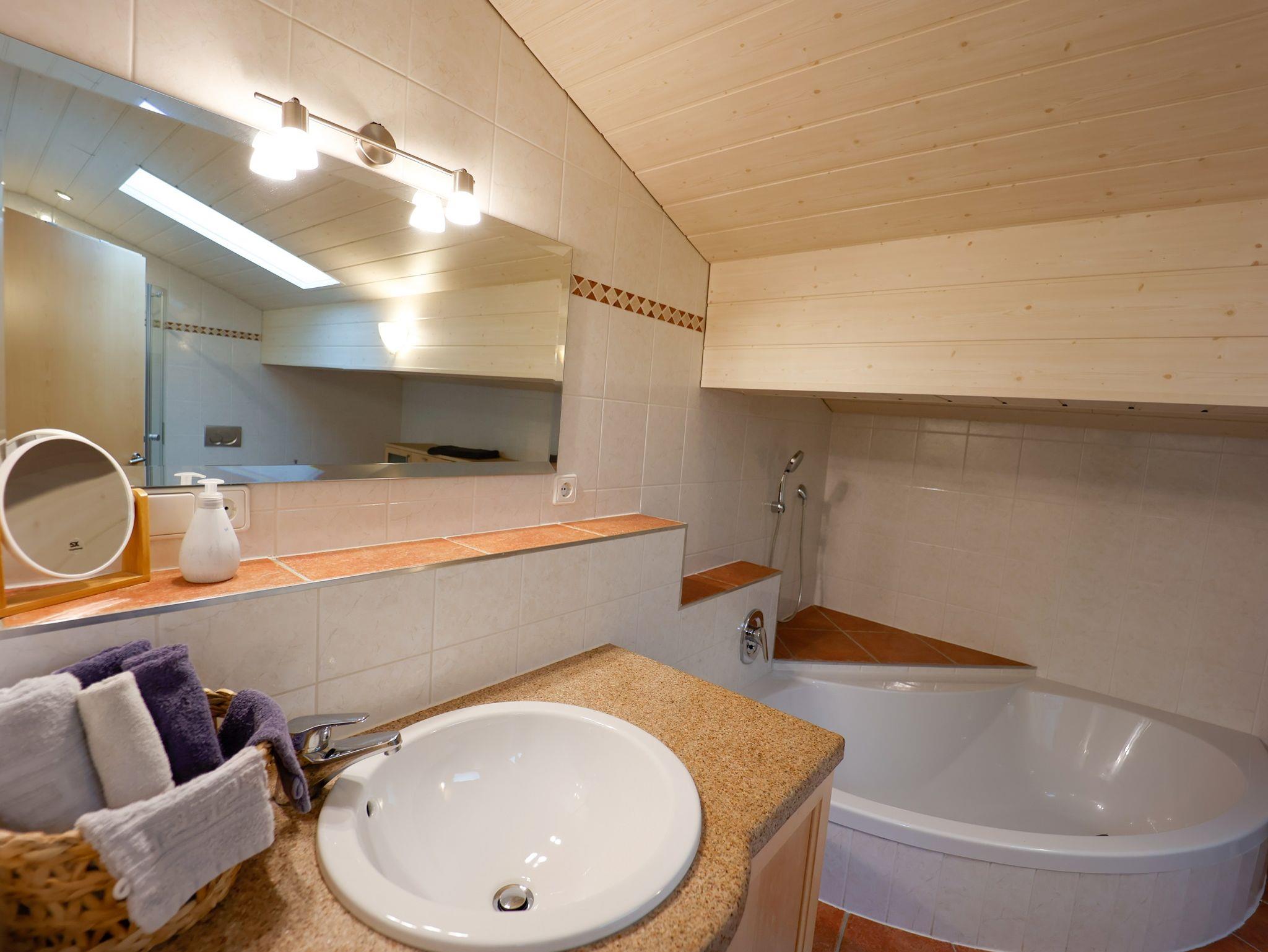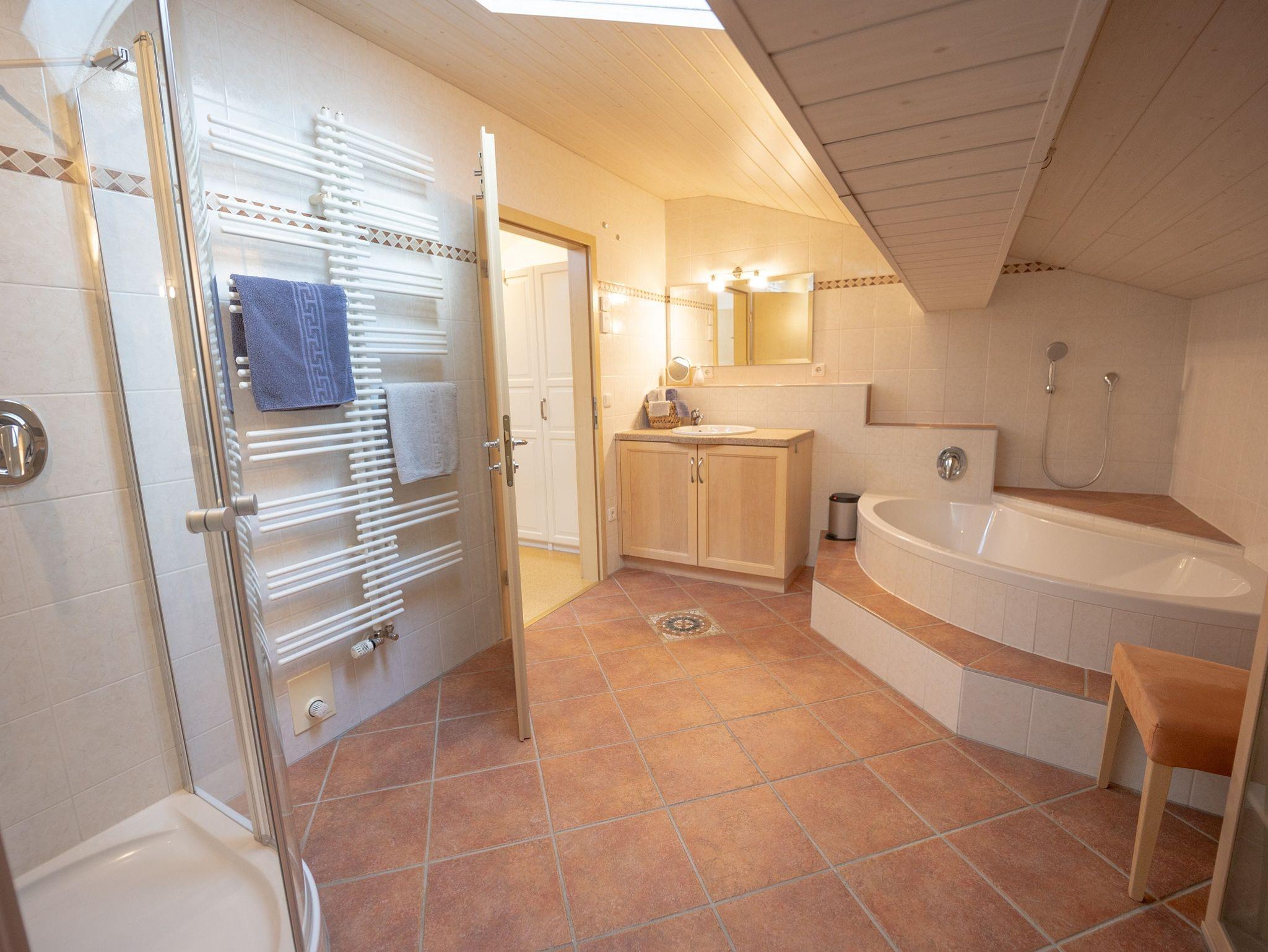 Auch das Badezimmer mit Dusche und großer Eckbadewanne bietet optimale Entspannung und Erholung