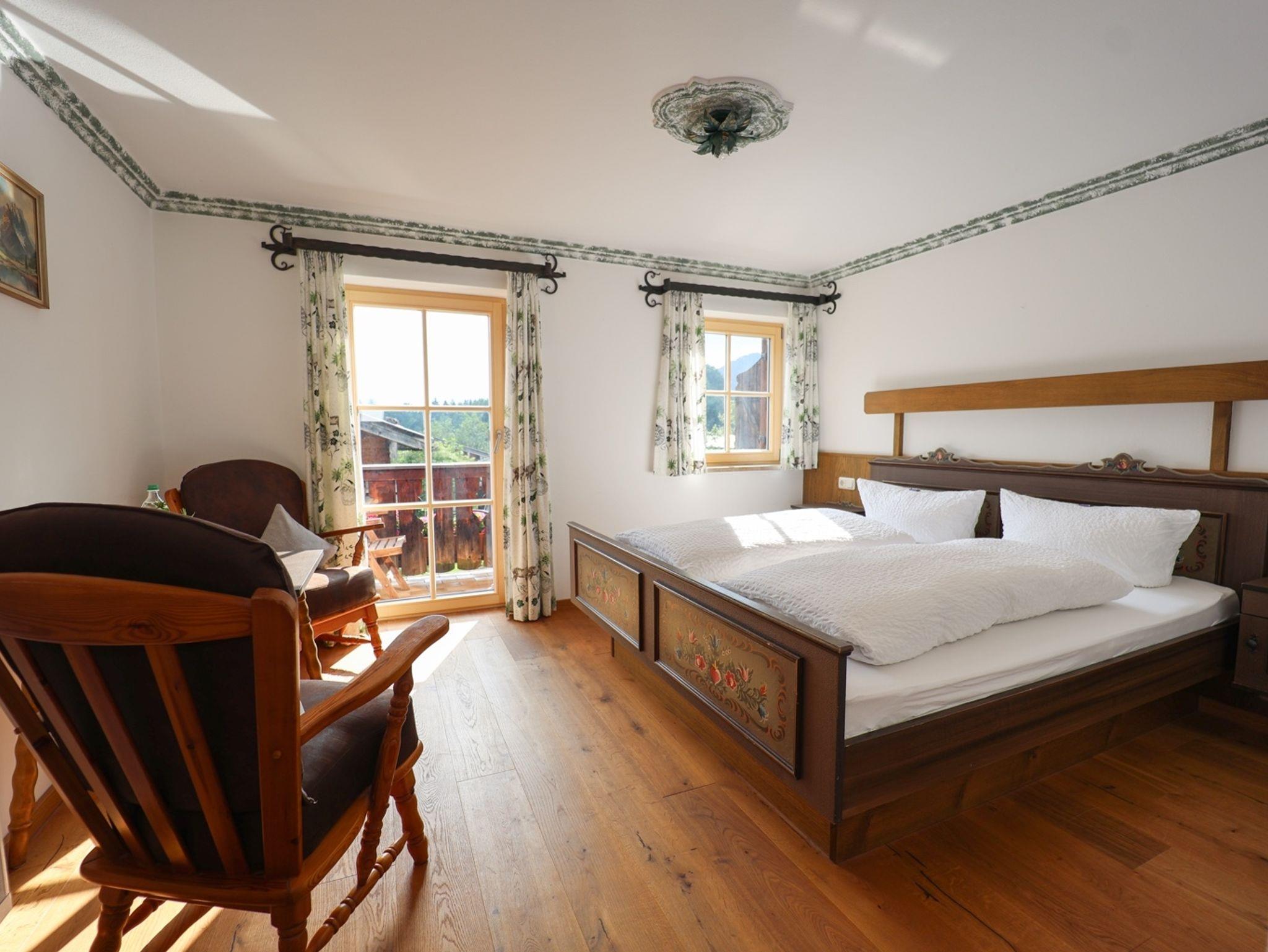 Gemütliches Doppelzimmer mit Balkon und herrlichem Bergblick.