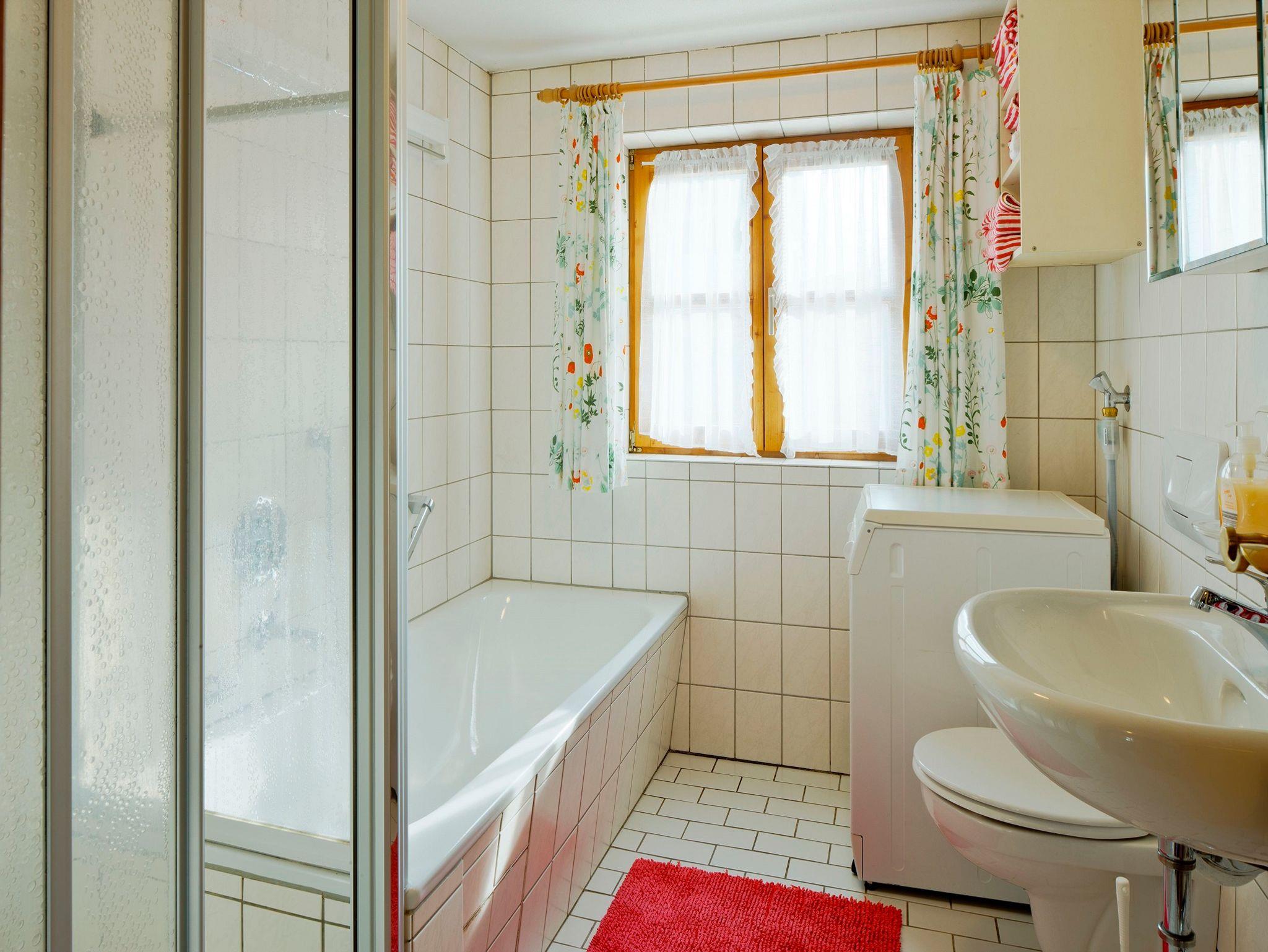 • Badezimmer mit Dusche, Spiegelschrank, Föhn, Waschbecken, Toilette und Waschmaschine (kostenlose Nutzung). Wäsche