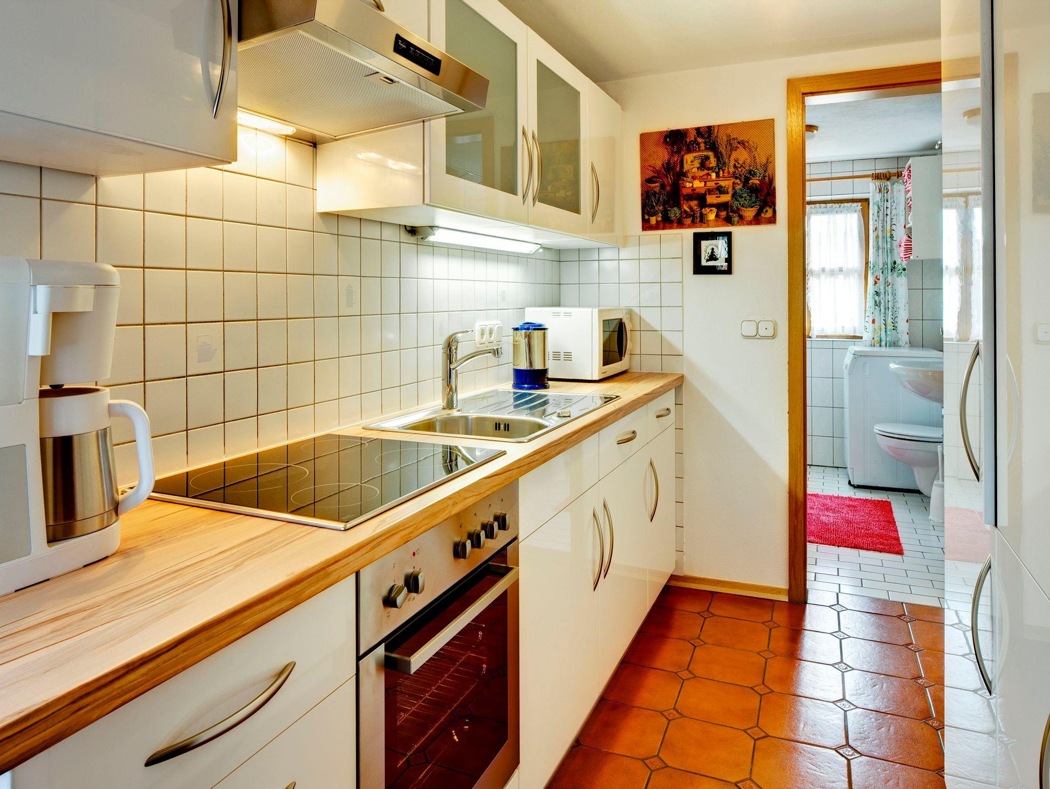 • Küche mit komplett ausgestattetem Küchenblock: Kühlschrank mit Gefrierfach, Herd mit Ceranfeld (vier Kochstellen) und
