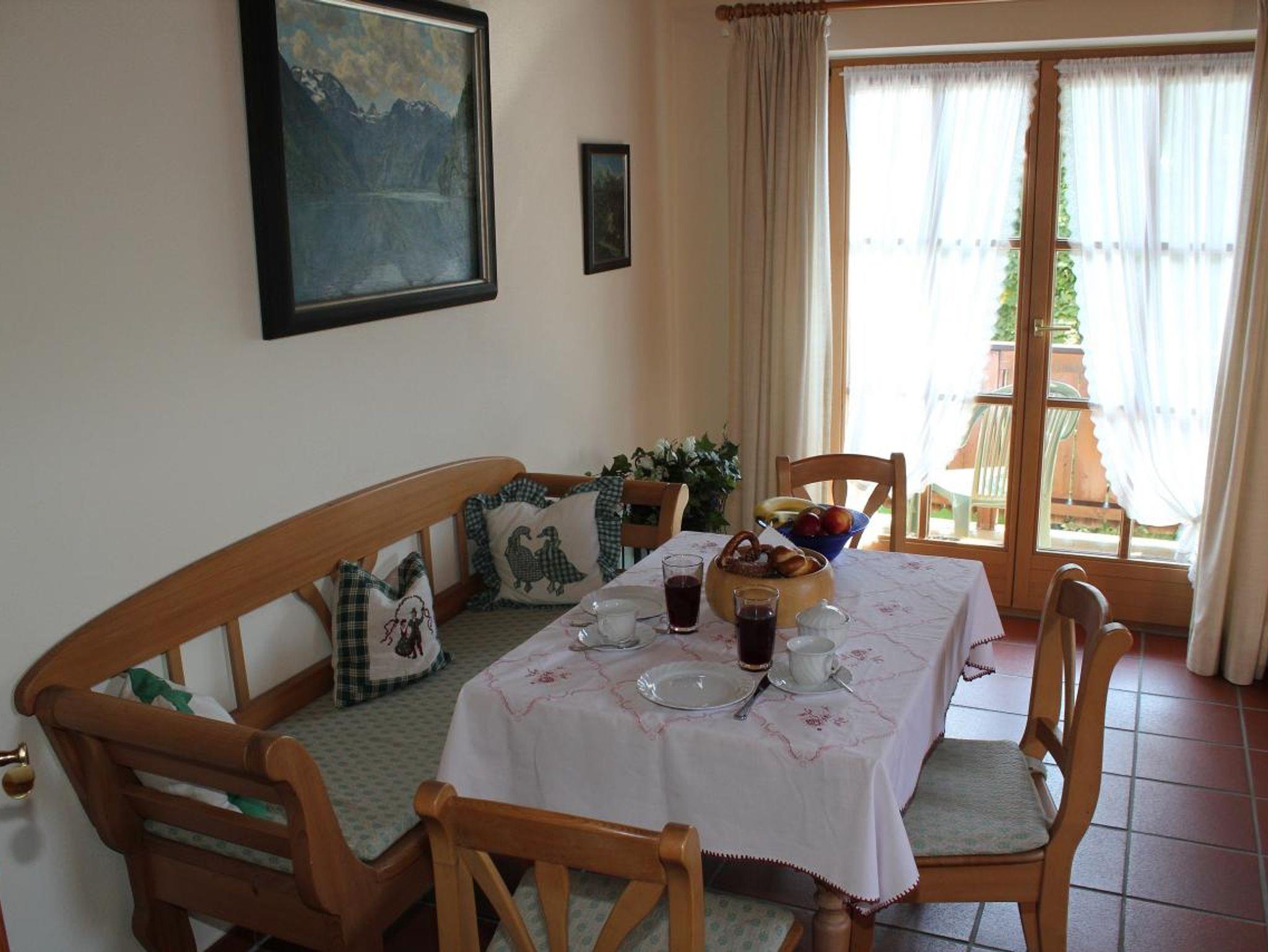 Auf 65qm sind die Räume ideal angeordnet: 1 Schlafzimmer mit Doppelbett, das groß genug ist, um evtl. ein Kinderbettchen aufzustellen; das Wohnzimmer ist ein Mehrfunktionsraum mit ausziehbarer (Doppelliege-)Couch, 2 bequemen Sesseln und Tisch (kann also auch als 2. Schlafzimmer verwendet werden) außerdem bieten eine weitere Sitzbank, Stühle und Esstisch den idealen Rahmen für ein ausgiebiges Frühstück oder das Essen in der Familienrunde. In der kleinen Küche ist voll ausgestattetmiteinem kleinen Essplatz für das Frühstück. Das Bad ist kombiniert mit Dusche und WC und ist großzügig mit Schränken und Ablagen, sowie Fön und Kosmetikspiegel ausgestattet. Die Zimmer liegen zur Südseite und vom großen Balkon ist der Blick auf den Watzmann genau das, was man sich von einem Urlaub in Berchtesgaden erwartet. Hier können Sie den ganzen Tag auf Liegen oder Gartenmöbeln die Sonne genießen, hören das Rauschen der Königsseer Ache und blicken auf die sattgrünen Kastanienbäume im Garten.