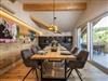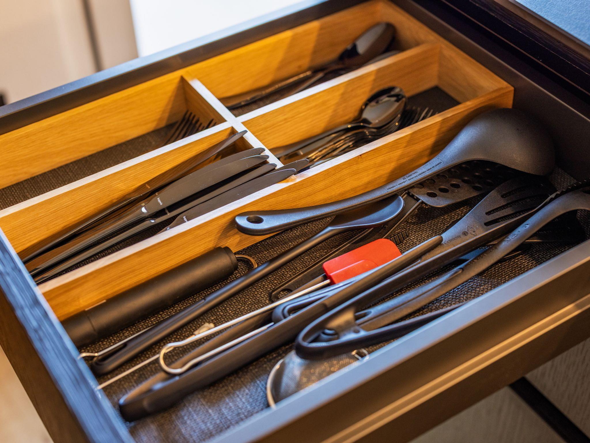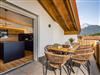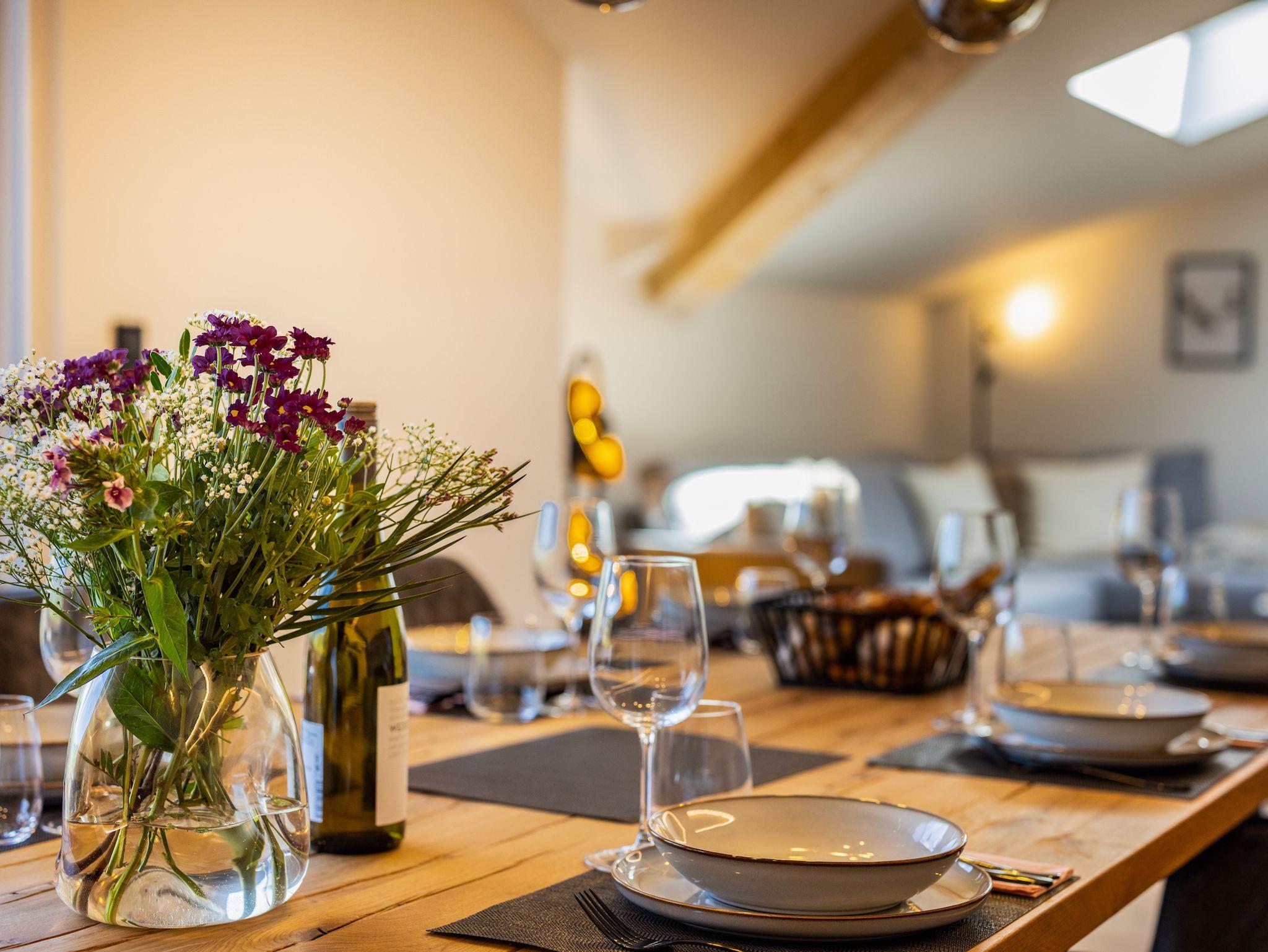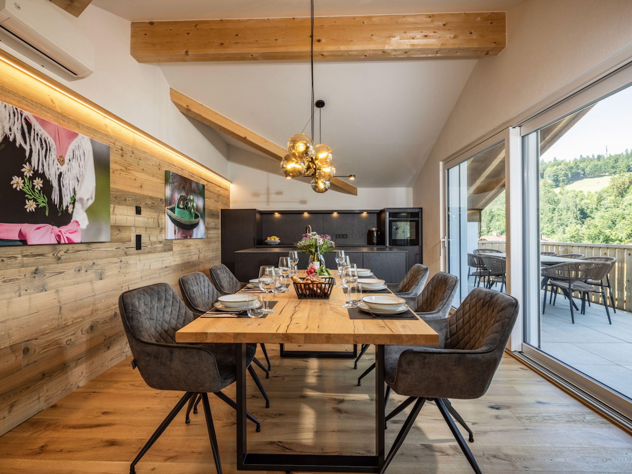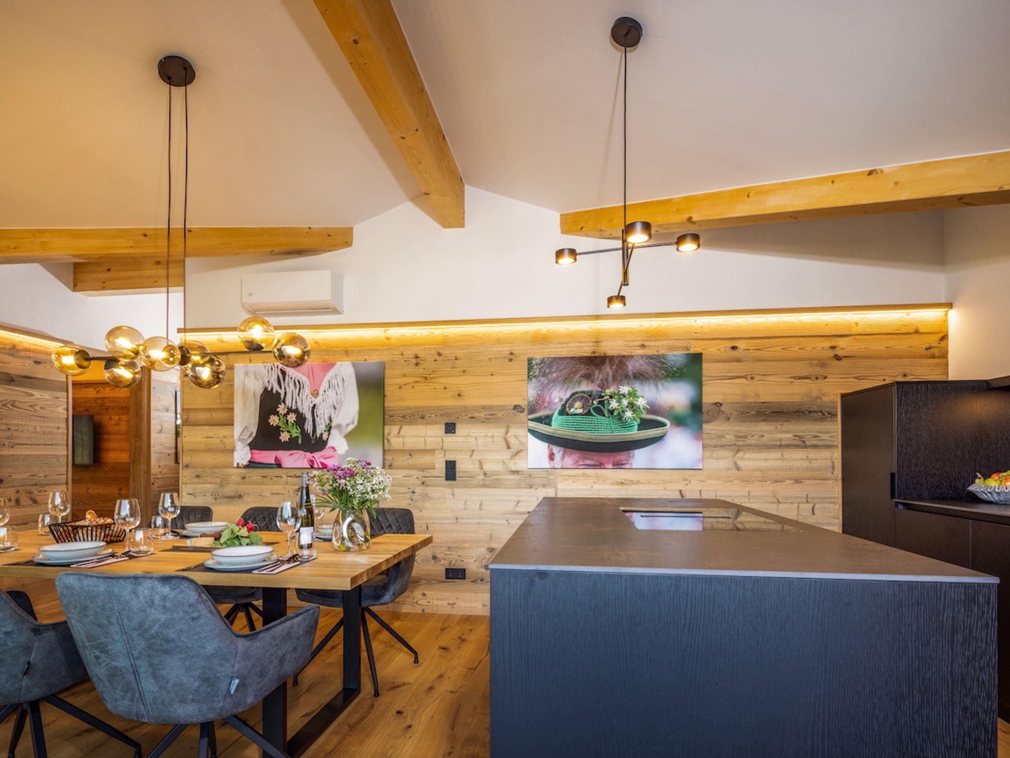 Die offene, hochwertig ausgestattete Küche lässt das Herz aller Hobby-Köche höherschlagen. Ein moderner freistehender Küchenblock mit Induktionskochfeld lädt zum gemeinsamen Kochen ein, während ein Backofen und eine Coffee-B-Kaffeemaschine den Komfort perfekt abrunden. Ob schneller Espresso am Morgen oder ein festliches Menü am Abend – hier bleiben keine Wünsche offen. Am großzügigen Massivholz-Esstisch finden alle Gäste Platz – ein zentraler Ort für genussvolle Mahlzeiten und gesellige Momente.