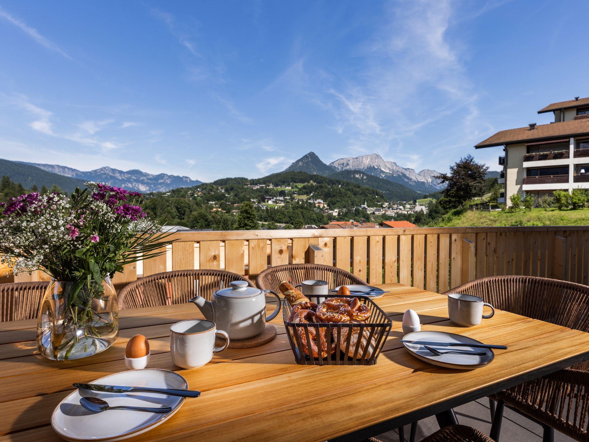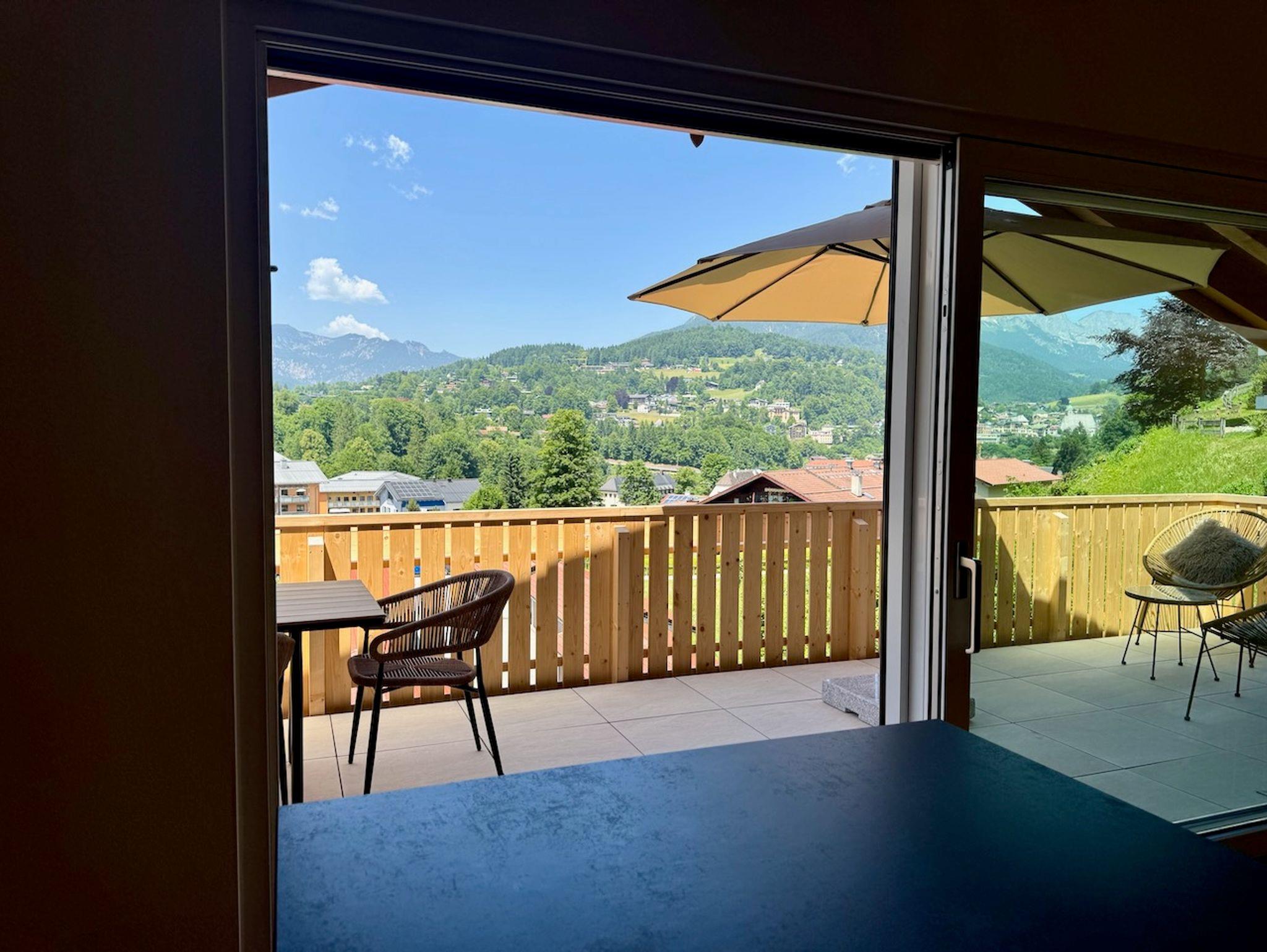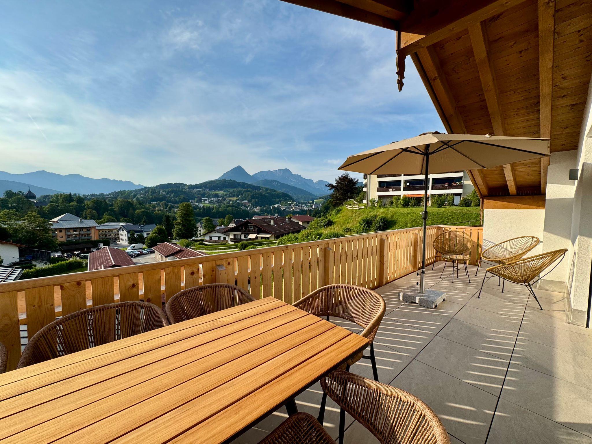 Zwei großzügige Balkone laden Sie ein, die Schönheit der Berchtesgadener Bergwelt in vollen Zügen zu genießen – und das zu jeder Tageszeit. Am Morgen begrüßt Sie die Sonne auf dem Frühstücksbalkon, der direkt von beiden Schlafzimmern zugänglich ist. Dort genießen Sie den ersten Kaffee mit einem traumhaften Blick auf die erwachenden Alpen. Auf dem zweiten Balkon bietet sich Ihnen ein beeindruckendes Panorama, das sich vom majestätischen Gipfel des Watzmanns über das eindrucksvolle Alpenmassiv bis hinunter zur charmanten Berchtesgadener Altstadt erstreckt. Hochwertige Lounge- und Sitzmöbel sorgen dafür, dass sie ganz entspannt einen sonnigen Nachmittag genießen und sich auf einen grandiosen Blick auf den Sonnenuntergang freuen können – ob entspannt mit einem Buch, beim Glas Wein oder in geselliger Runde.
