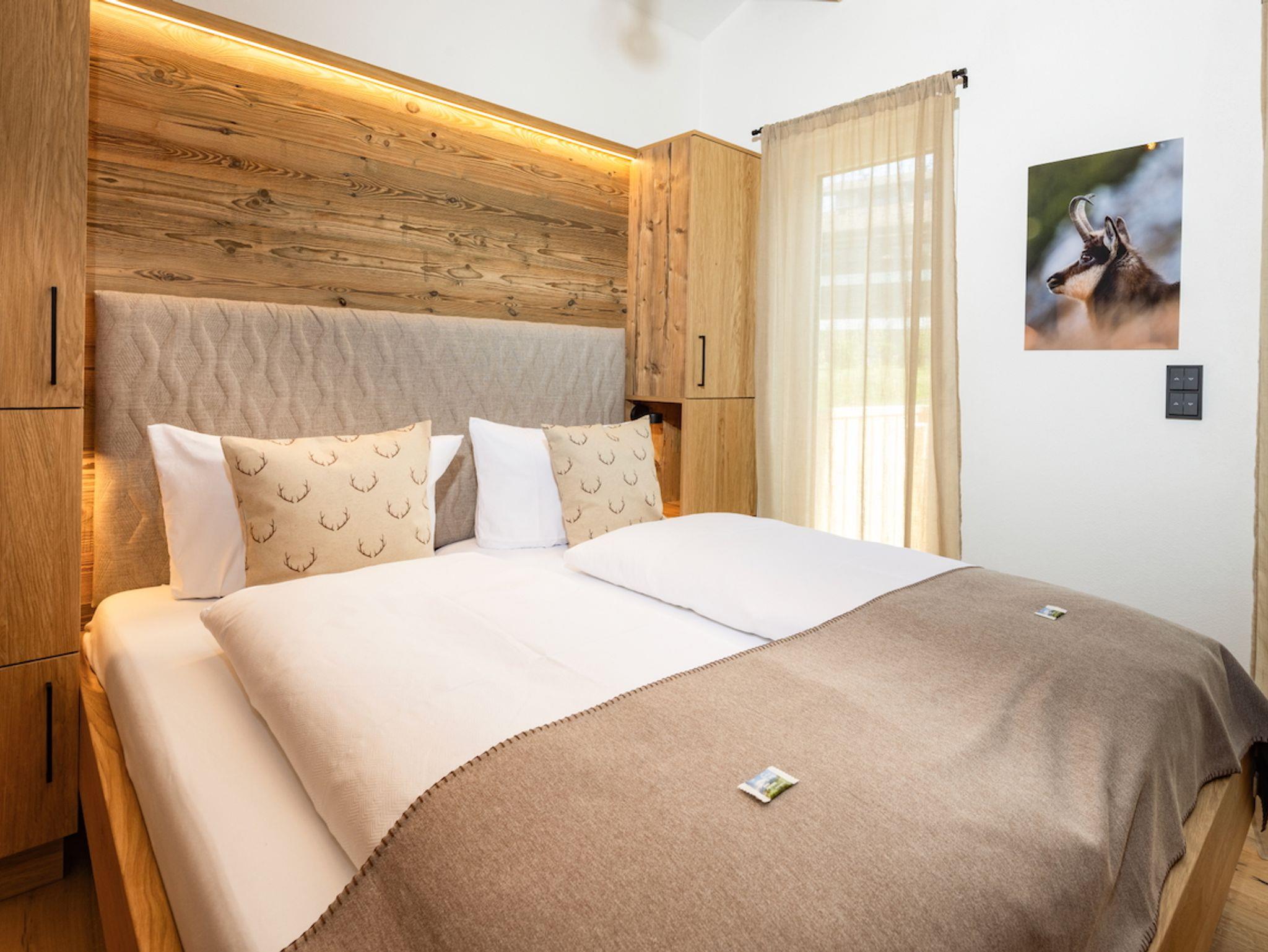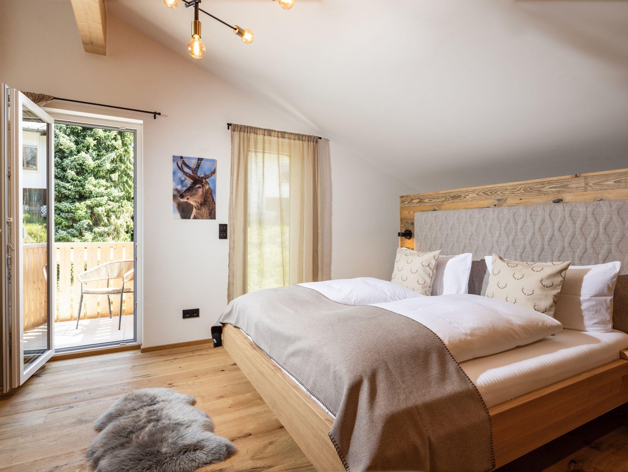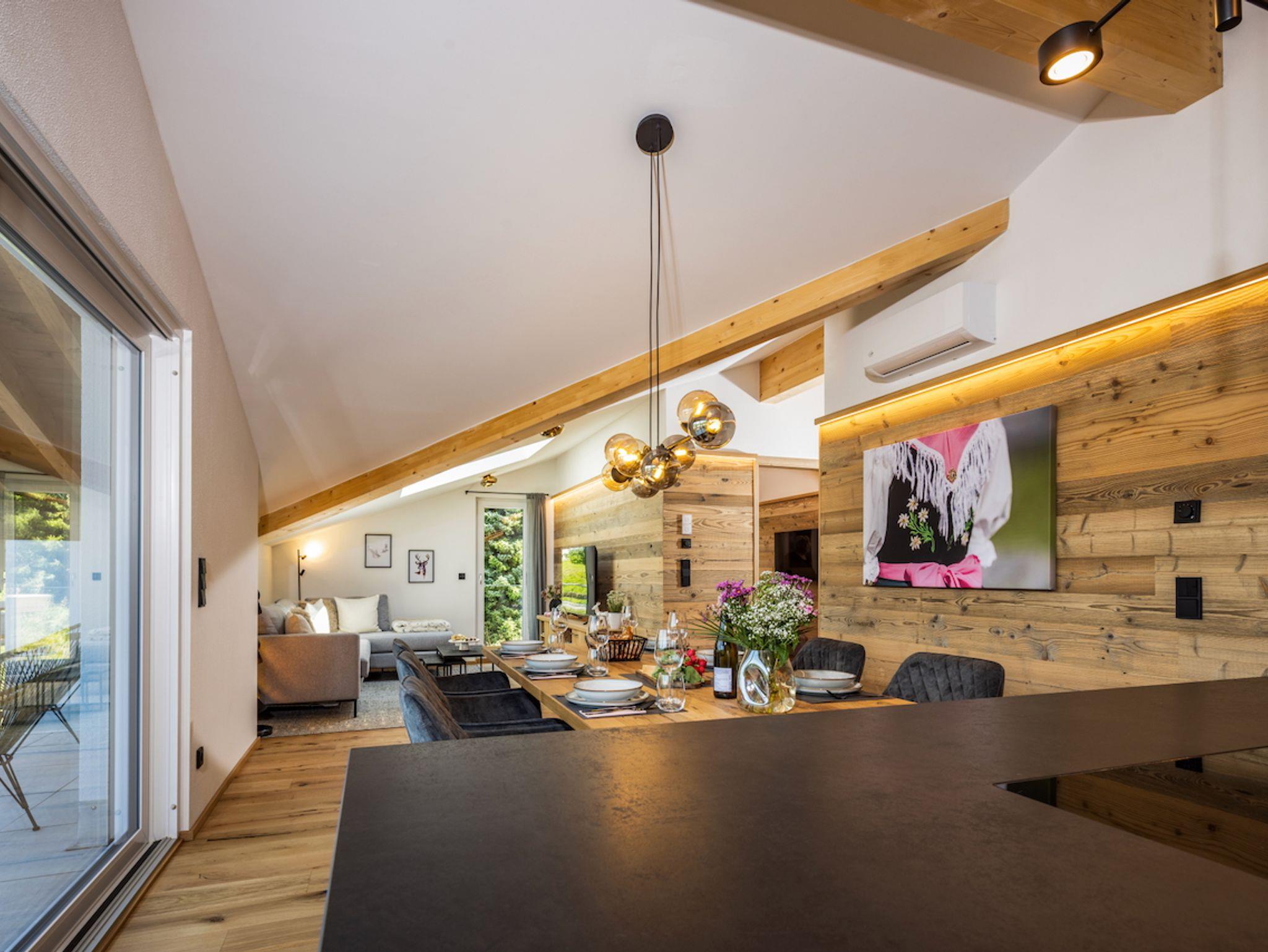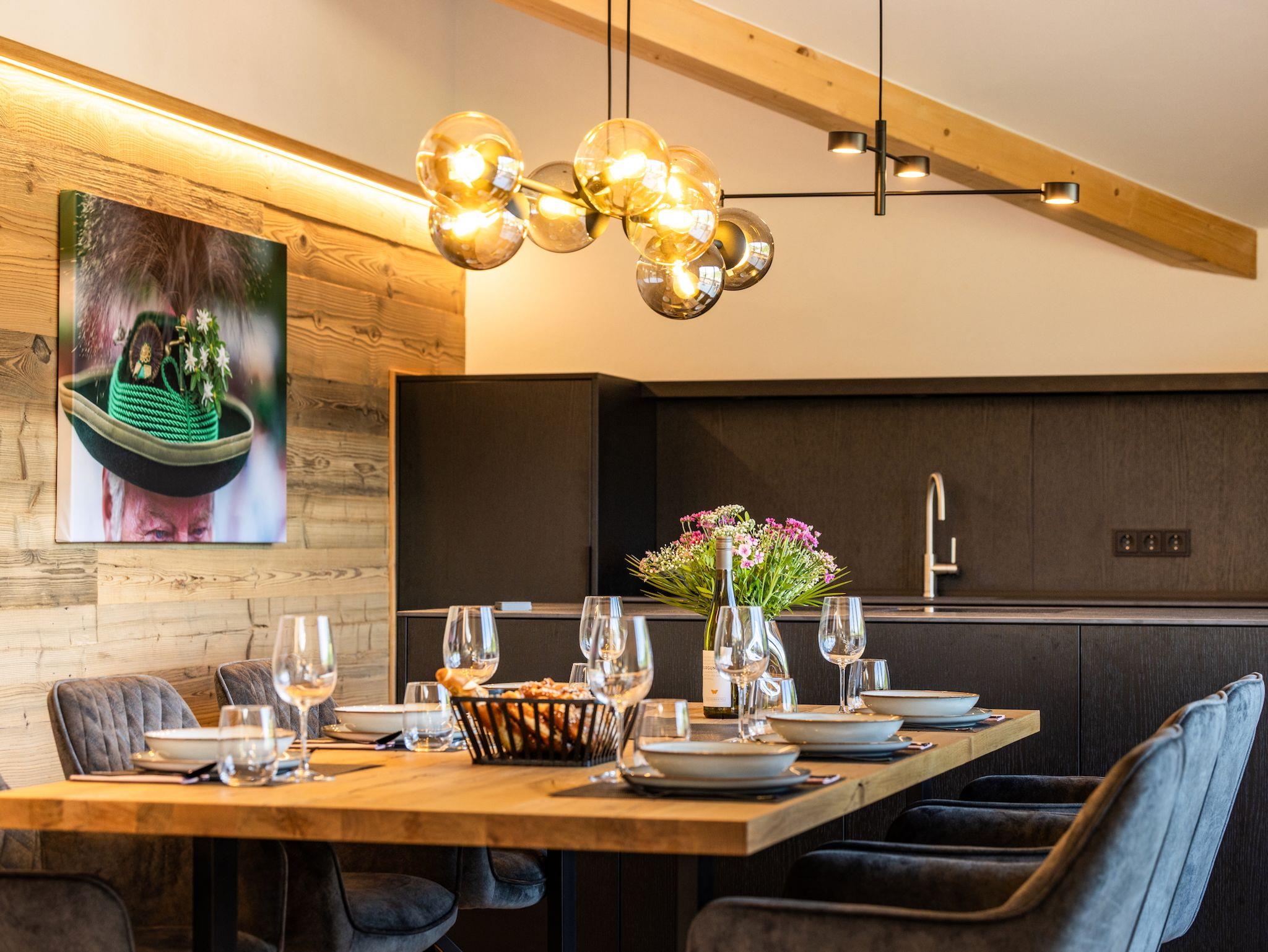 Die Ferienwohnung Das Gipfelglück ist sehr großzügig geschnitten, klimatisiert und bietet mit zwei Schlafzimmern, zwei Balkonen sowie einem offenen Wohn- und Essbereich viel Raum für Erholung und gemeinsame Zeit. Hohe Decken sorgen für ein luftiges Raumgefühl, während Wandvertäfelungen aus Altholz und liebevoll ausgewählte Dekoration eine warme, stilvolle Atmosphäre schaffen. Die hochwertige Innenausstattung und die Liebe zum Detail spiegeln sich in jedem Bereich der Wohnung wider. Das Gipfelglück ist neu im eleganten Chalet-Design mit alpinem Charme eingerichtet – mit natürlichen Materialien, maßgefertigten Echtholzmöbeln und ausgesuchten Wohnakzenten.