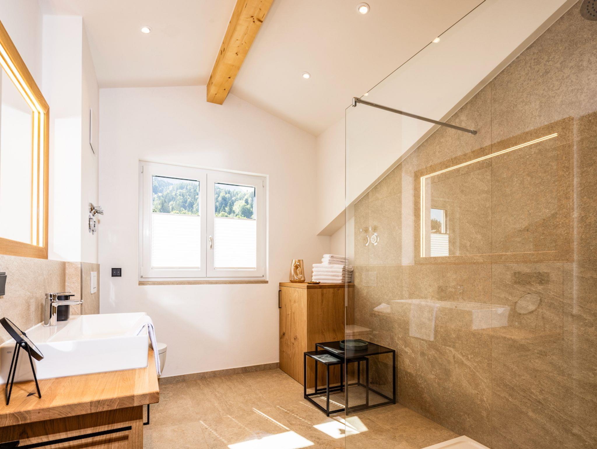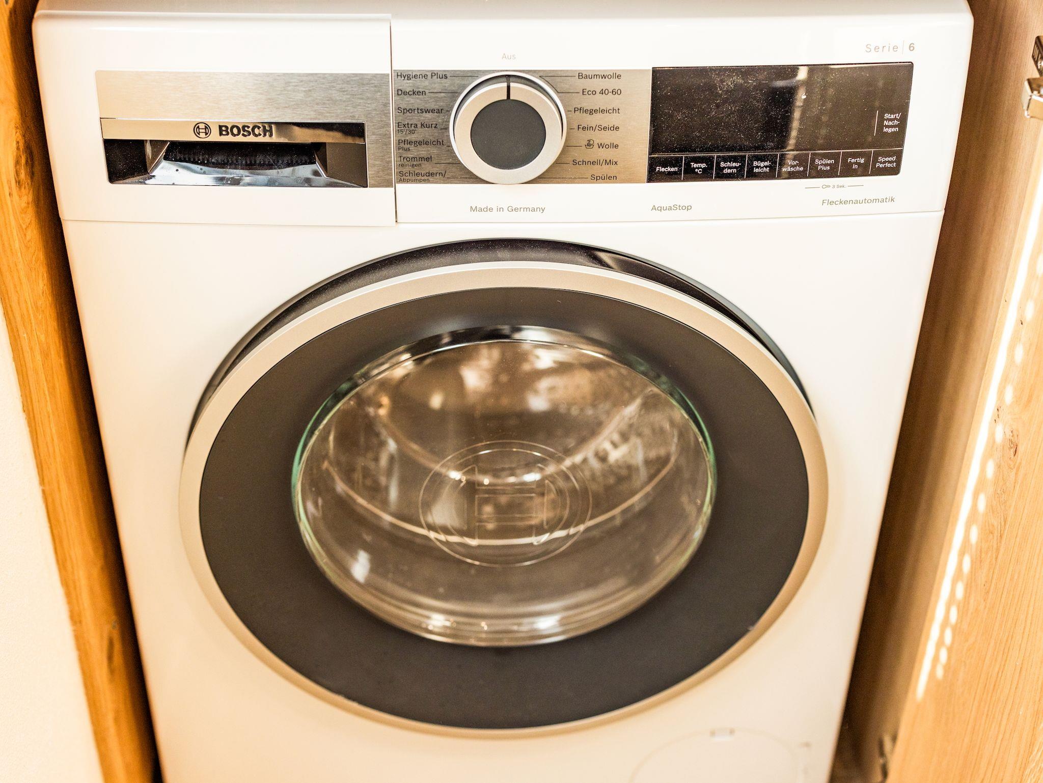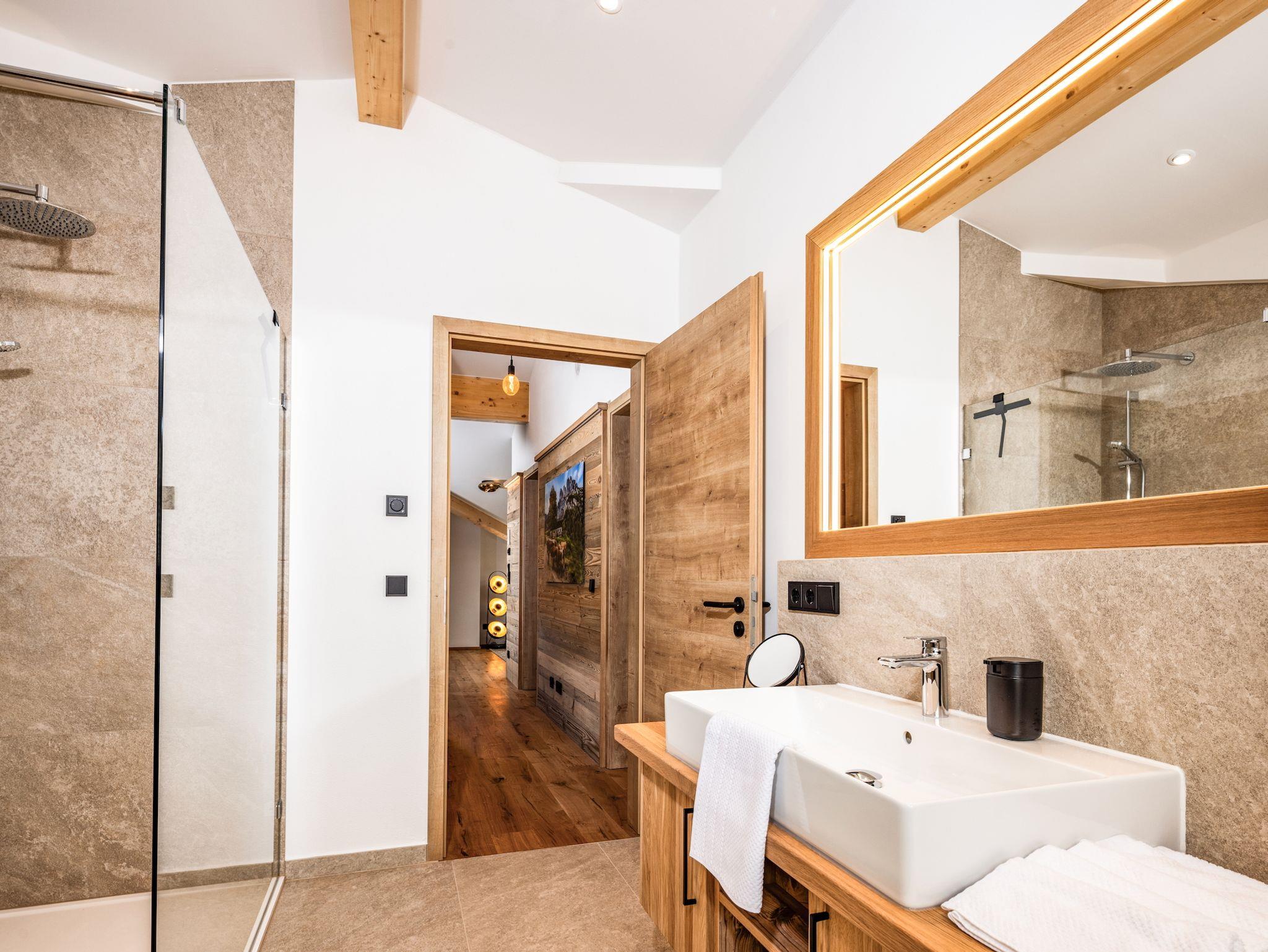 Eine sehr geräumige Walk-in Dusche lädt Sie zum ausgedehnten Start oder Abschluss Ihres Urlaubstags im Gipfelglück ein. Eine diskret eingebaute Waschmaschine sorgt zudem dafür, dass Ihre Urlaubswäsche auch immer frisch bleibt.