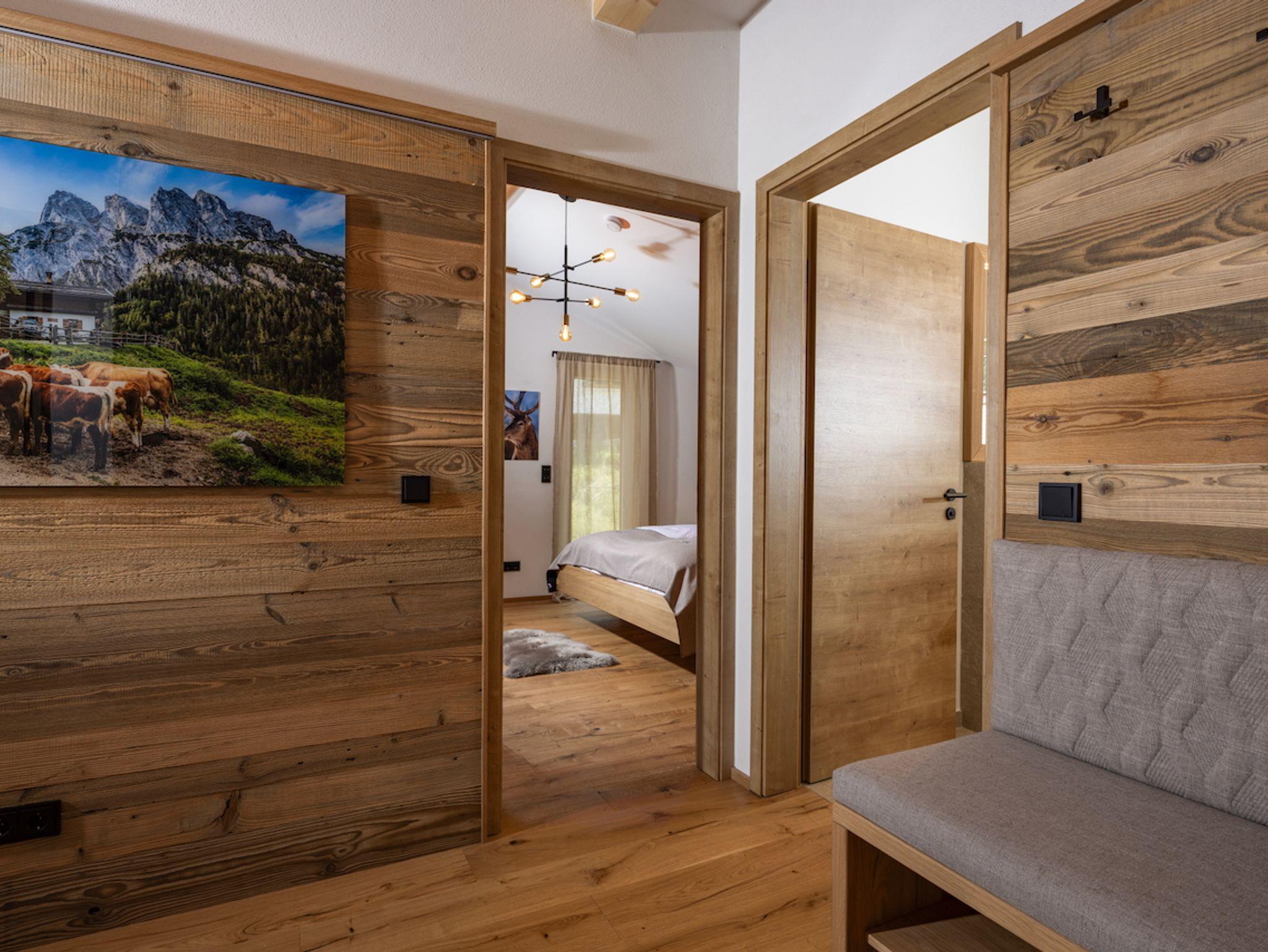 Im gesamten Wohn- und Schlafbereich vermittelt ein hochwertiger Parkettboden in massiver Eiche rustikal ein behagliches Raumgefühl. Im Bad sorgen großformatige Fliesen für eine alpine Wellness-Atmosphäre.