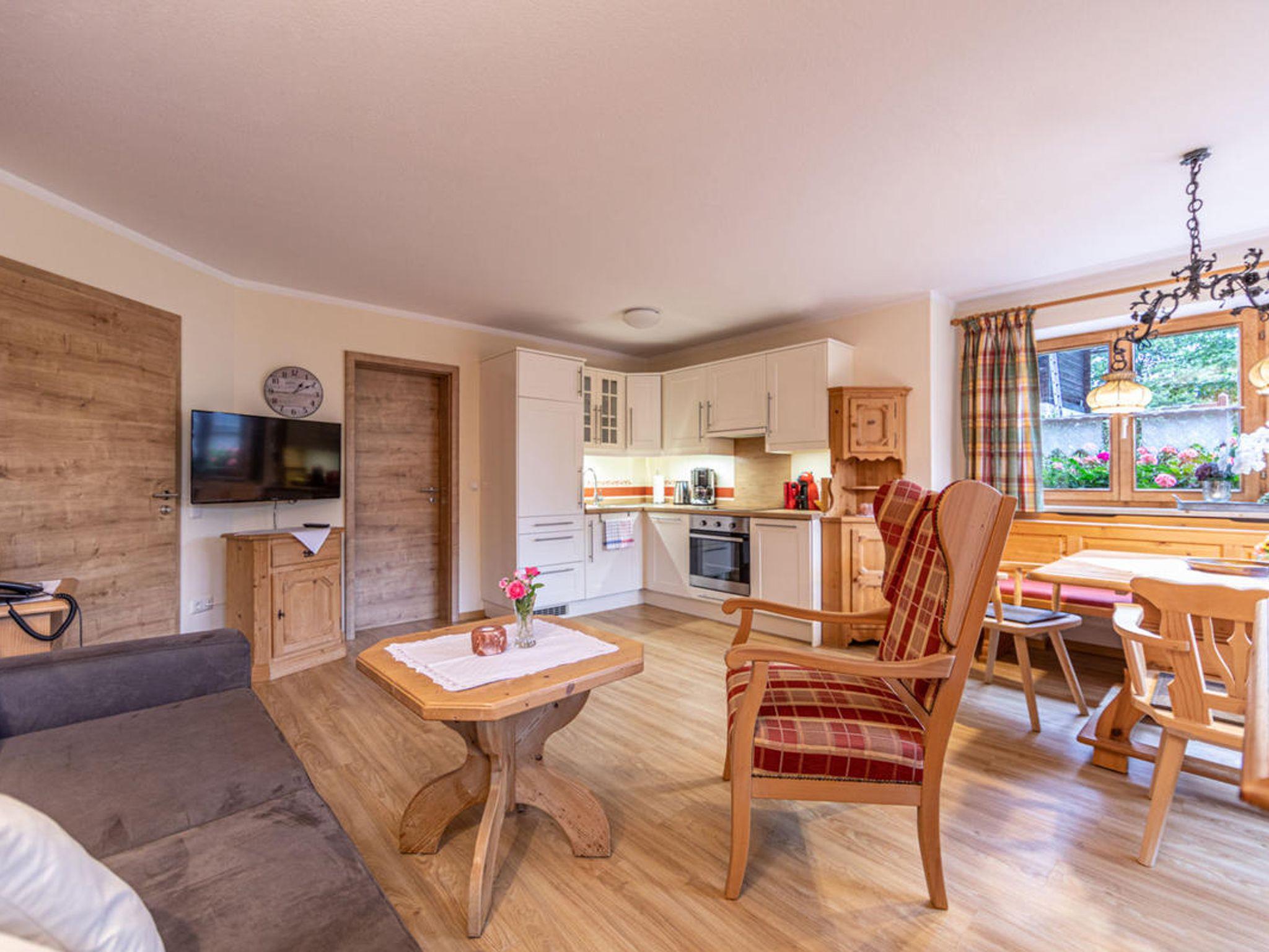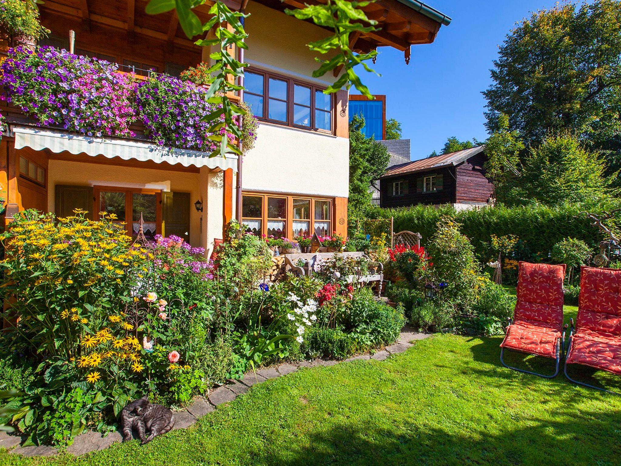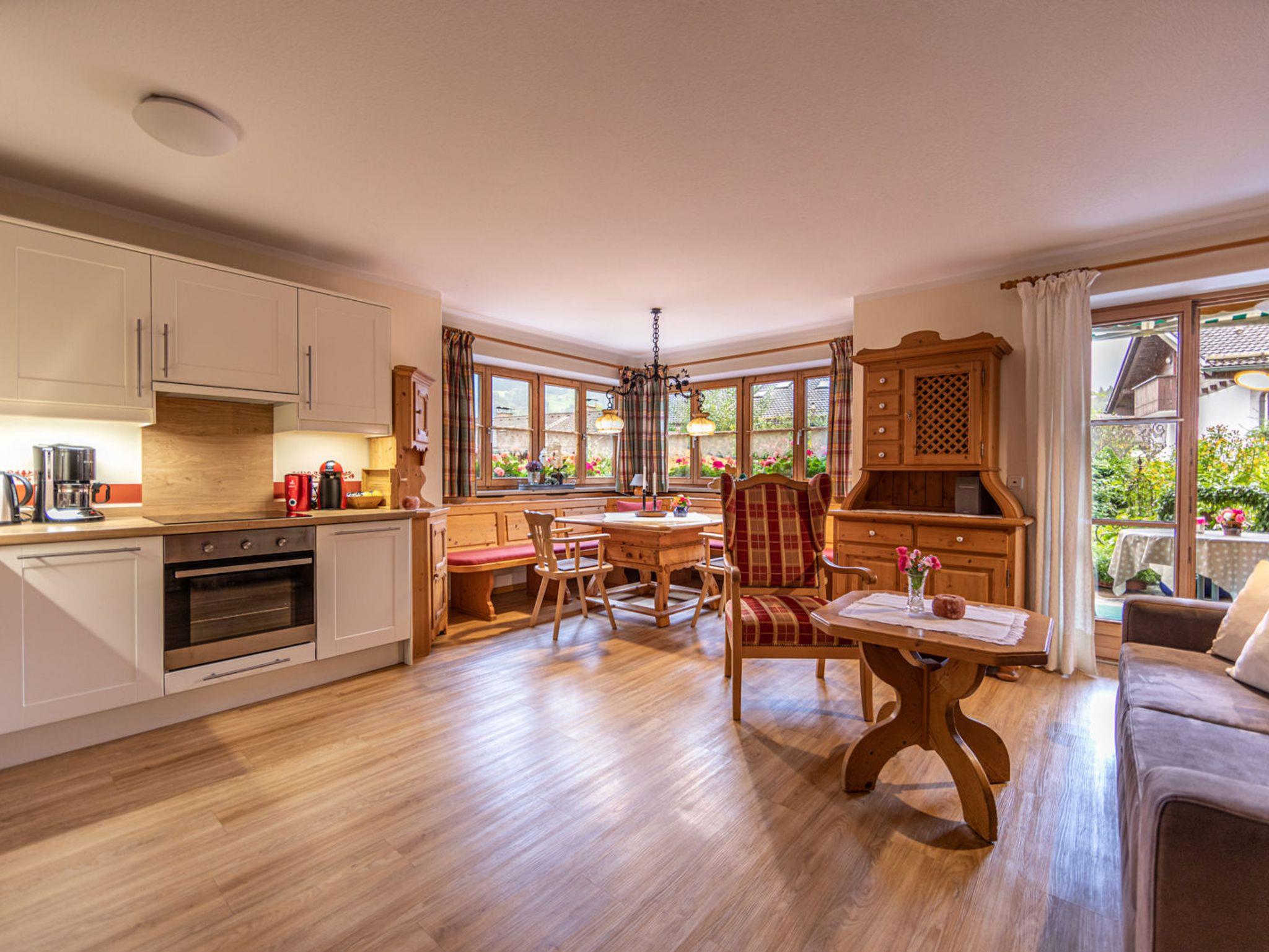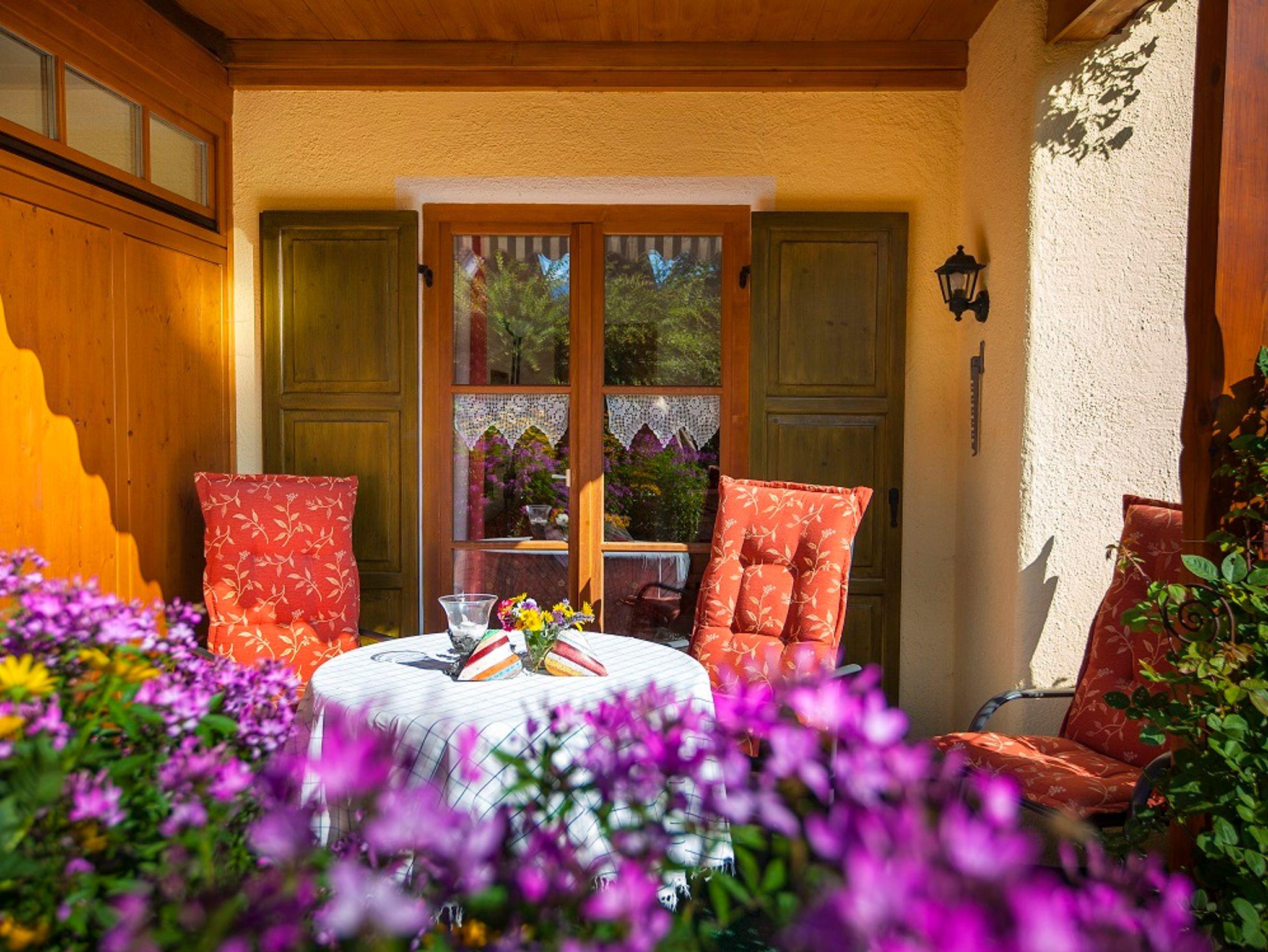 Neu renovierte, komfortabel und liebevoll im Landhausstil eingerichtete 2-Zimmer-Wohnung, 54 m², überdachte Süd-Terrasse mit schönem Blick zu den Bergen und zum Blumengarten. Die Ferienwohnung hat einen separaten Eingang und bietet Ihnen jeglichen Komfort: Wohnzimmer mit Küchenecke (Geschirrspüler, Backofen mit 4-Platten-Ceranfeld, Kaffeemaschine, Wasser- und Eierkocher, Toaster, Espressomaschine und Milchaufschäumer). Großes Eckfenster mit gemütlicher Essecke (Eckbank) sowie Sitzecke mit Komfort-Schlafcouch. Separates Schlafzimmer mit Doppelbett (hochwertige Matratzen, Allergiker-Betten) Geräumige Dusche/WC und kleine Diele. Desweiteren verfügt die Wohnung über Direktwahl-Telefon, W-LAN, Kabel-TV, Safe, Haarfön und eine eigene GARAGE mit AUFLADEMÖGLICHKEIT für E-AUTO !!!