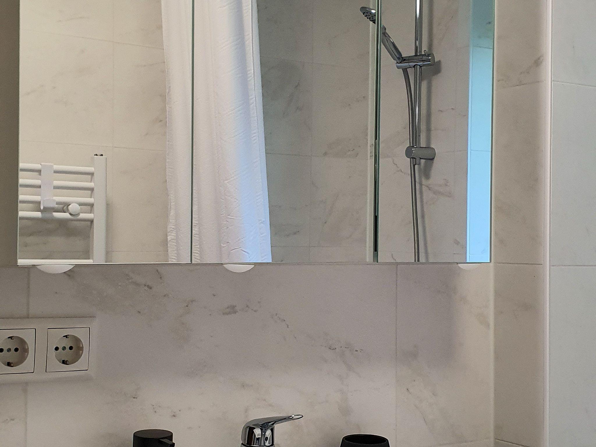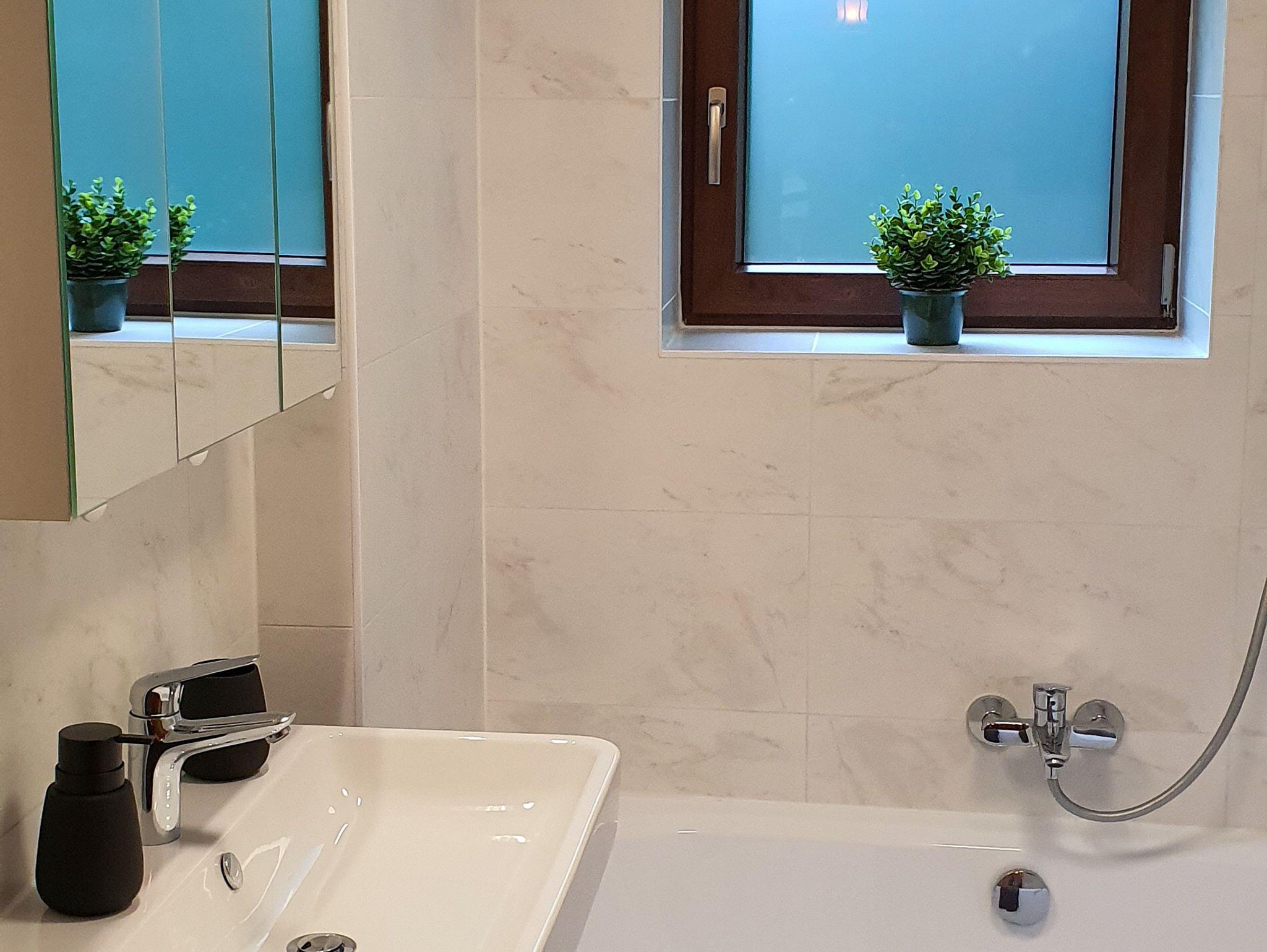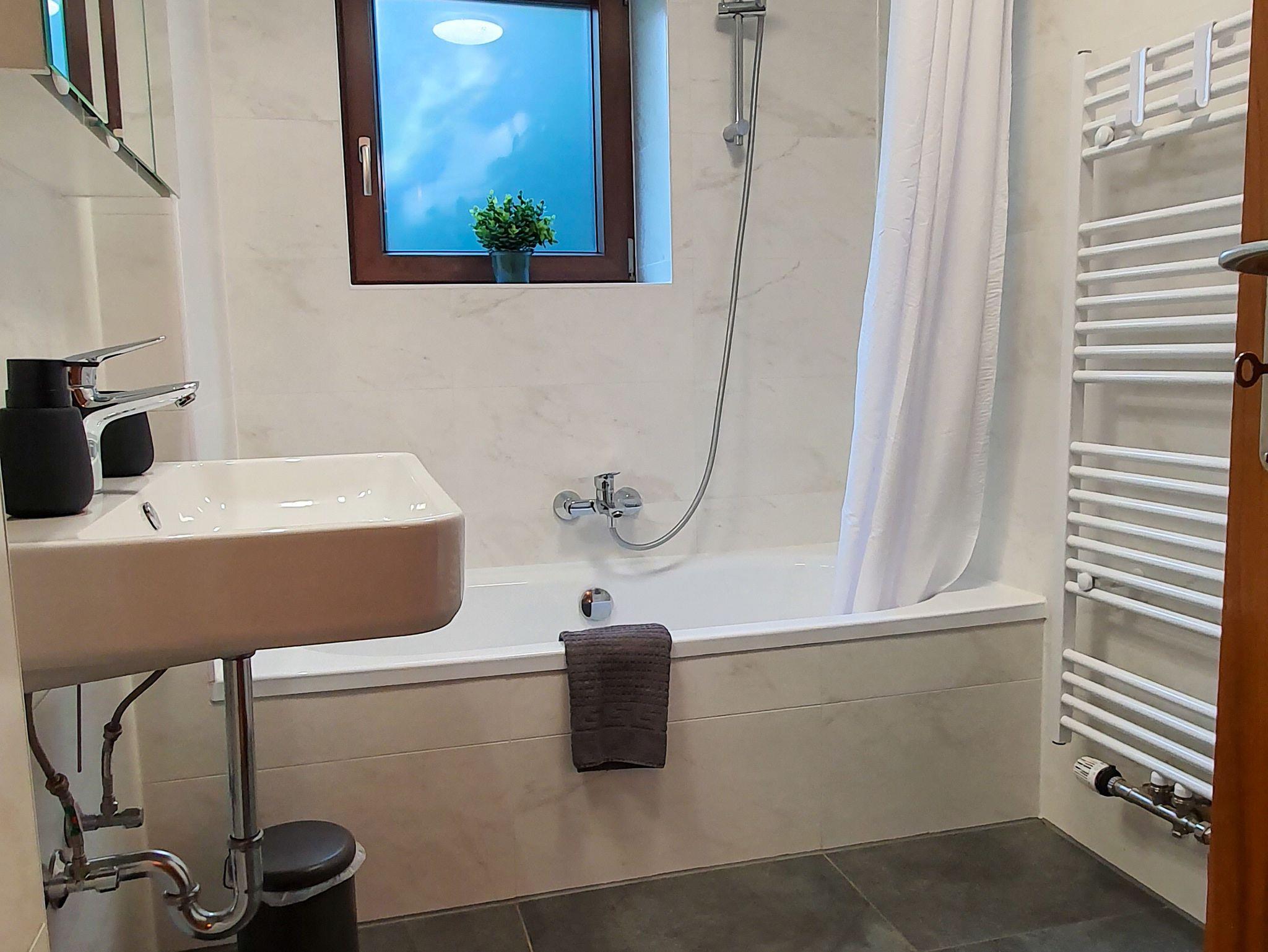 Ein modernes Badezimmer mit Badewanne, ideal zum Abschalten nach einem aktiven Tag