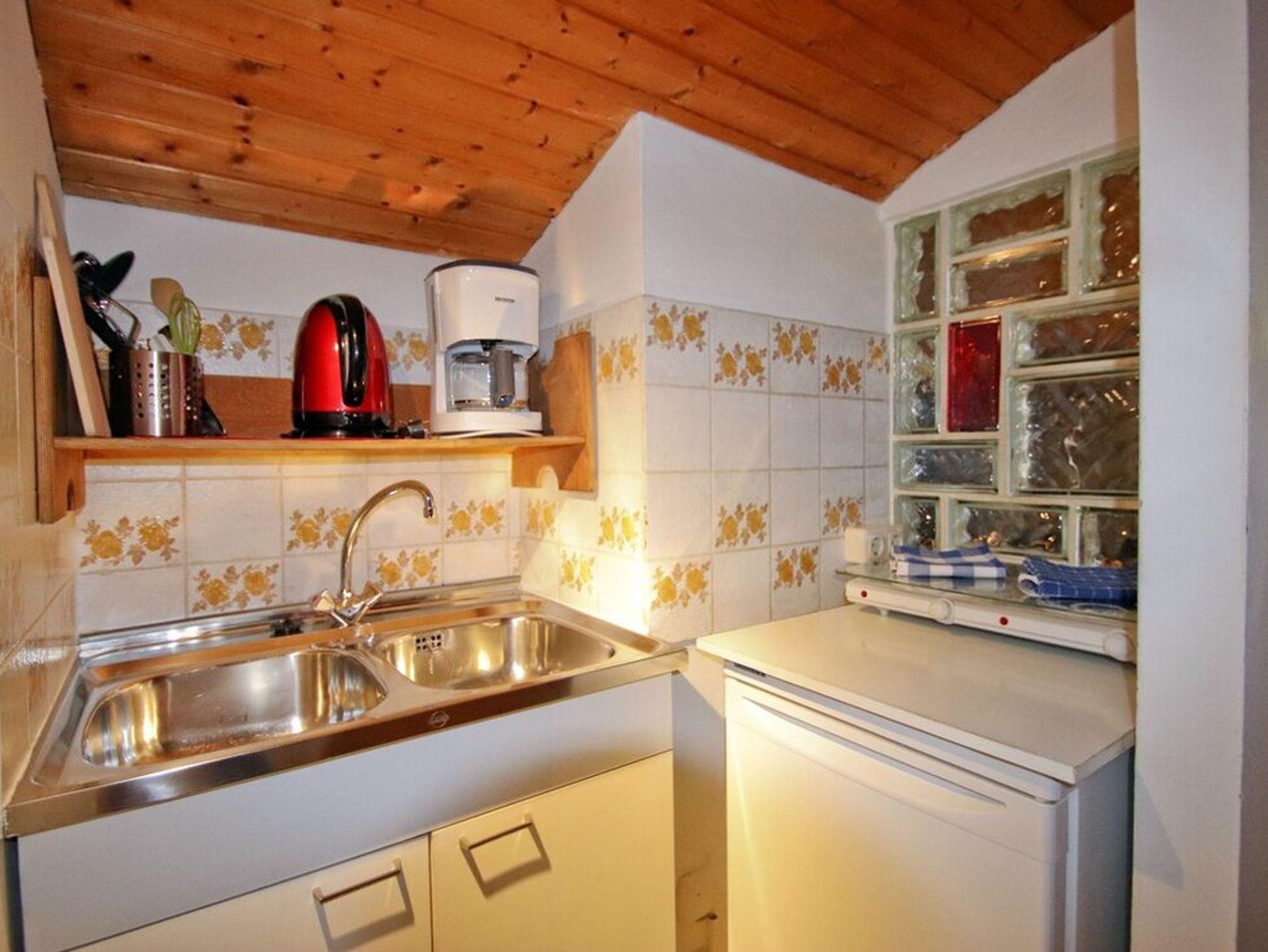 Unsere kleine Mansardenwohnung, bestehend aus 2 Betten und Nachtkästchen in einer Nische, Eckbank, Kleiderschrank, Kommode mit SAT-TV.Fenster mit Blick auf den Garten und Natur.Kleine Kochnische mit Spüle, 2 Herdplatten, Kühlschrank mit Gefrierfach und Kaffemaschine. Badezimmer mit Sitzbadewanne, Waschbecken und WC.Die Wohnung ist ca. 25 m² groß und bietet Platz für 2 Personen.
