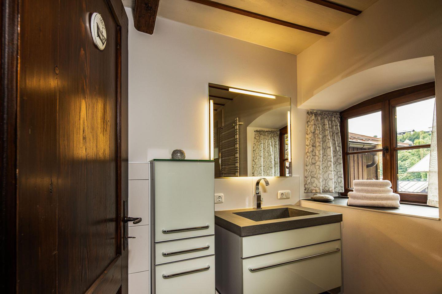 Im gemütlichen Dachgeschoss befindet sich ein offener Lounge-Bereich mit einer einladenden Lodencouch und einem großem Flachbild-TV, sowie ein weiteres Schlafzimmer mit getrennten Betten und einem Schreibtisch. Sie können diesen Raum also auch als Arbeitszimmer nutzen. Ebenfalls im Dachgeschoss befindet sich ein weiteres Badezimmer mit Badewanne und großartigem Blick auf das Wittelsbacher Schloss von Berchtesgaden und die Türme der Stiftskirche. Wir weisen auf die reduzierte Raumhöhe in diesem Geschoß hin.