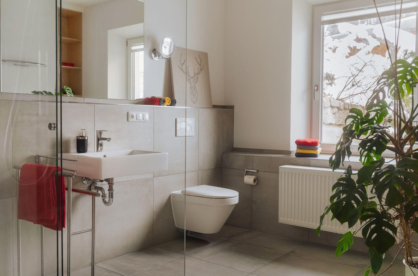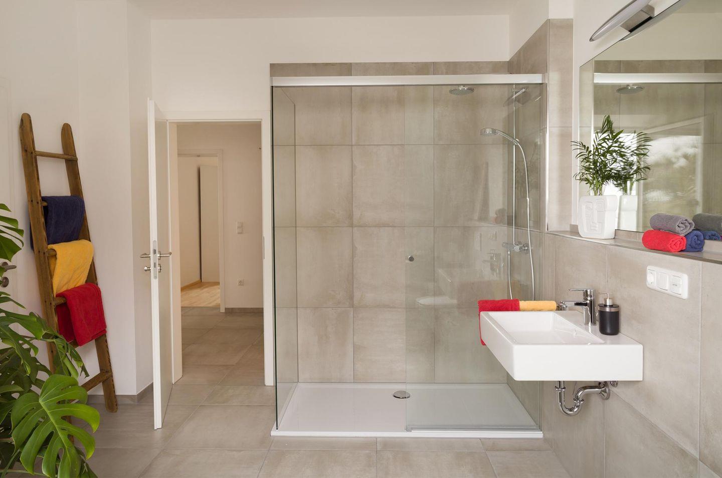 Das große Badezimmer mit Fußbodenheizung, ebenerdiger Dusche und hochwertiger Ausstattung sorgt für Wellness-Momente im Alltag. Zusätzlich steht Ihnen ein Gäste-WC zur Verfügung.