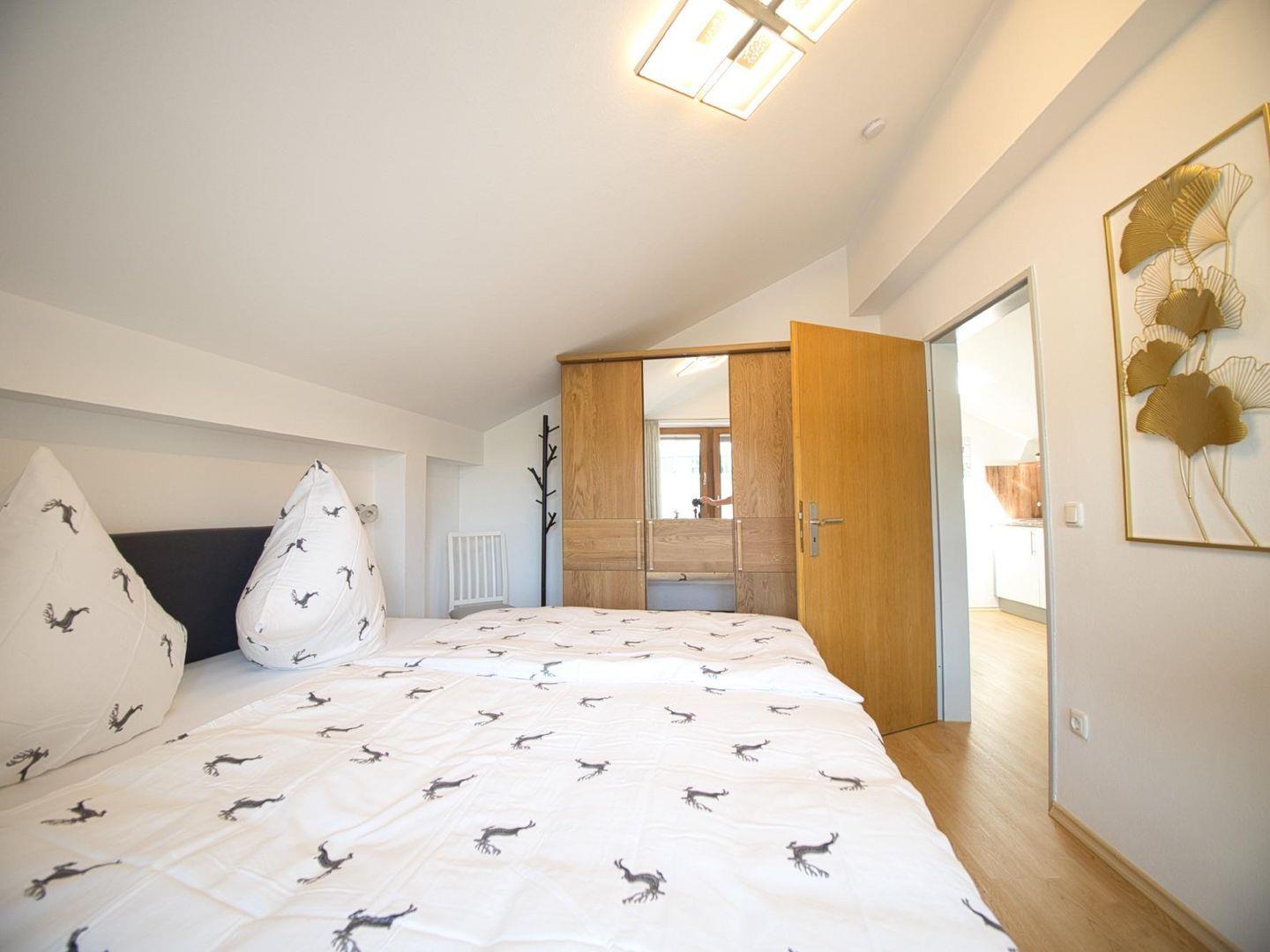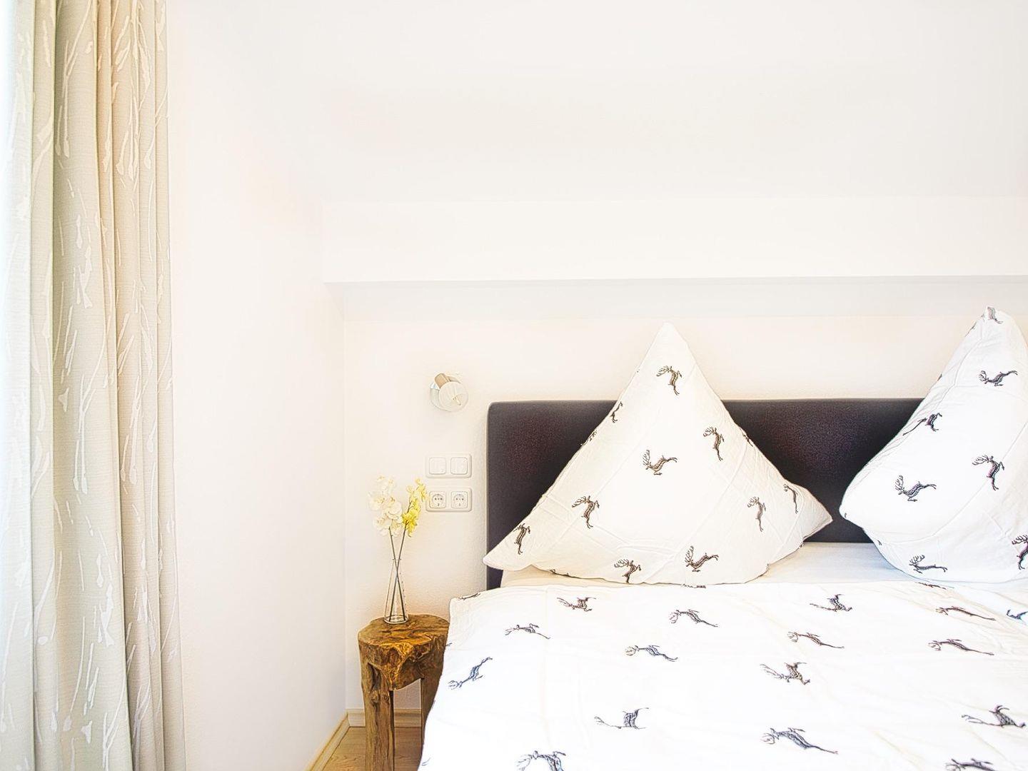 Auf 45?m² erwartet Sie eine hochwertige Ausstattung in Kombination mit modernem Komfort. Das helle Schlafzimmer mit Doppelbett verfügt über einen direkten Zugang zum Balkon – von hier aus genießen Sie einen herrlichen Blick auf die umliegenden Berge.