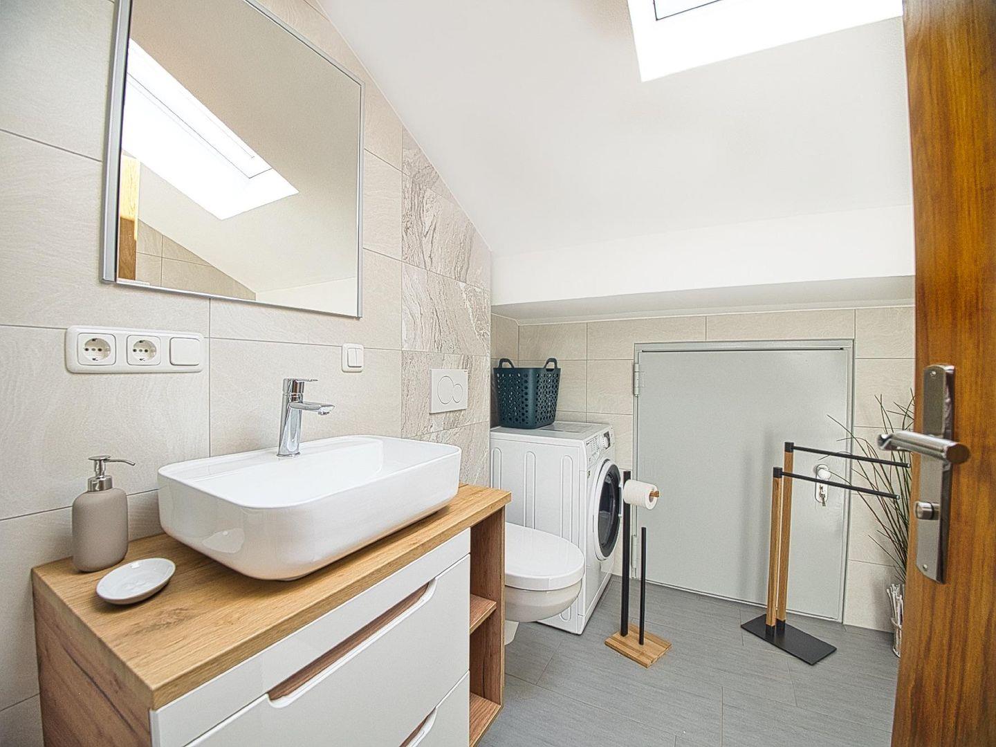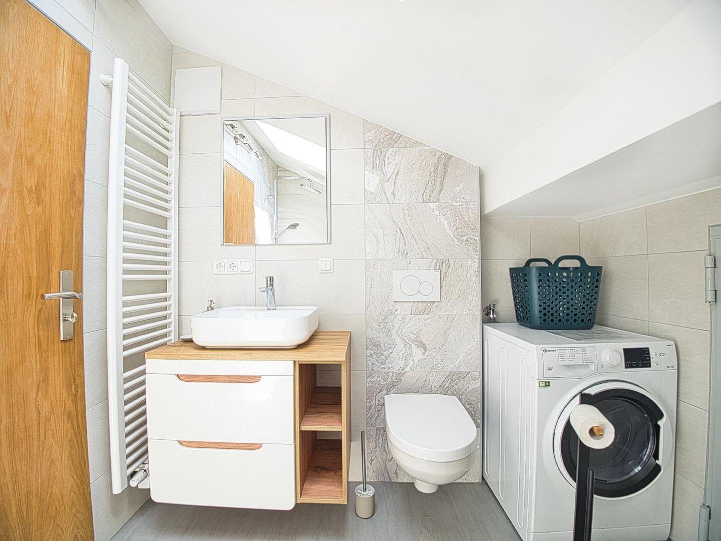 Im modernen Badezimmer stehen Ihnen eine großzügige Dusche, ein WC sowie eine Waschmaschine mit integriertem Trockner zur Verfügung.