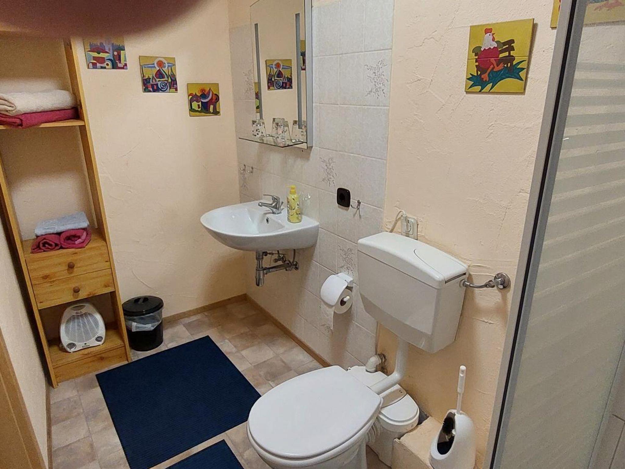Das Bad ist mit Dusche, Waschbecken und Toilette ausgestattet. Alle nötigen Utensilien für eine spontane Übernachtung ohne Kosmetiktasche sind vorhanden.