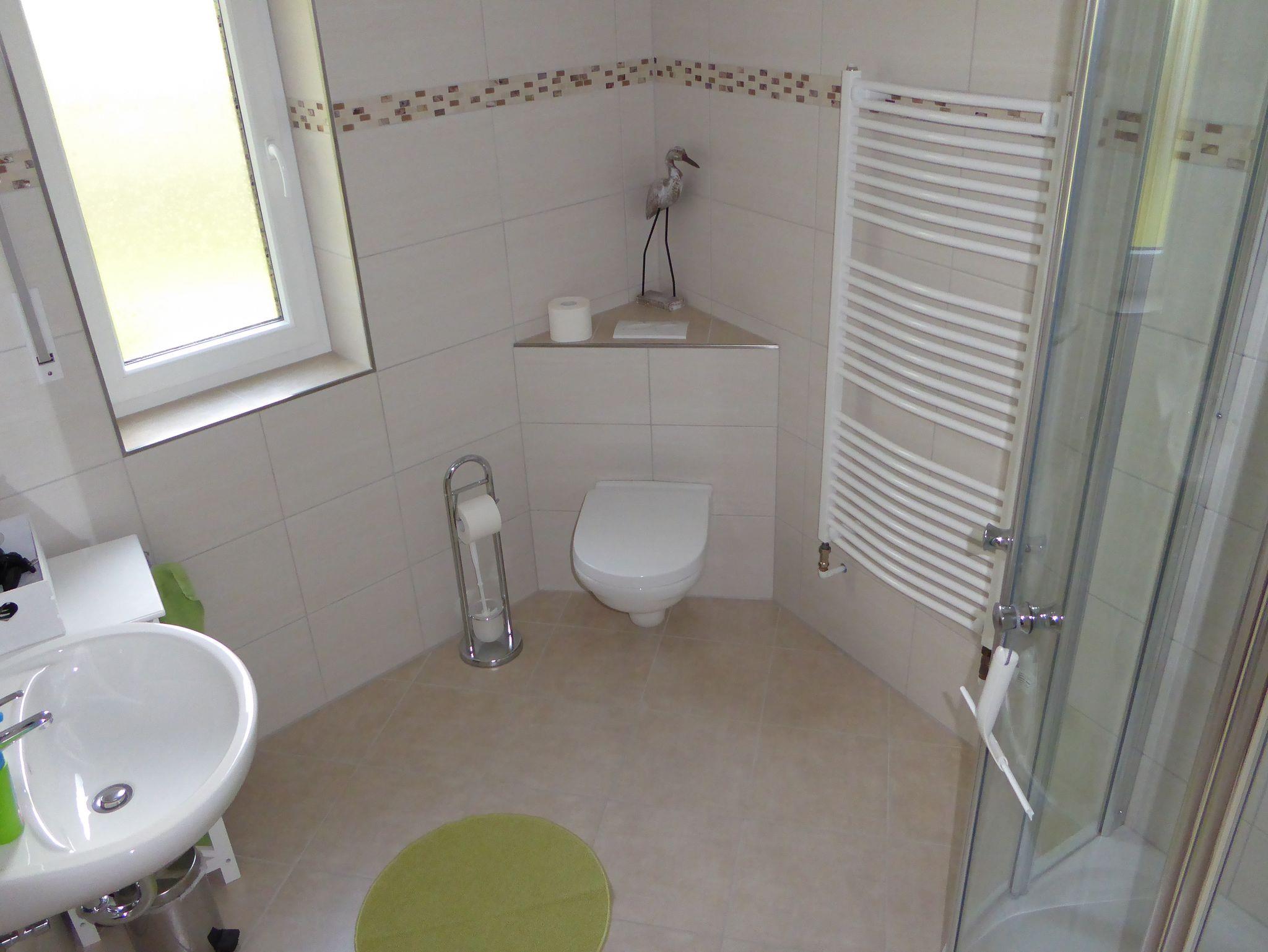 zwei Schlafzimmer und ein Badezimmer mit Dusche und WC.