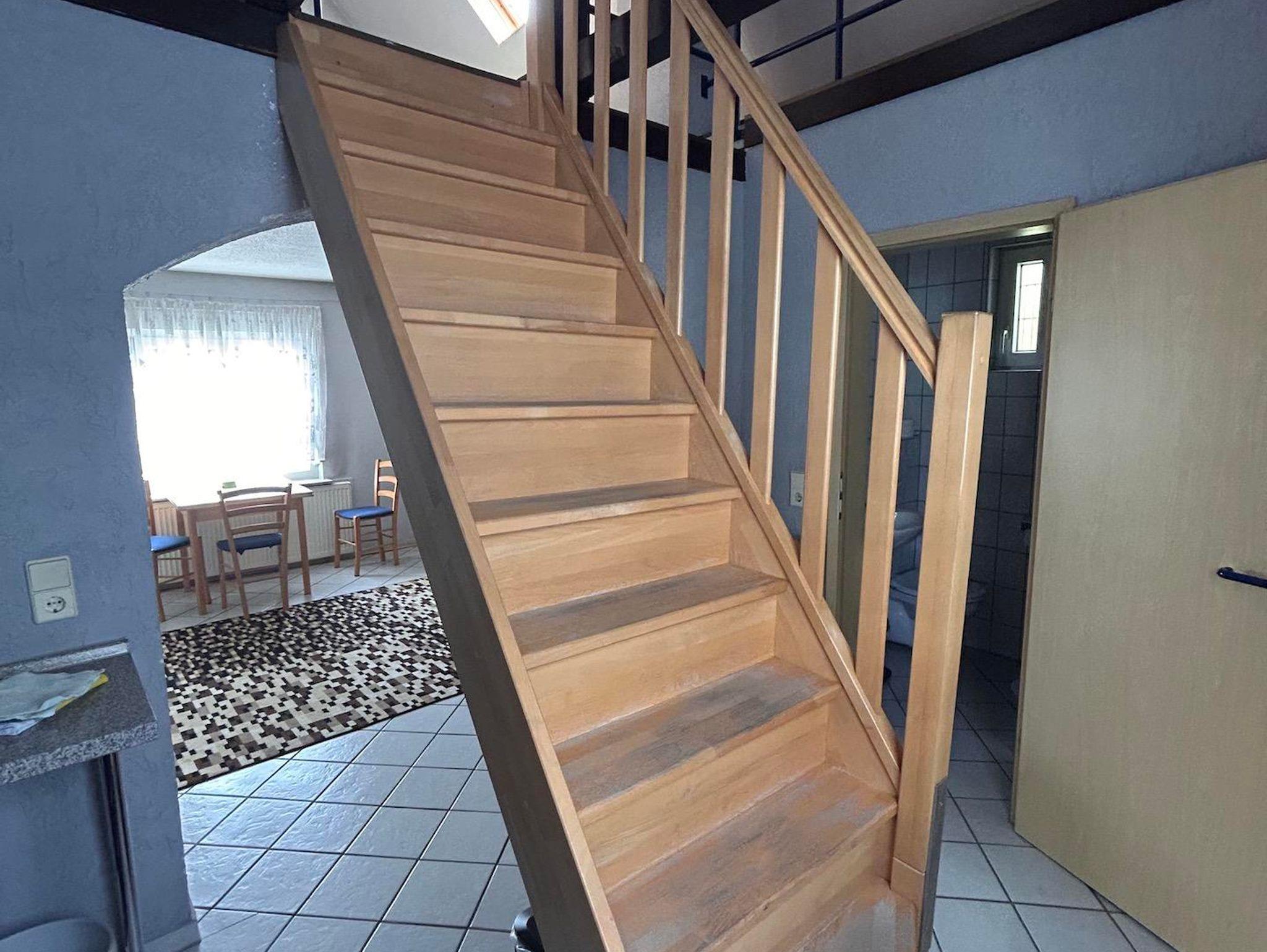 Unsere Ferienwohnung 3 liegt im Nebengebäude und bietet in seinen zwei Stockwerken, ausreichend Platz für zwei Personen. Sie ist gemütlich und verfügt über eine Küche, ein Bad (Dusche/WC), ein separates Schlafzimmer sowie ein Wohn- und Esszimmer.