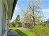 o eine südlich ausgerichtete Terrasse mit großem runden Tisch und bequemen Stühlen mit Sitzpolstern, Sonnenschirm, umgeben von einem alten gewachsenen Garten mit Apfel-, Kirsch- und Birnenbäumen