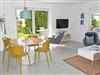 o einen Wohnbereich mit lichtdurchfluteter Wohnküche und großem runden Esstisch und Stühlen, Geschirrspüler, Ofen, Cerankochfeld, Kühlschrank mit Gefrierfach, Mikrowelle, Kaffeemaschine, Wasserkocher, Toaster, SAT-TV, Musikanlage mit CD und Bluetooth