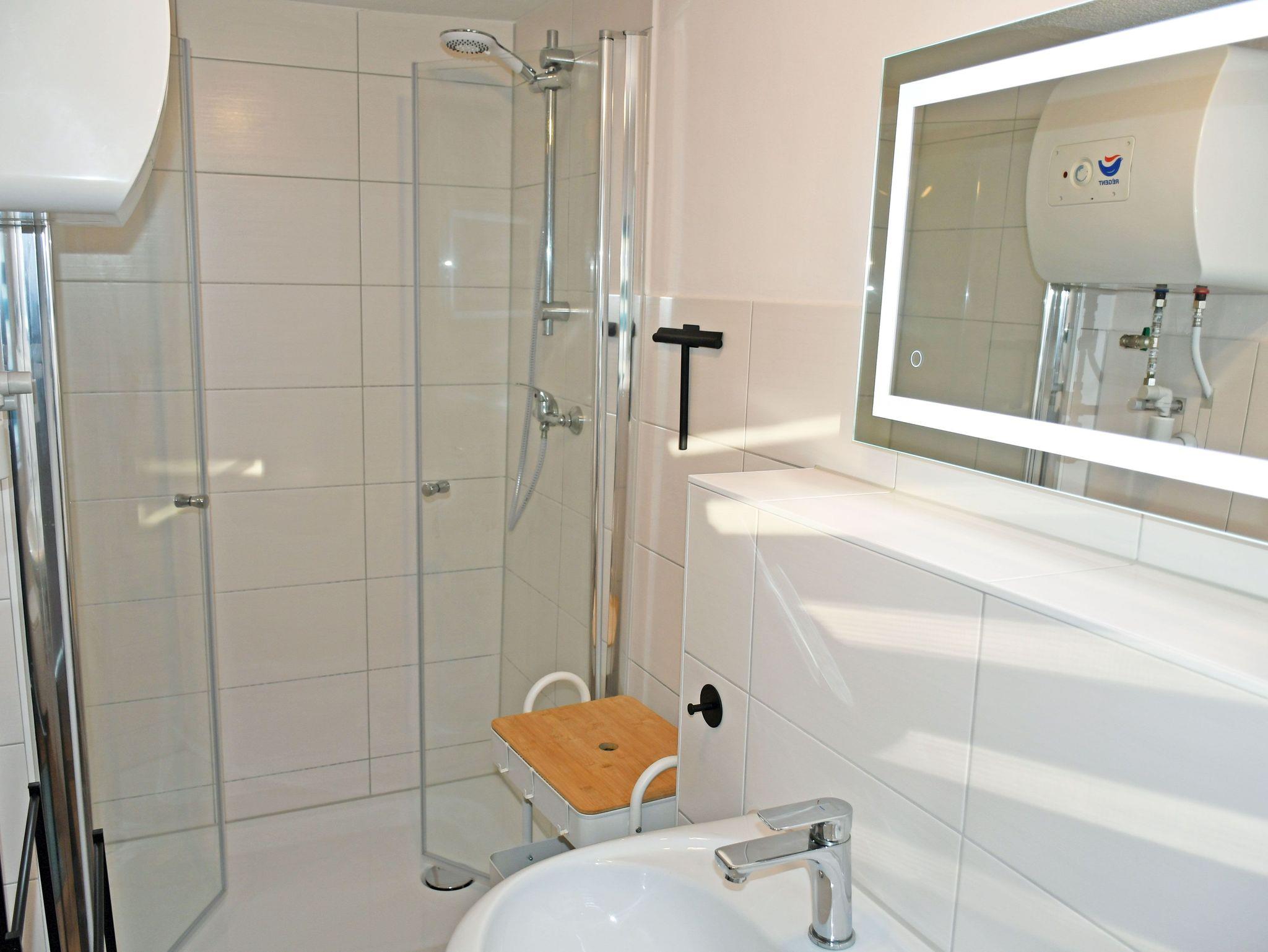 Das Bad ist mit Dusche, WC und Waschbecken ausgestattet und verfügt über Tageslicht.