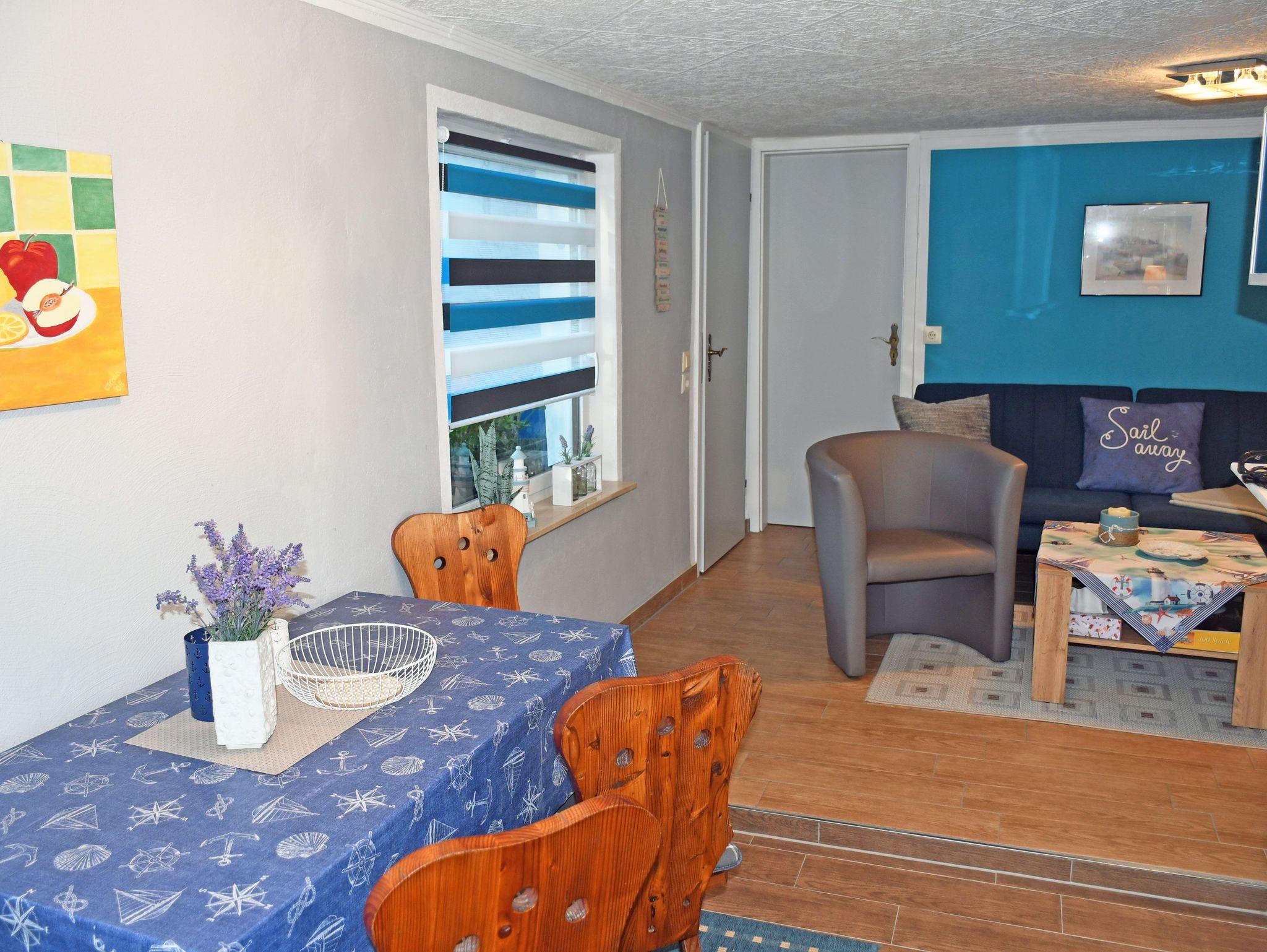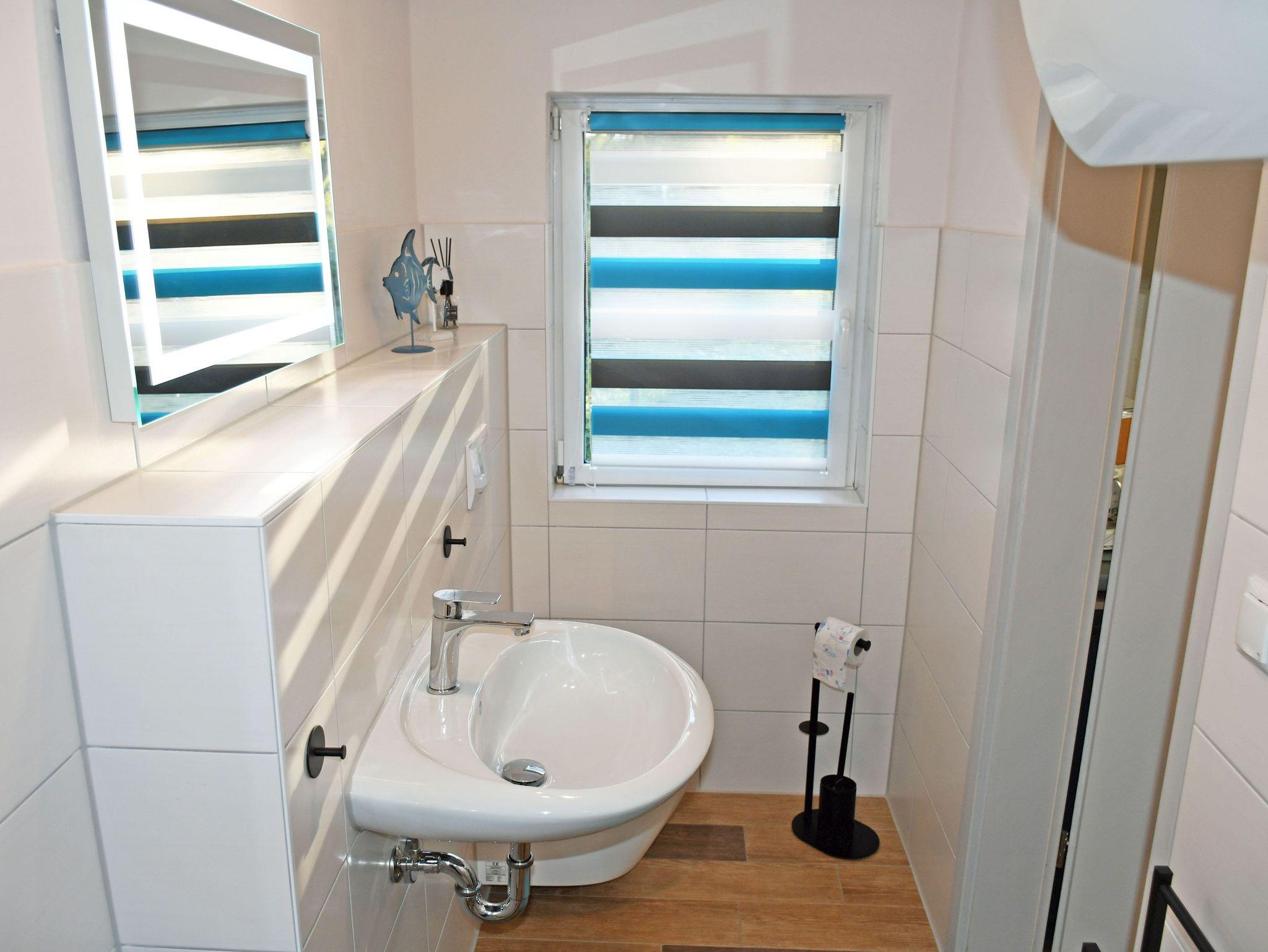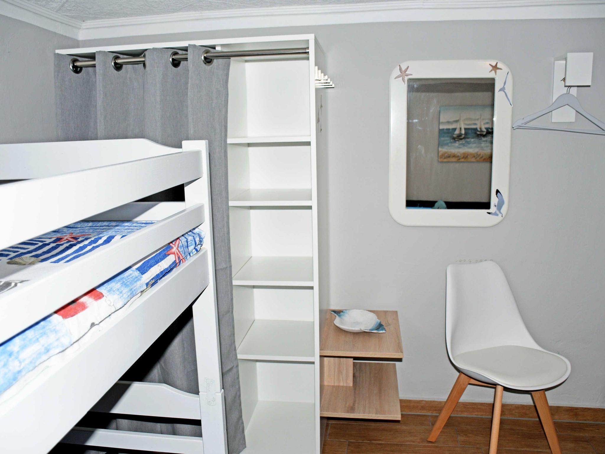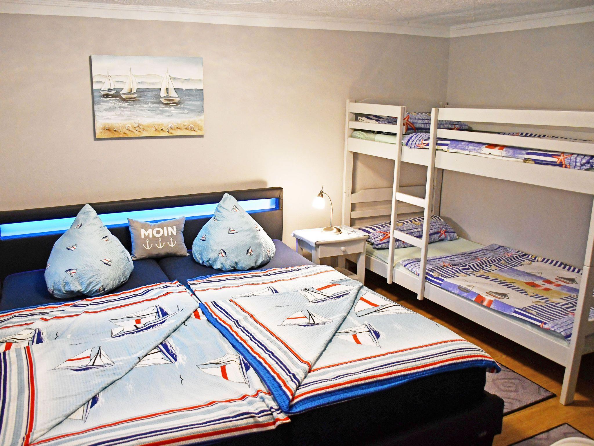 Im Schlafzimmer stehen ein bequemes Doppelbett mit einem Nachttische und Leselampe, sowie ein Etagenbett. Bettwäsche können Sie bei der Buchung zum einmaligen Aufpreis von 5 Euro je Gast zubuchen. Handtücher bitten wir Sie selbst mit zu bringen.