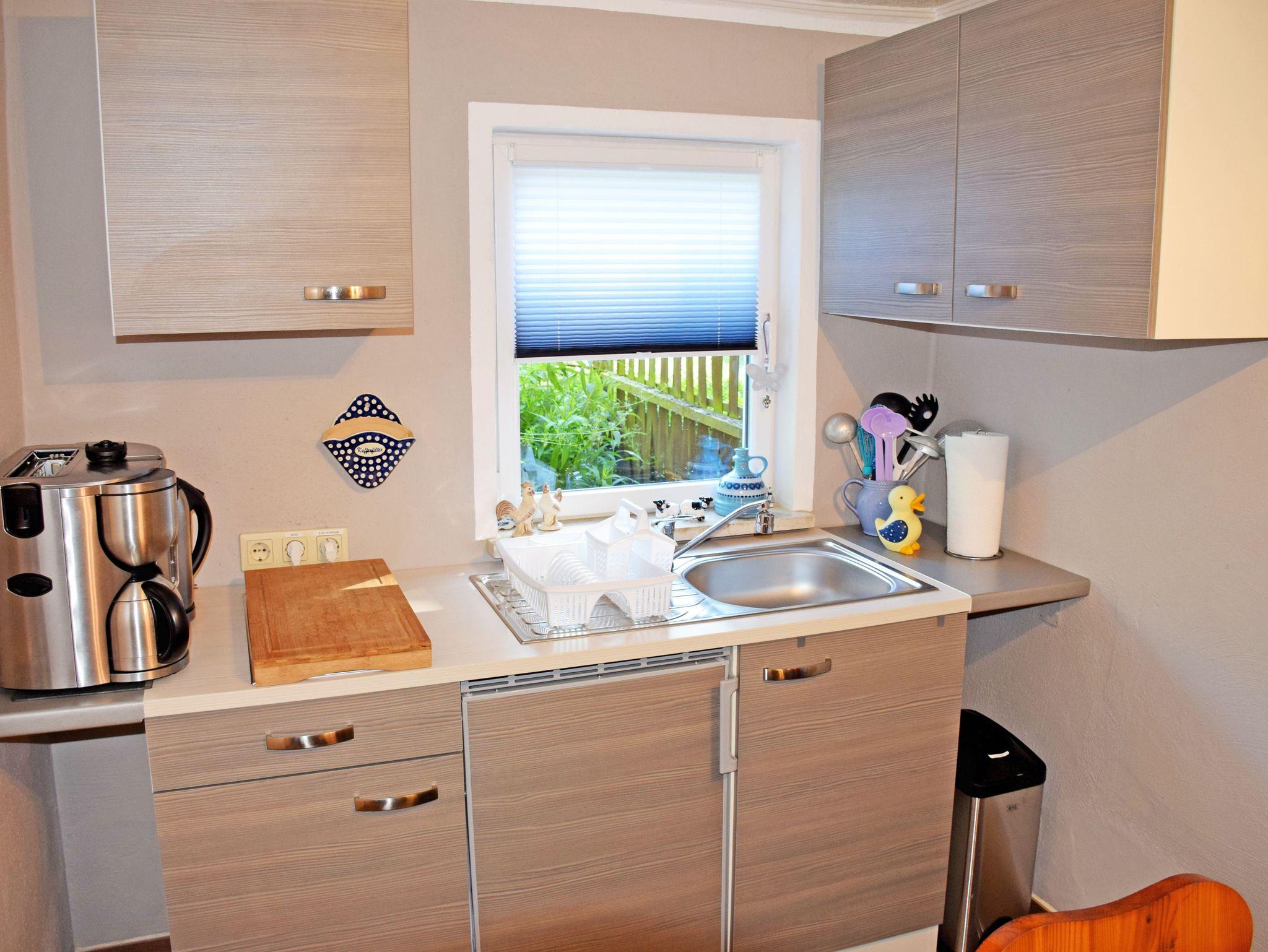 Die kleine Pantryküche ist mit einem Plattenherd, Wasserkocher, Kaffeemaschine, Toaster und Kühlschrank ausgestattet.