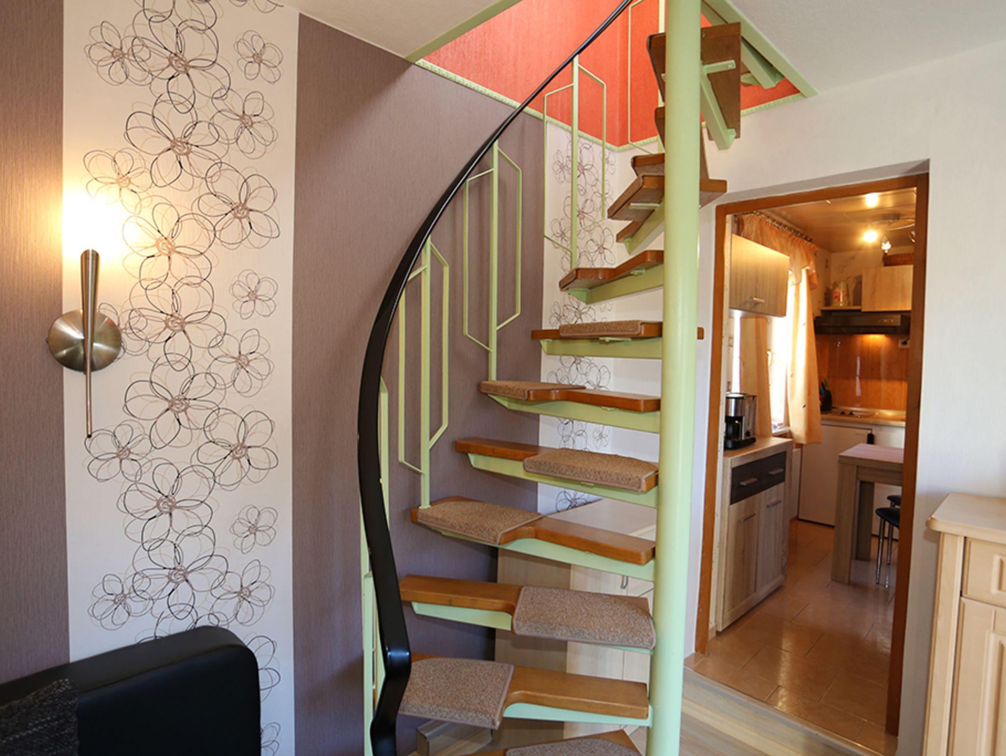 Die ca. 40m²-Ferienwohnung für 2-3 Personen über 2 Etagen besteht aus einem separaten Eingang, einem Wohnzimmer mit Radio und Kabel-TV, einer separaten Mini-Wohnküche mit 2-Platten-Ceranfeld und Minibackofen sowie mit einem Essplatz, einem Schlafzimmer mit Doppelbett im OG, erreichbar über Raumspar-Wendeltreppe einem Bad mit Dusche und WC (im EG), einer Sonnenterrasse mit Gartenmöbeln und einem Pkw-Stellplatz im Garten. Auch ein Trockenplatz steht zur Verfügung.