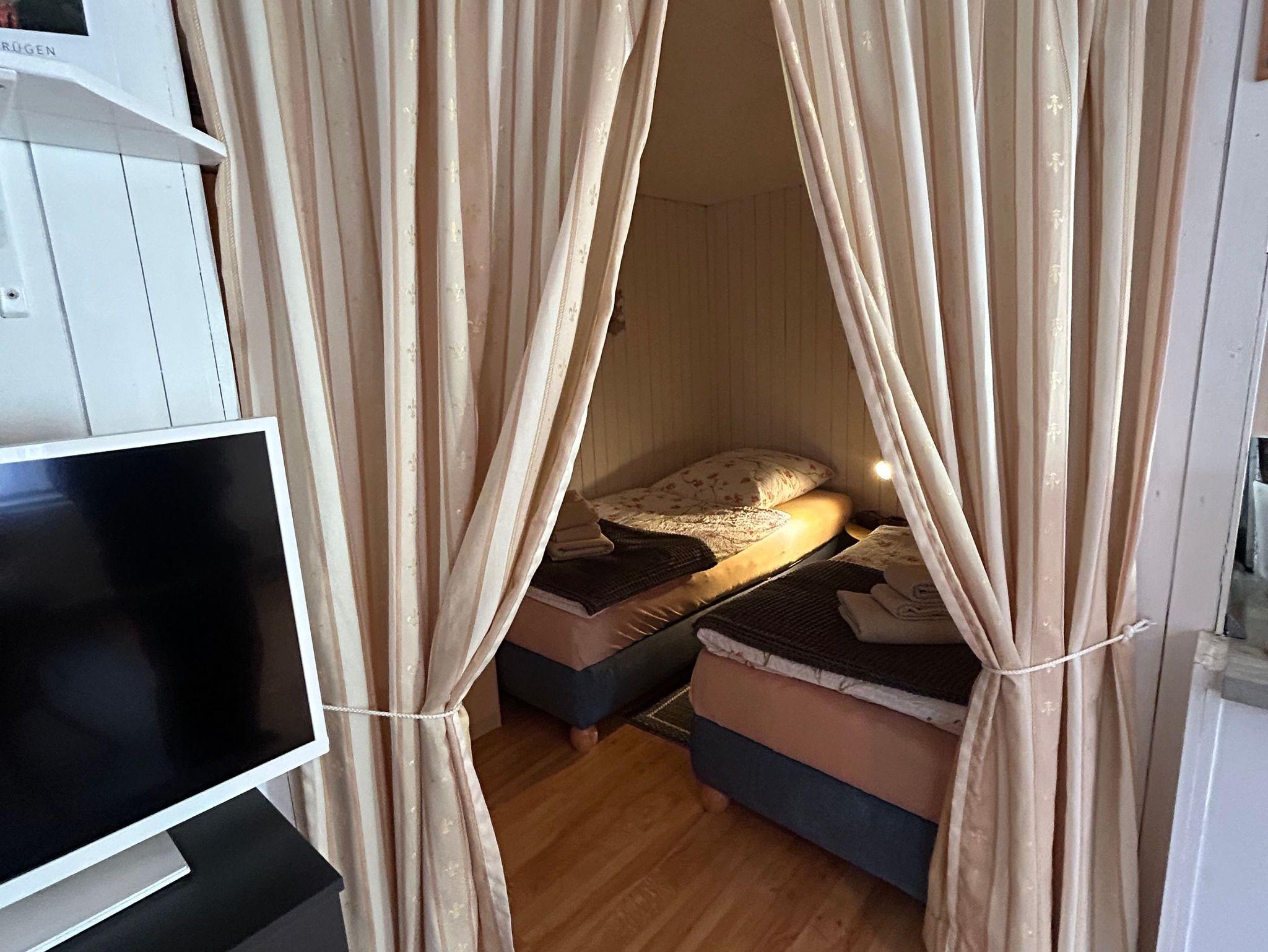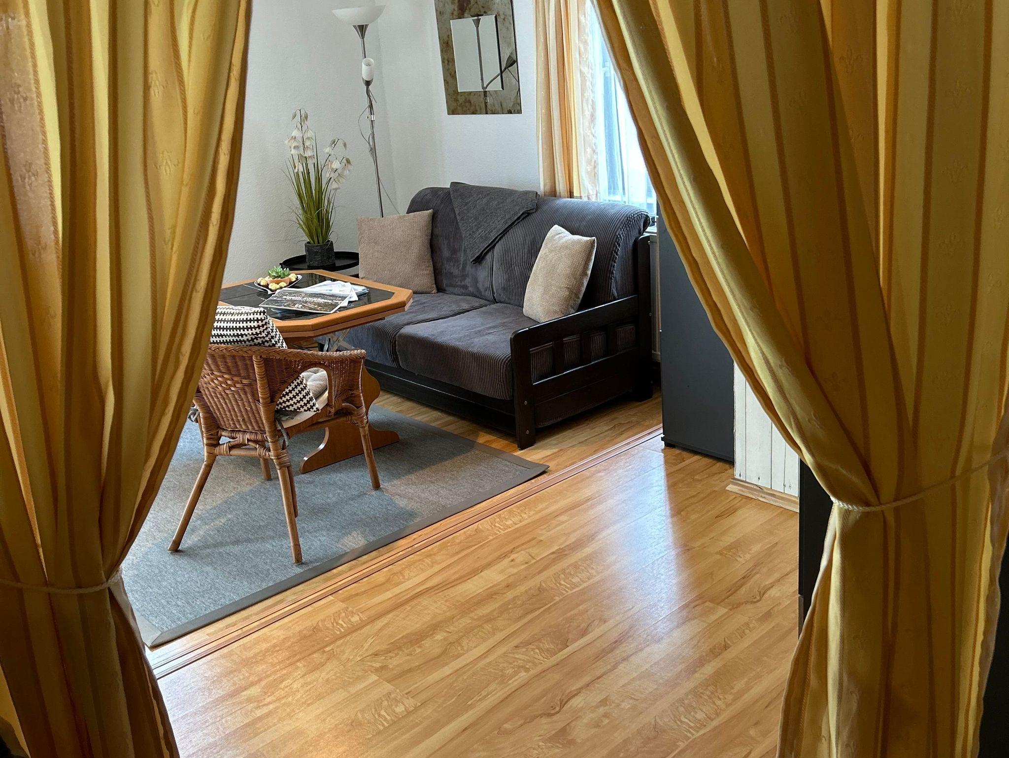 Eingerichtet ist die Ferienwohnung mit einer großzügig eingerichteten Küchenzeile sowie einem separaten Bad mit Dusche. Es erwartet Sie ein außergewöhnlich geschnittener Raum, wobei der Schlafbereich durch einen Vorhang optisch getrennt wurde.