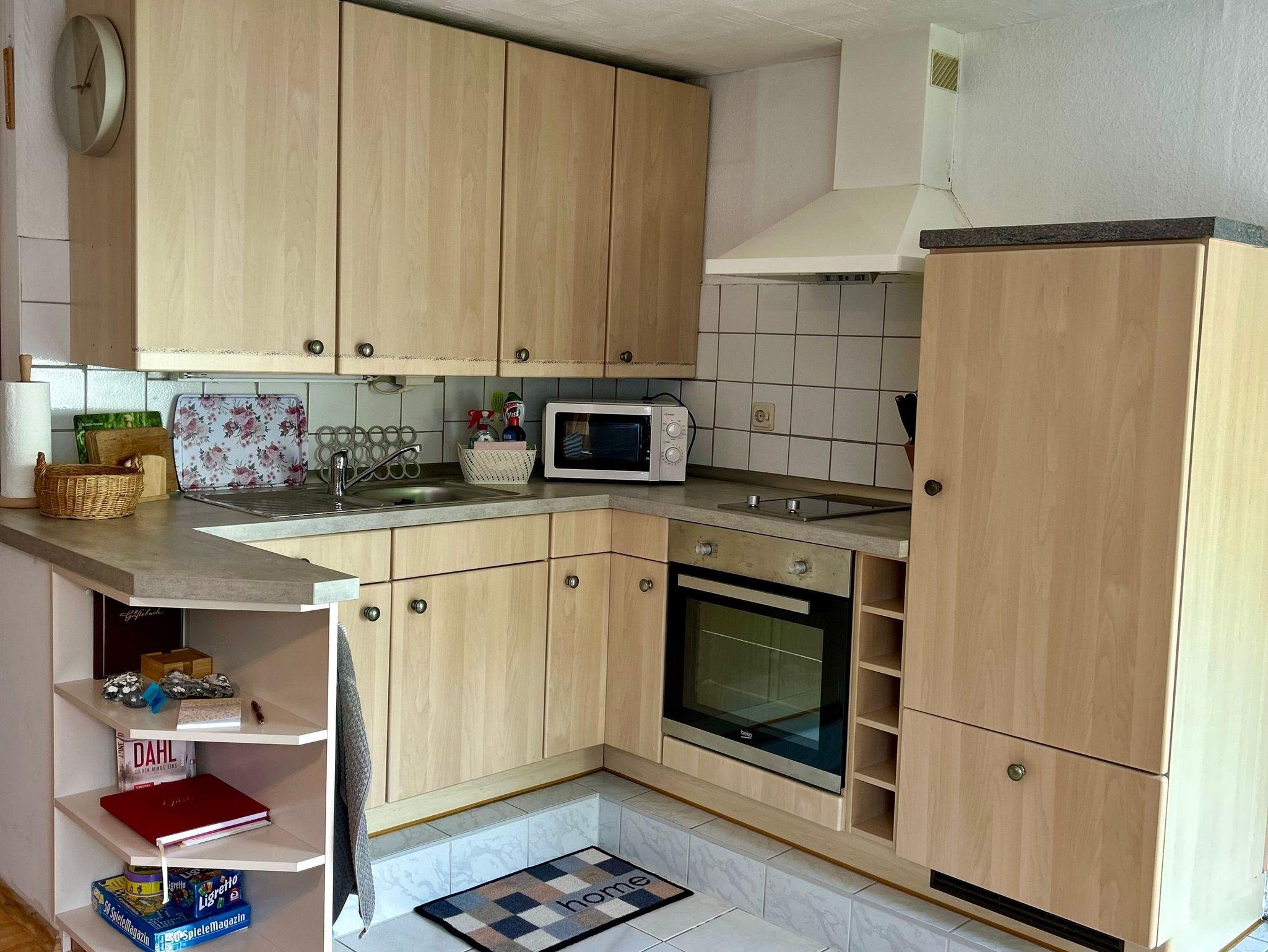 Zur Ausstattung der Küche gehört unter anderem: Wasserkocher , Toaster, Kaffeemaschine, Microwelle, Kühlschrank mit einem Gefrierfach und einem E-Herd (2 Platten Cerankochfeld mit Backofen) sowie ein komplettes Geschirrsortiment.