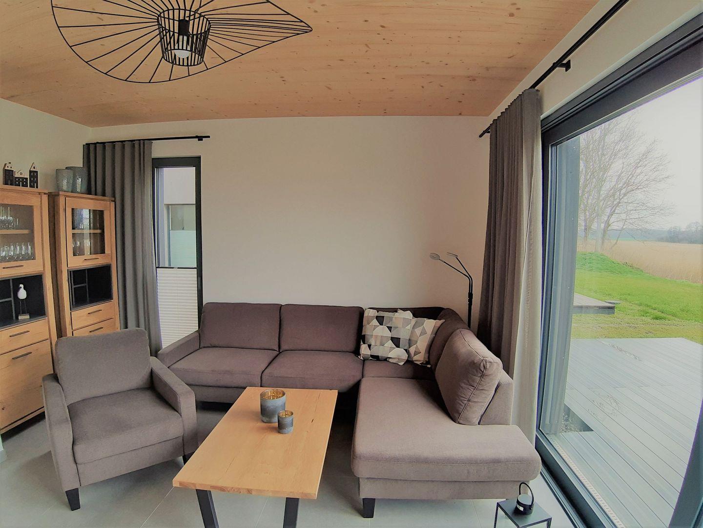 Von der Galerie mit Loggia eröffnet sich ein beeindruckender Blick über die Boddenlandschaft bis hin nach Lietzow – nachts ist sogar das Leuchtfeuer von Kap Arkona zu sehen.