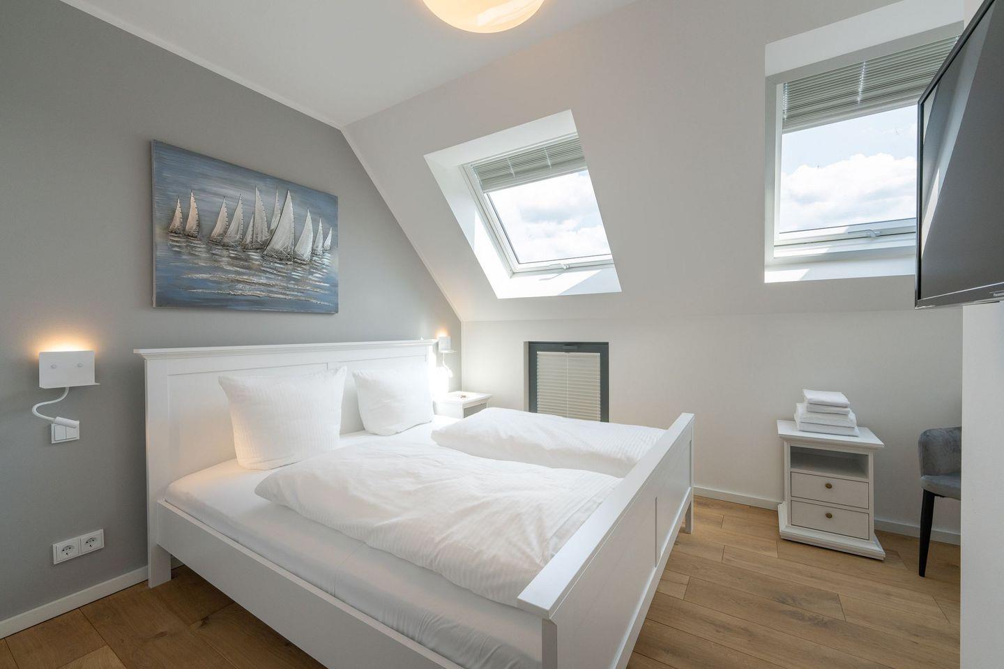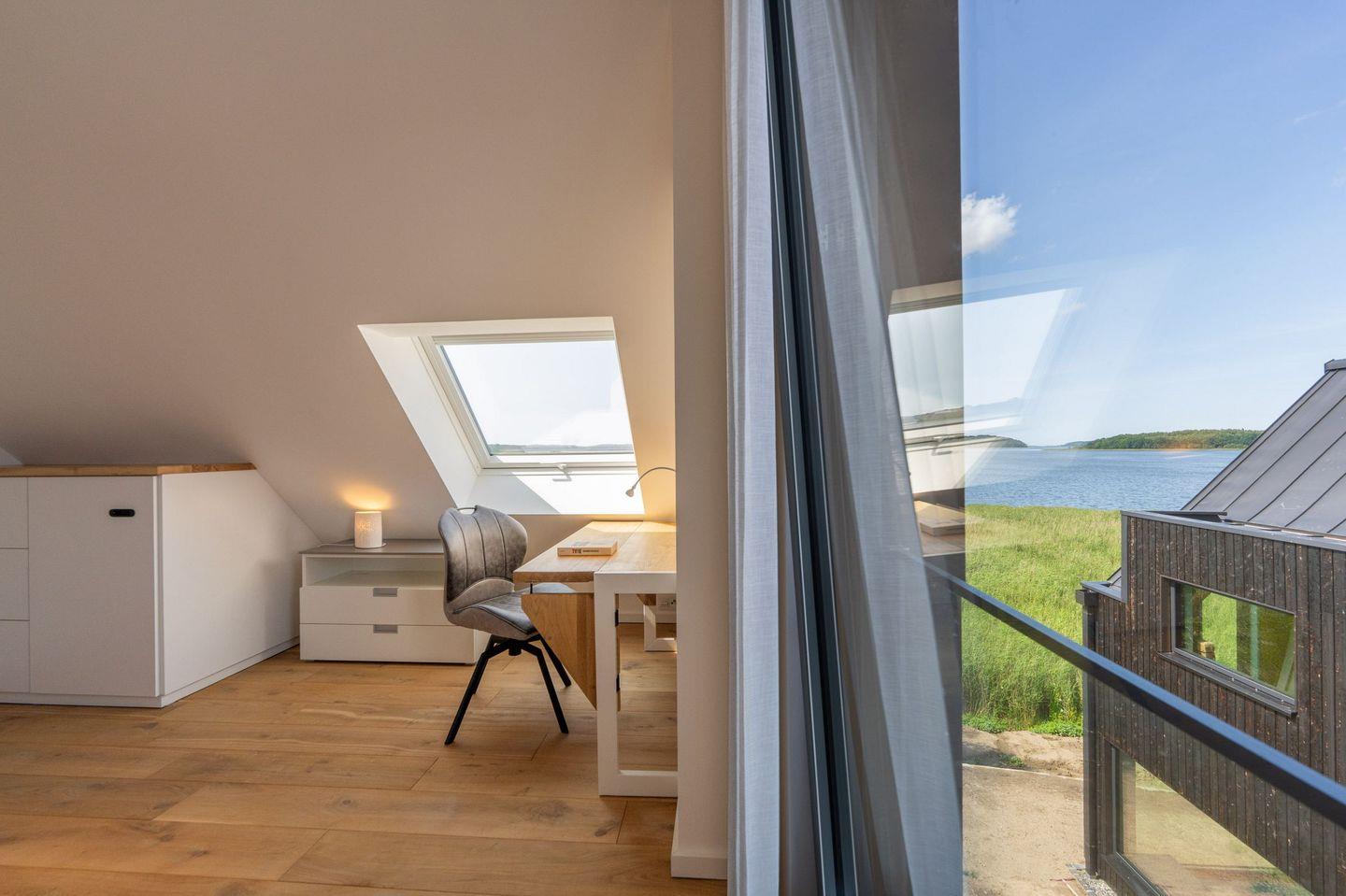 Über eine elegante Echtholztreppe gelangen Sie in den Spitzboden. Dort befindet sich ein gemütlicher Relax-Bereich mit breiter Schlafcouch sowie ein komfortabler Arbeitsplatz mit WLAN (Glasfaseranschluss) – inklusive traumhaftem Blick auf den Bodden.