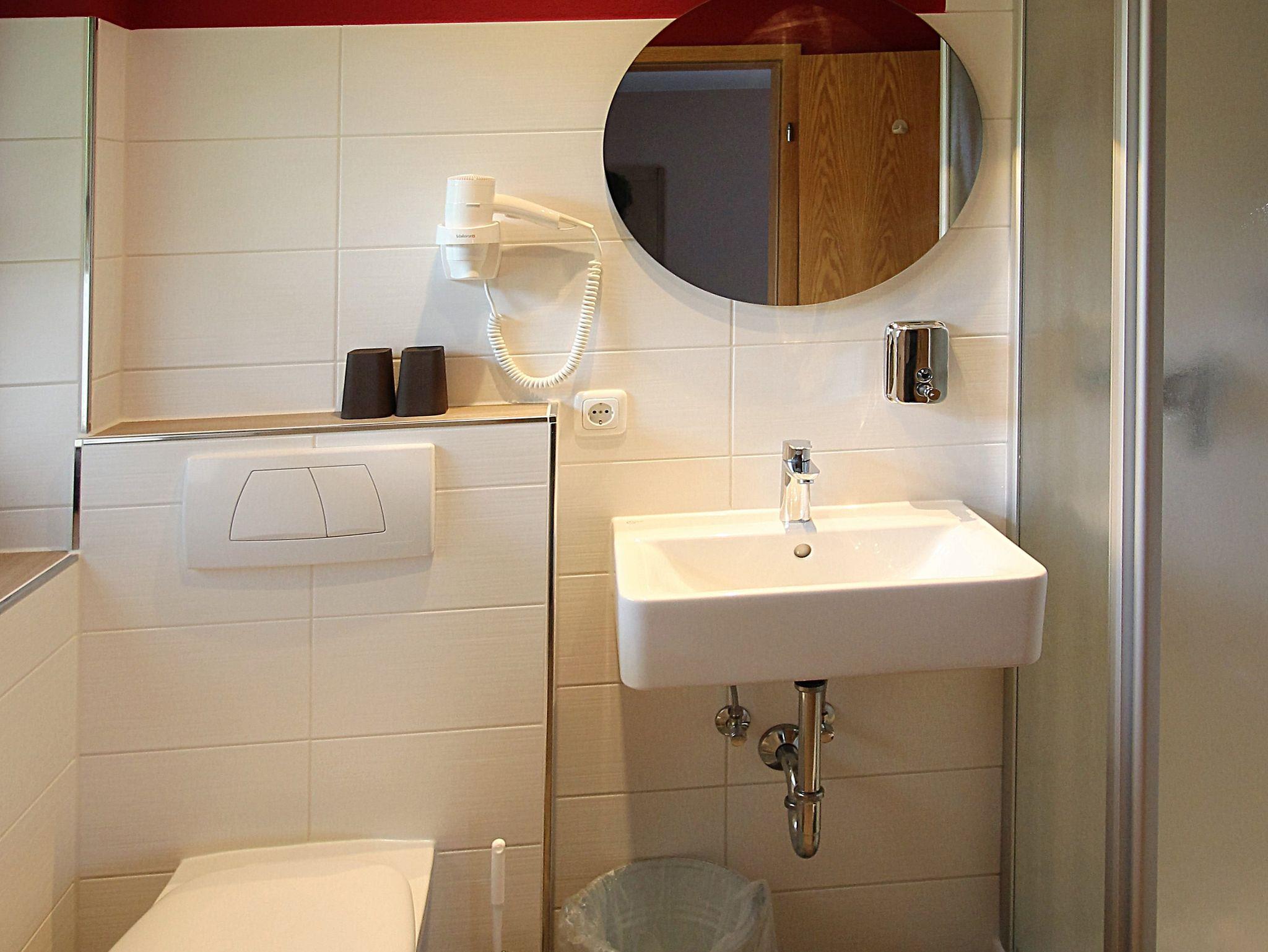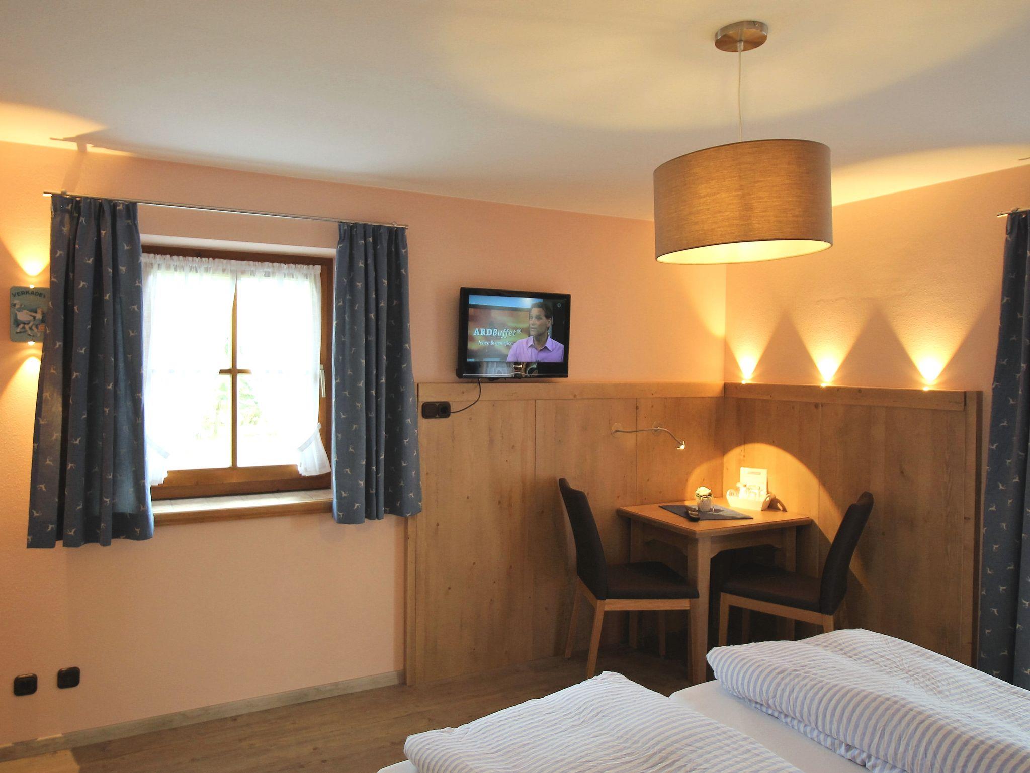 Das Zimmer wurde 2016 komplett neu renoviert. Ausstattung: Massivholz-Doppelbett, kleine Sitzecke mit Wandvertäfelung, Fußboden in Holzoptik, Sat-TV mit Flachbildschirm, kostenloses W-LAN und Zimmersafe, hochwertige LED-Beleuchtung. Badausstattung: Echtglas-Dusche, WC, Föhn, Seifenspender. Möblierter Balkon mit Blick in den Garten.