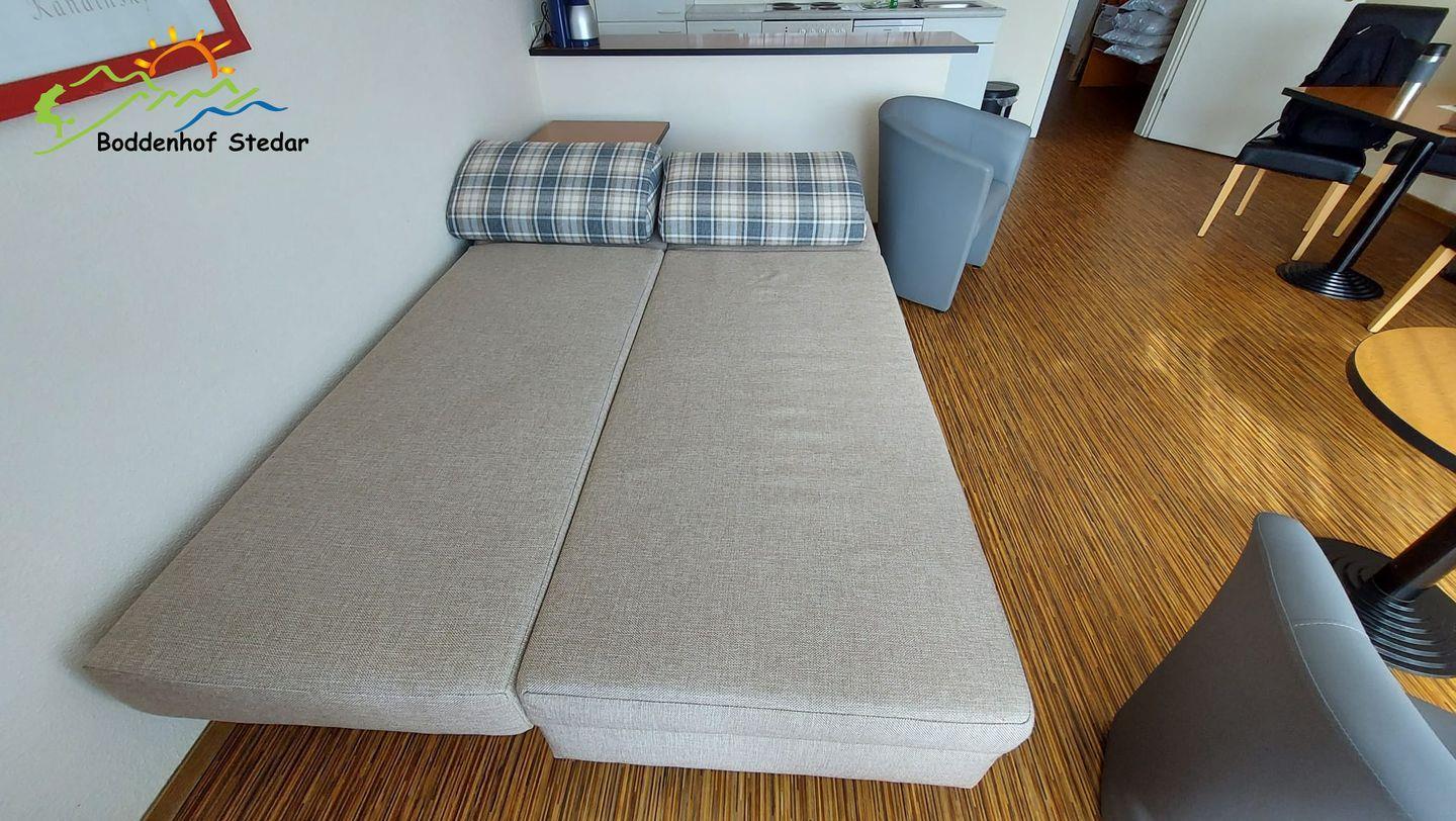 Der offene Wohnbereich mit bequemer Doppelschlafcouch und Sesseln lädt zum Entspannen ein. Dank der großen bodentiefen Fenster ist der Raum lichtdurchflutet und vermittelt ein angenehmes Wohngefühl.