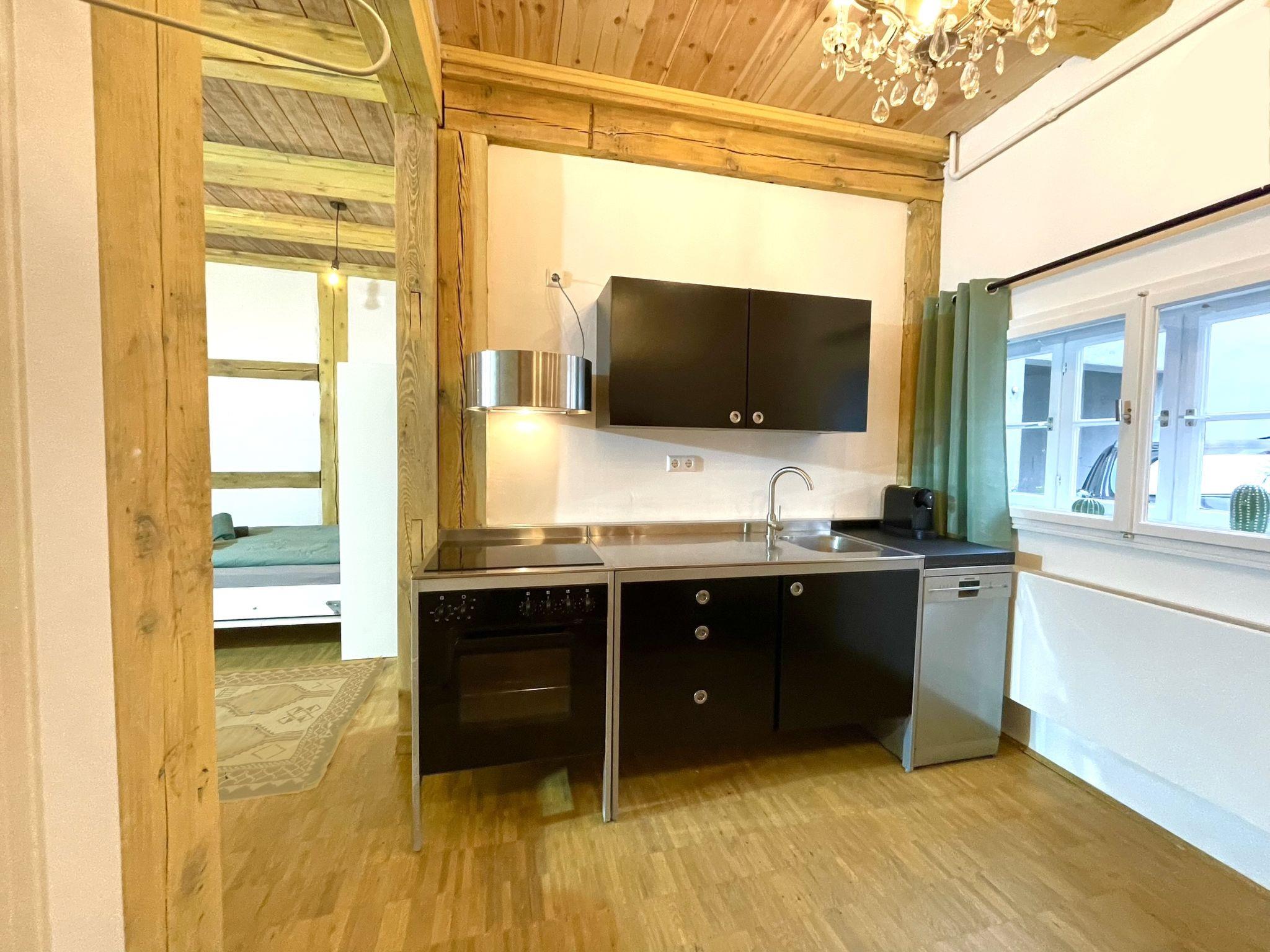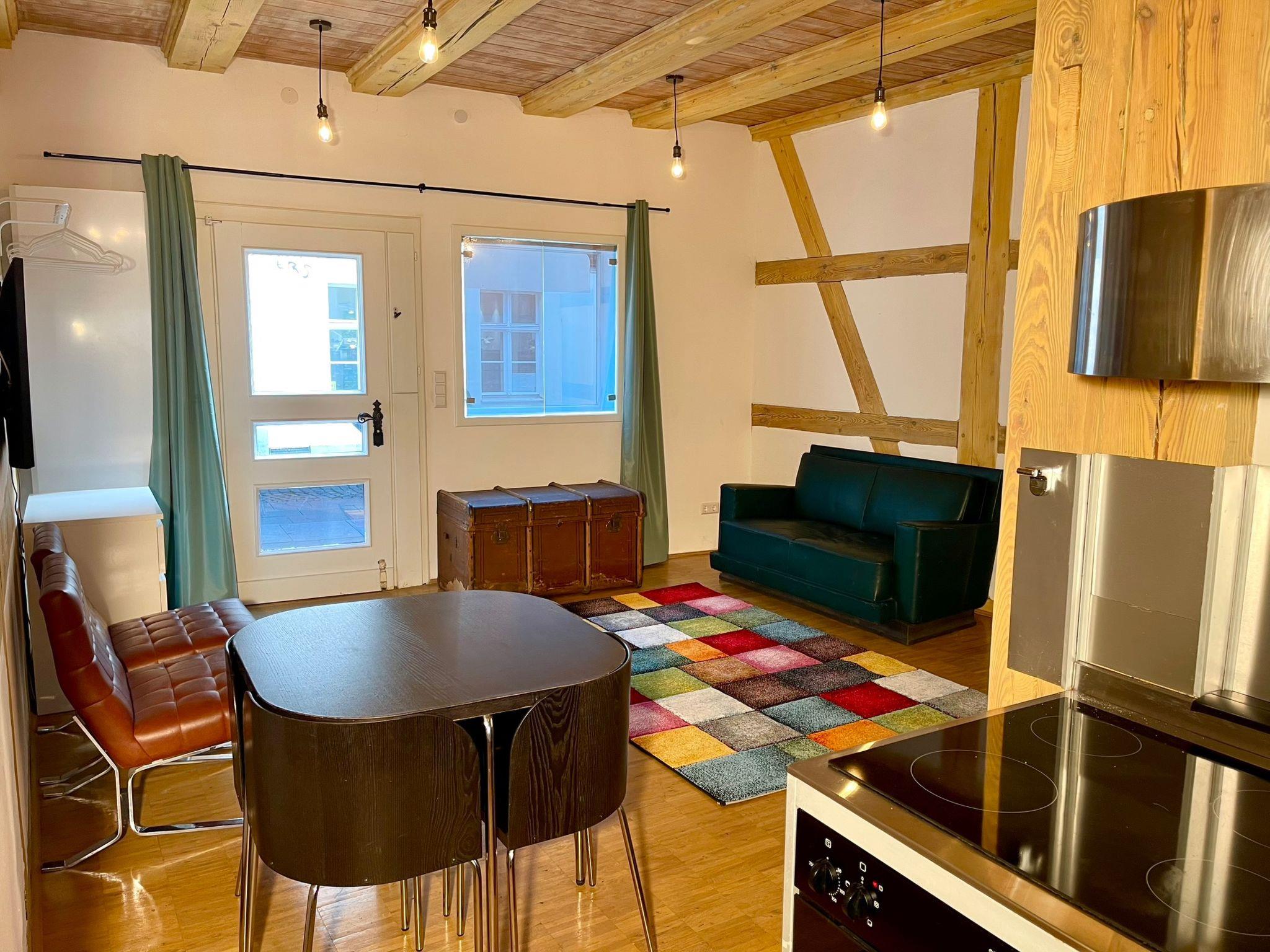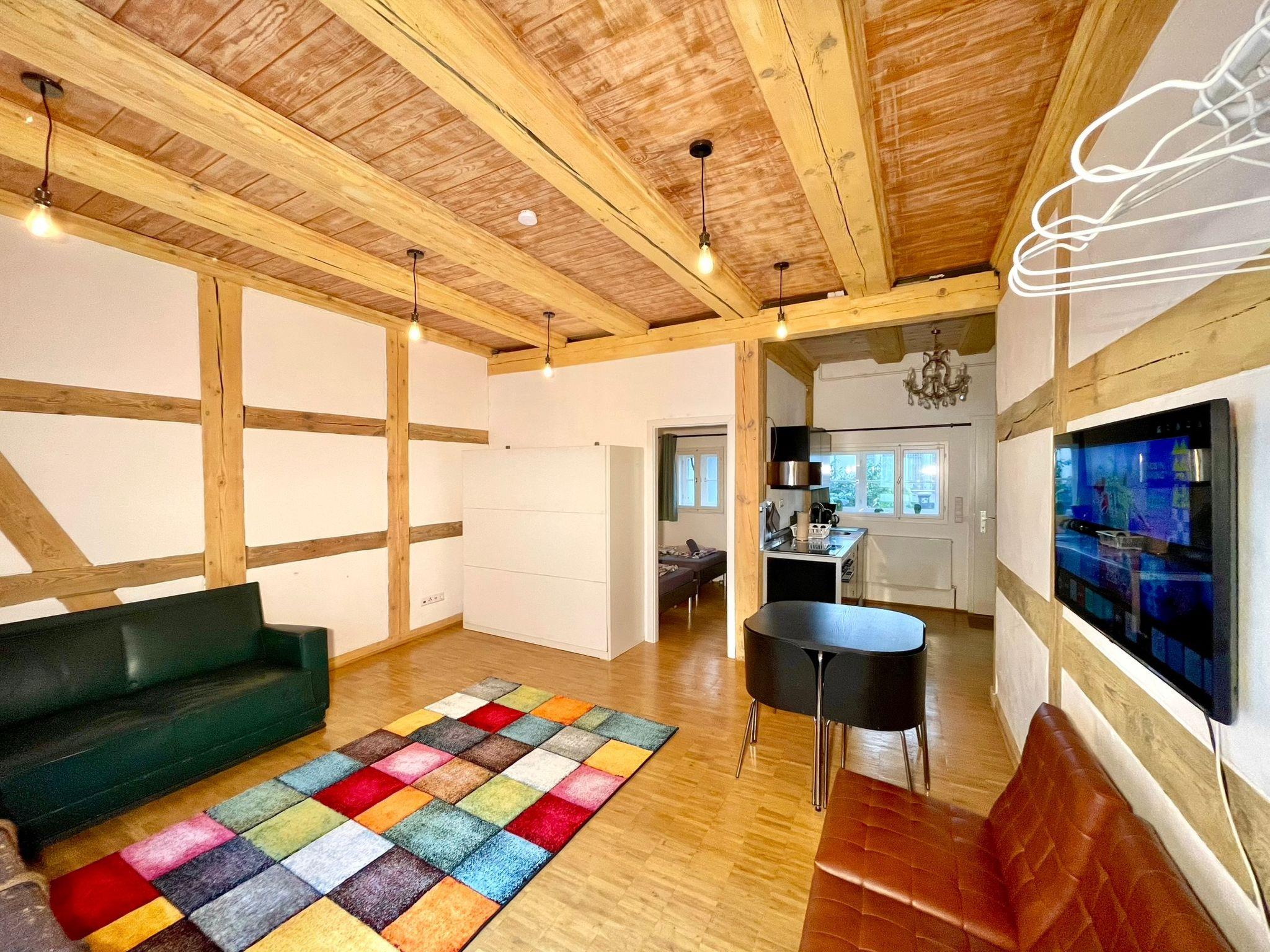 "Fachwerkhaus nahe Olympiastadion", 2-room terraced house 50 m2, on the ground floor. Comfortable and stylish furnishings: living/dining room with 1 double sofabed (180 cm, length 200 cm). Living/sleeping room with 2 beds (100 cm, length 200 cm). Open kitchen (oven, 4 induction hot plates, kettle) with kitchen corner. Shower/WC. Heating. Facilities: Internet (WiFi, free). Please note: non-smokers only. Smoke alarm, fire extinguisher. 2435921509776