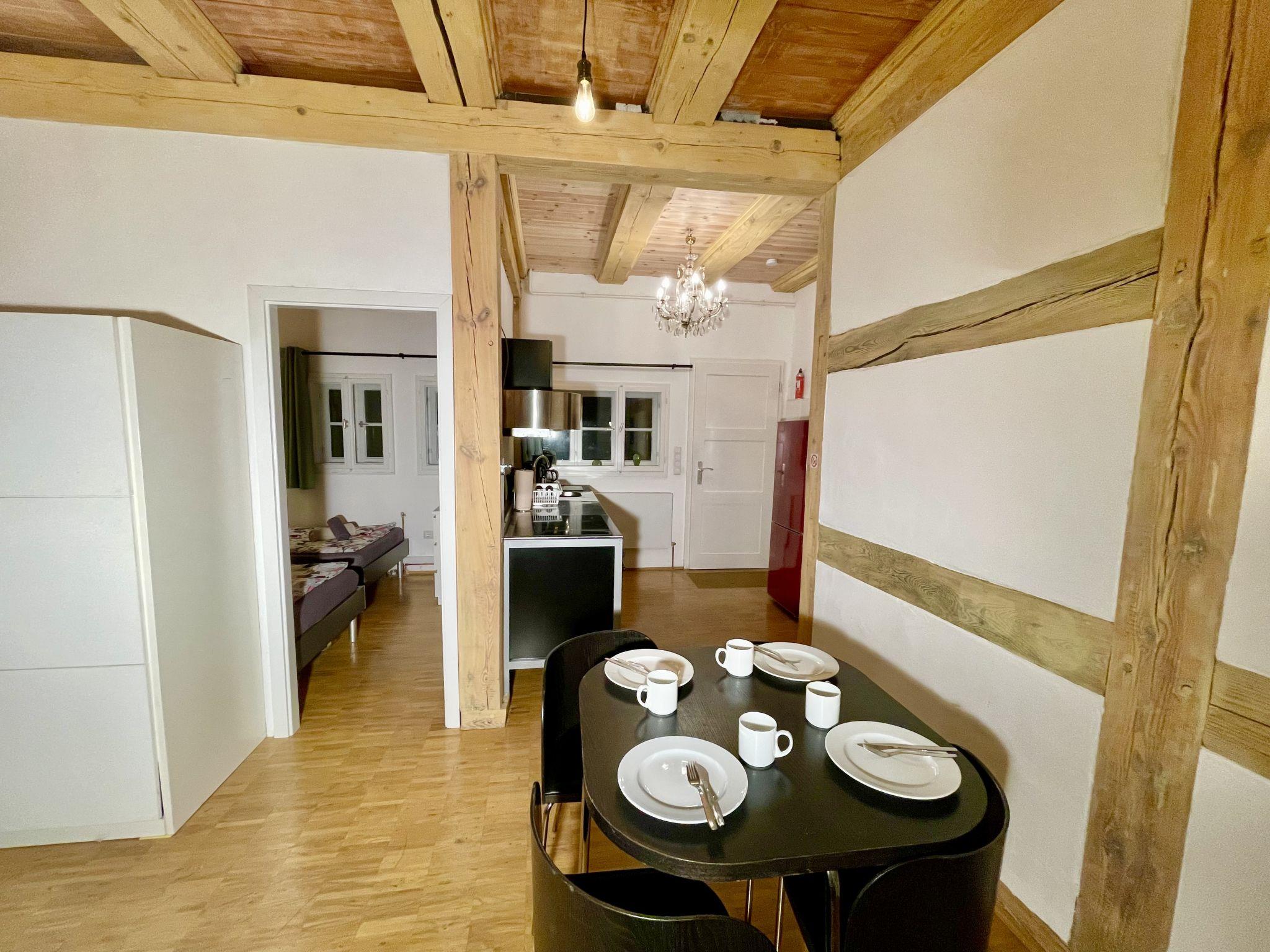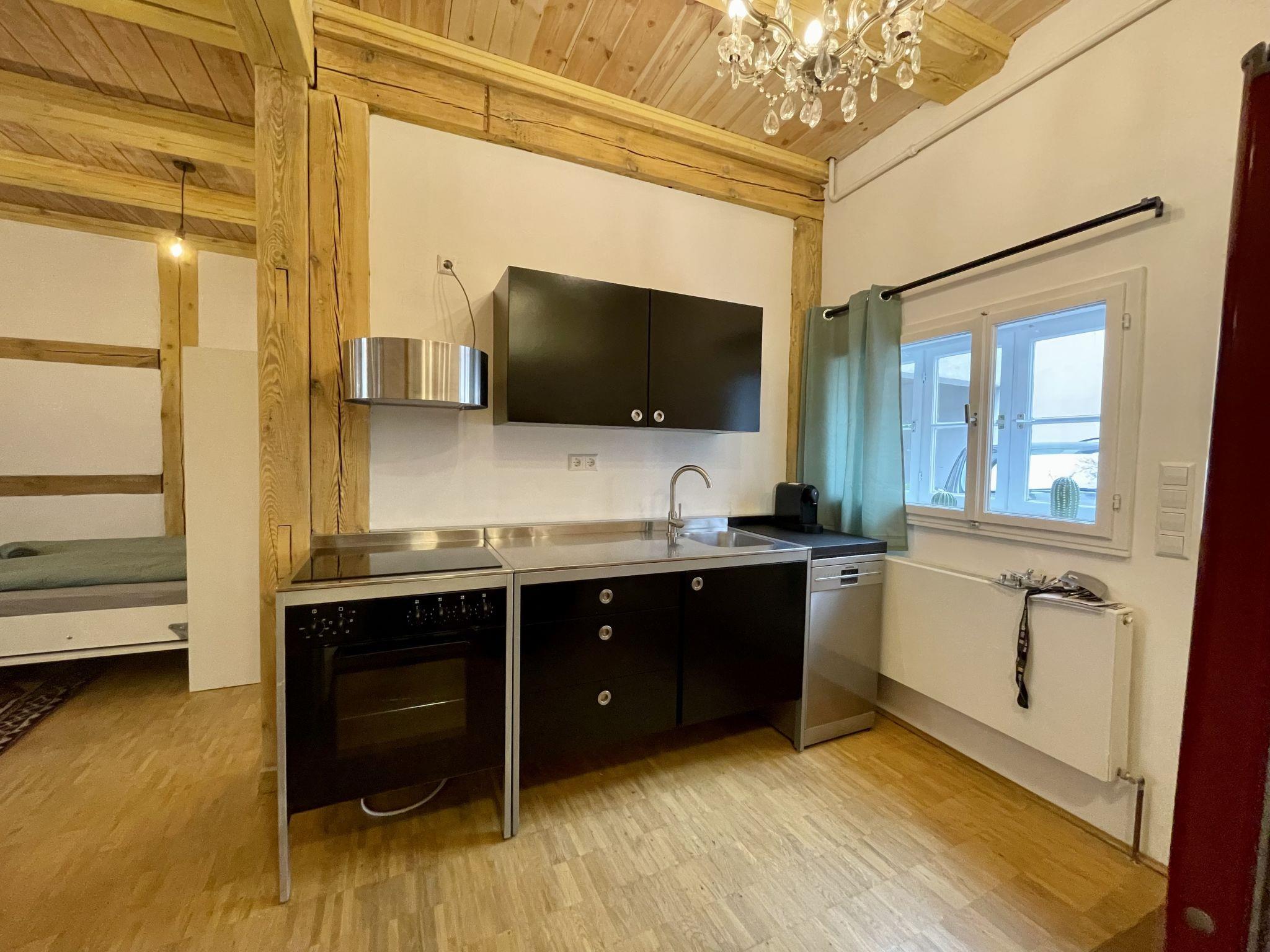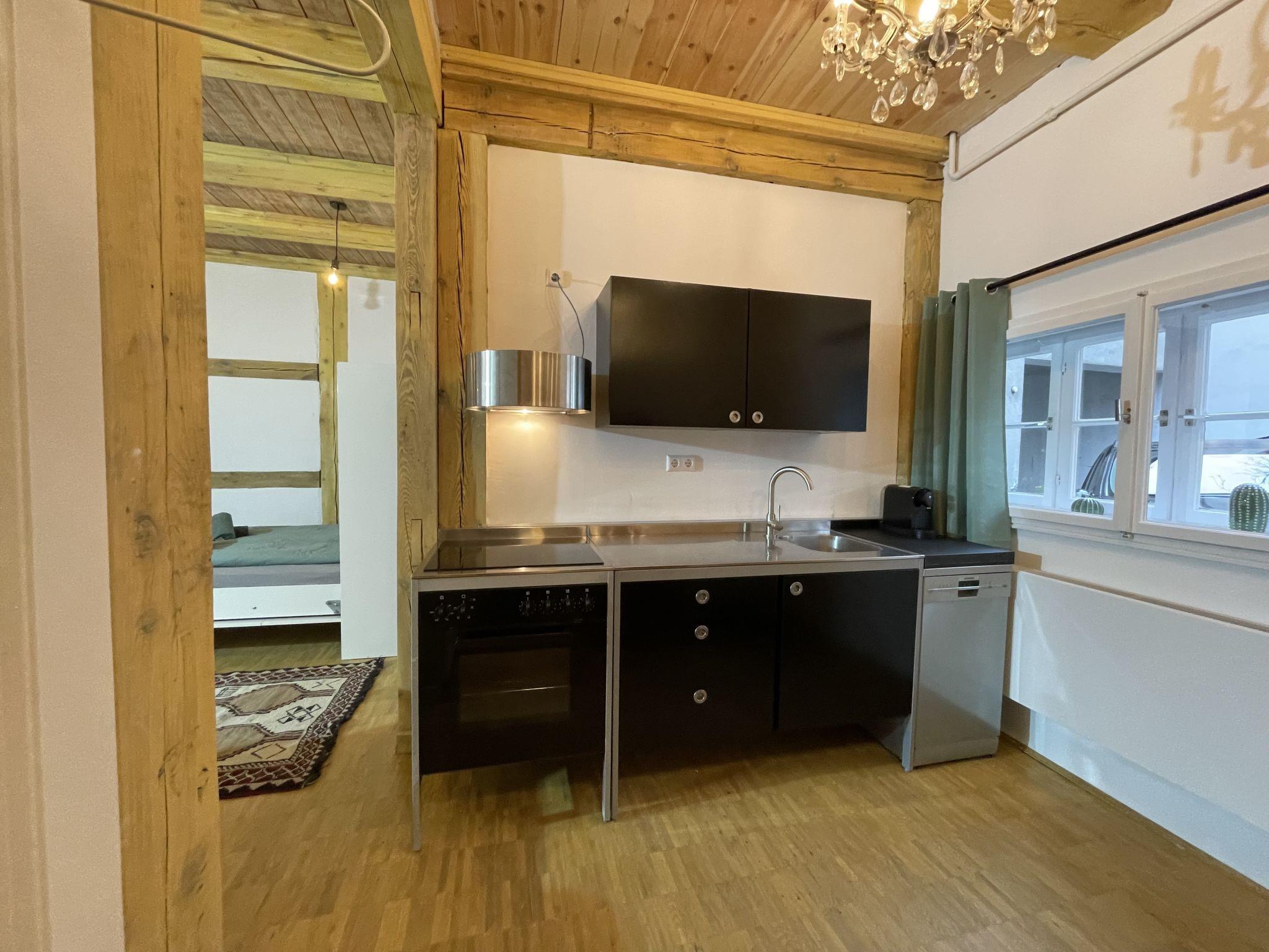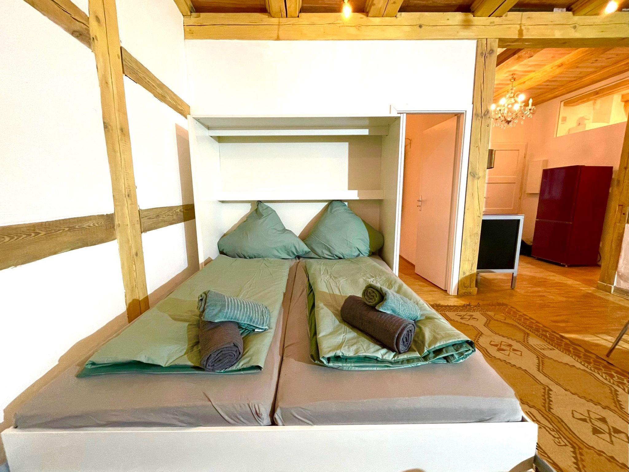 "Fachwerkhaus nahe Olympiastadion", 2-room terraced house 50 m2, on the ground floor. Comfortable and stylish furnishings: living/dining room with 1 double sofabed (180 cm, length 200 cm). Living/sleeping room with 2 beds (100 cm, length 200 cm). Open kitchen (oven, 4 induction hot plates, kettle) with kitchen corner. Shower/WC. Heating. Facilities: Internet (WiFi, free). Please note: non-smokers only. Smoke alarm, fire extinguisher. 2435921509776