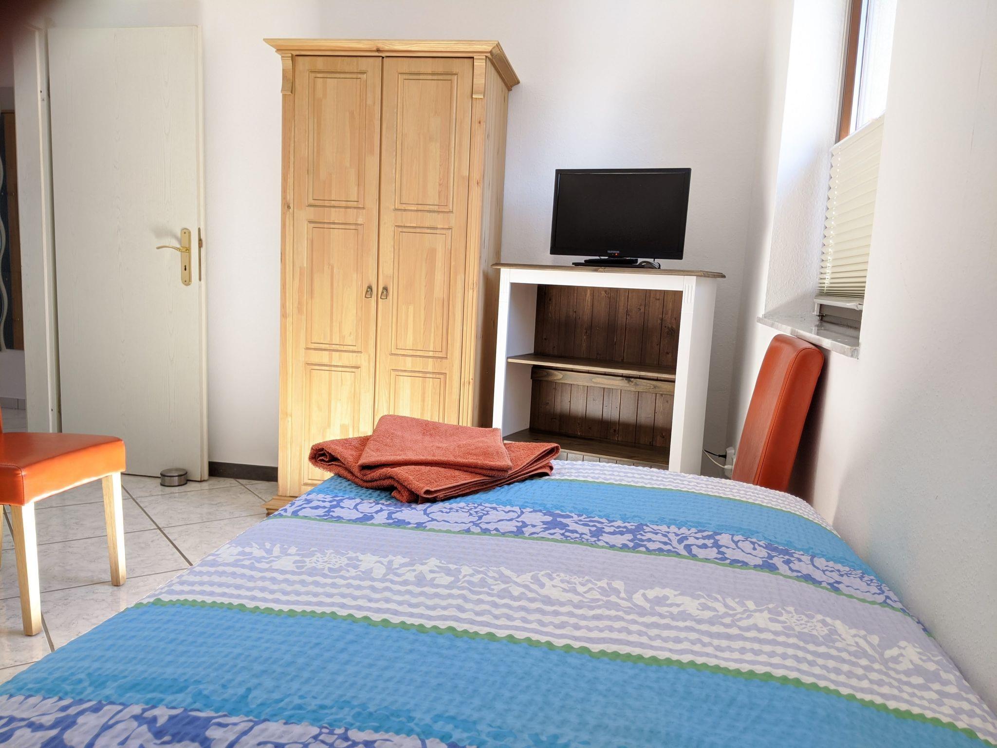 wardrobe is available. In the living room there is also a couch (three-seater and armchair) with a TV corner. In the bedroom there are also two single beds with wardrobe and TV.
