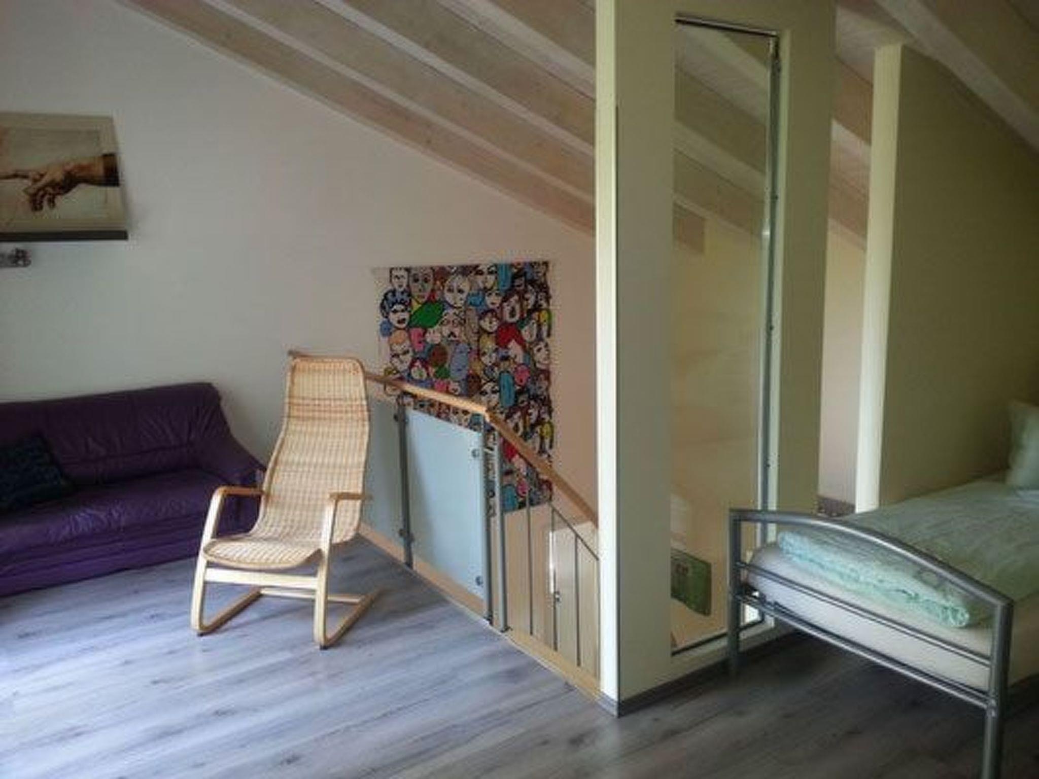 This maisonette holiday flat is located in the first house with two other flats. It has a living space of 50 square metres spread over two levels. Modern and comfortably furnished, it can accommodate up to five people. On the ground floor is the modern, spacious bathroom with walk-in shower, washbasin, WC, window and underfloor heating. The open-plan kitchen, which is equipped with an electric cooker, fridge, kettle, coffee machine and toaster, as well as a seating area with a table and four chairs, and a sofa bed, are also located in the lower living area. From here, a staircase takes you directly to the open-plan, spacious sleeping area on the upper floor. Here you can sleep in two single beds (90 x 200 cm) and on a double sofa bed. Underfloor heating allows the maisonette to be used all year round.