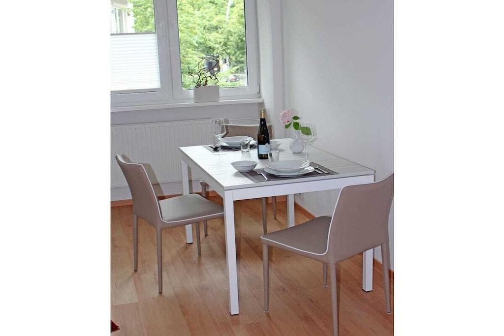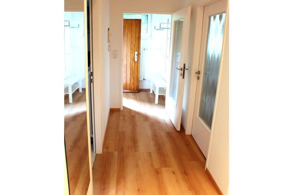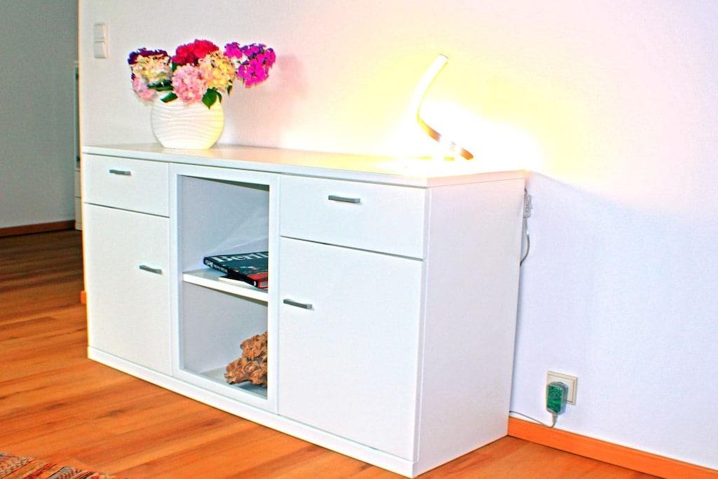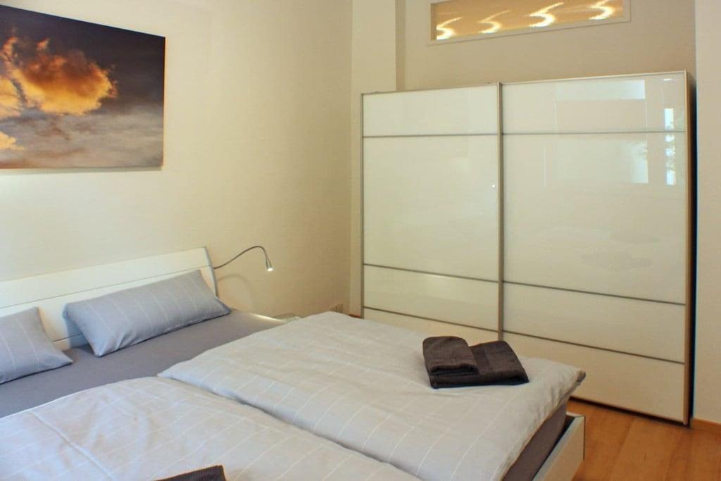 En ny og moderne møbleret ferielejlighed venter på dig, fuldstændig renoveret i 2017. De lyse og rolige to værelser med højt til loftet, samt den overdækkede gang med siddeområde, er perfekt egnet til to personer. Internet og Wi-Fi er inkluderet, ligesom opredte senge og håndklæder. Til underholdning giver et UHD-tv i stuen/spisestuen adgang til private kanaler, en musikstation med alle afspilningsmuligheder fra plader til USB-sticks og Bluetooth, samt en radio. Køkkenet er fuldt udstyret, inklusive en ovn med integreret mikrobølgeovn, opvaskemaskine, vaskemaskine, induktionskogeplade, køleskab med fryser og mange andre apparater. Skydedørsgarderoben i soveværelset og skabet i gangen tilbyder masser af plads til dine ejendele. Et opvarmet spejl i brusebadet sikrer et klart udsyn.