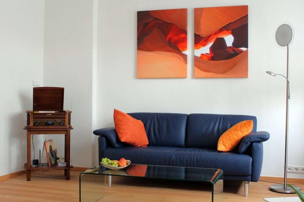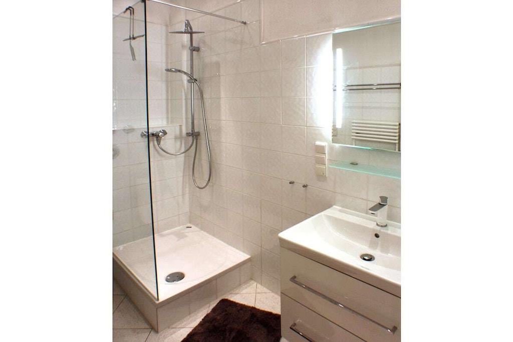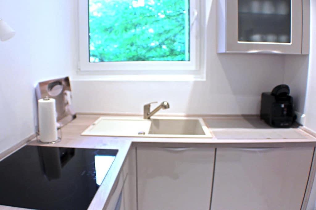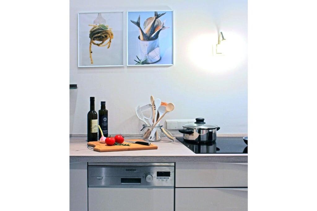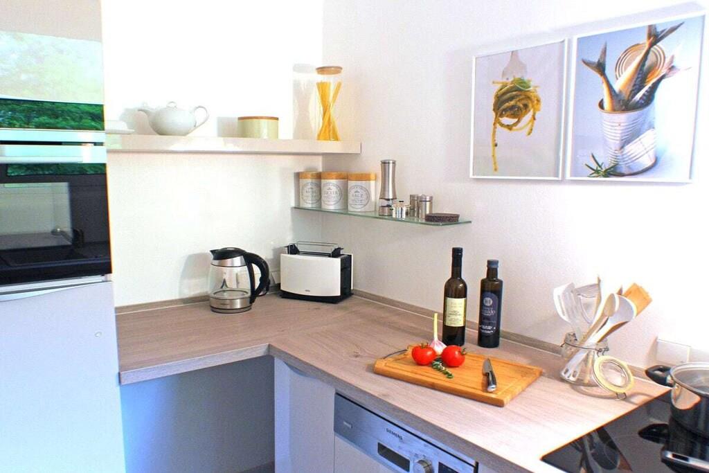 En ny og moderne møbleret ferielejlighed venter på dig, fuldstændig renoveret i 2017. De lyse og rolige to værelser med højt til loftet, samt den overdækkede gang med siddeområde, er perfekt egnet til to personer. Internet og Wi-Fi er inkluderet, ligesom opredte senge og håndklæder. Til underholdning giver et UHD-tv i stuen/spisestuen adgang til private kanaler, en musikstation med alle afspilningsmuligheder fra plader til USB-sticks og Bluetooth, samt en radio. Køkkenet er fuldt udstyret, inklusive en ovn med integreret mikrobølgeovn, opvaskemaskine, vaskemaskine, induktionskogeplade, køleskab med fryser og mange andre apparater. Skydedørsgarderoben i soveværelset og skabet i gangen tilbyder masser af plads til dine ejendele. Et opvarmet spejl i brusebadet sikrer et klart udsyn.