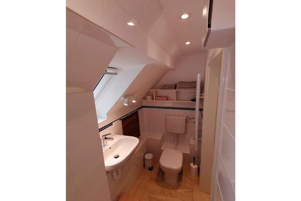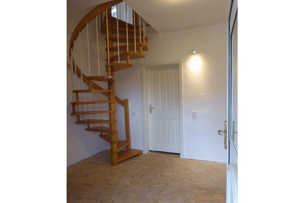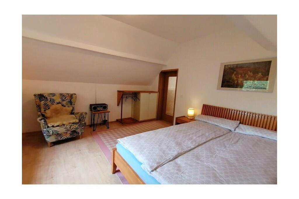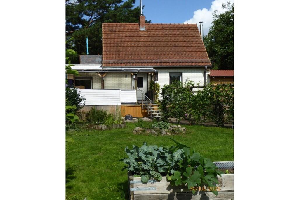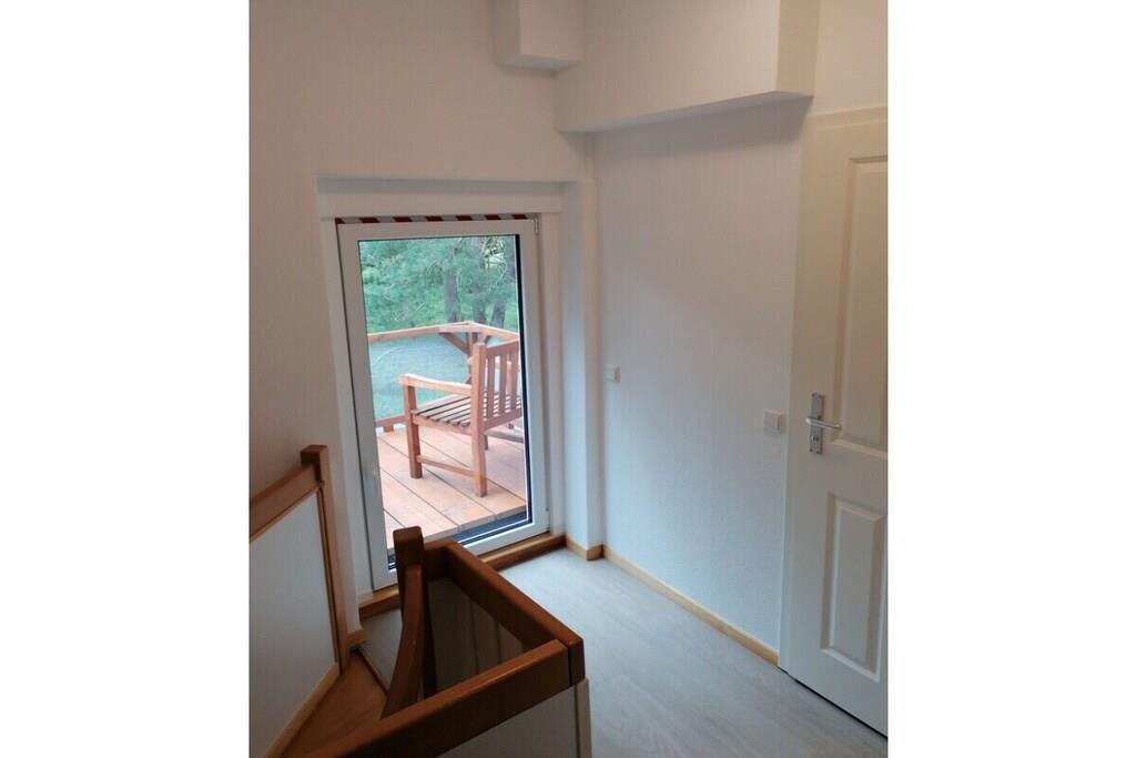 Lejlighed på 37 m² i grønne Berlin-omgivelser på øverste etage med tagterrasse, tekøkken med minikøleskab på øverste etage, brusebadeværelse, stue/soveværelse. Fuldt udstyret køkken i stueetagen, babyseng tilgængelig på forespørgsel. Have med grill og bålplads. Gynge. Cykler og kano til rådighed på forespørgsel.