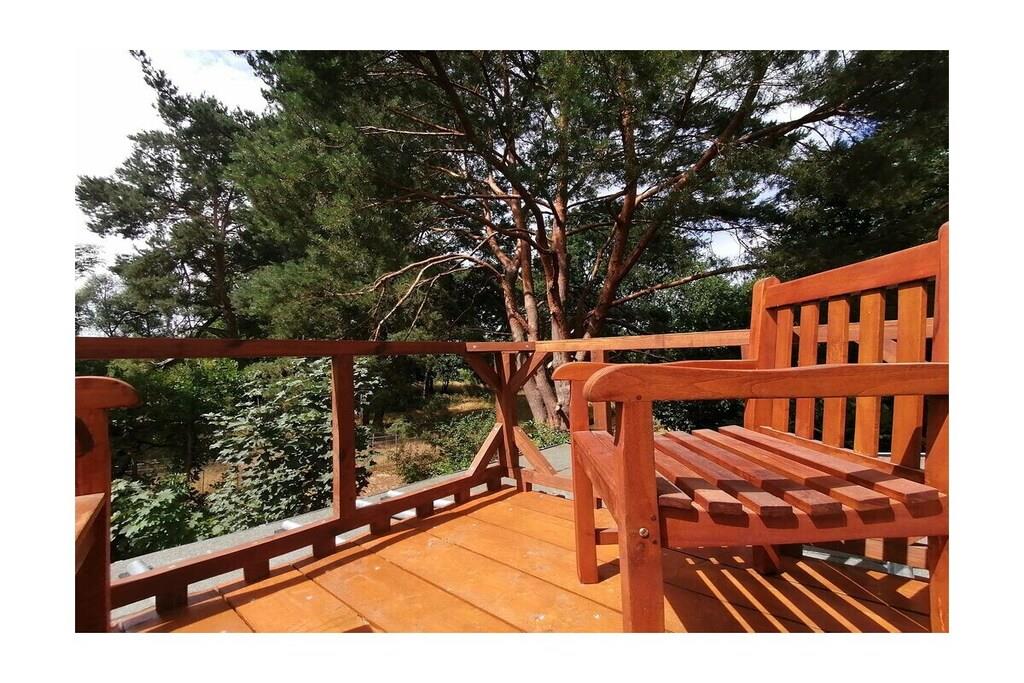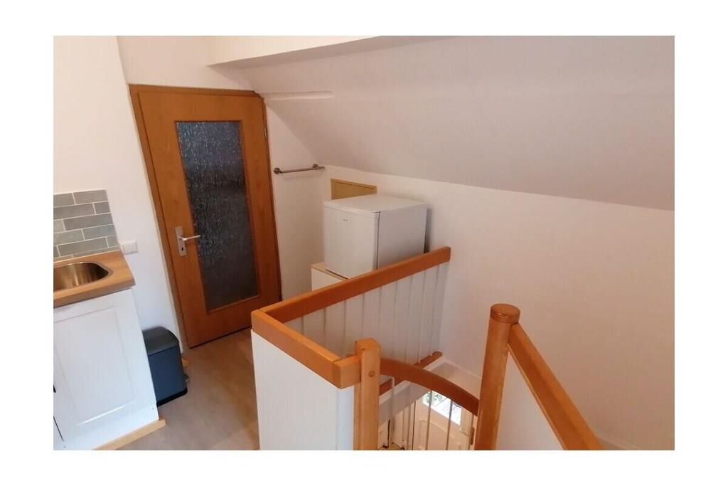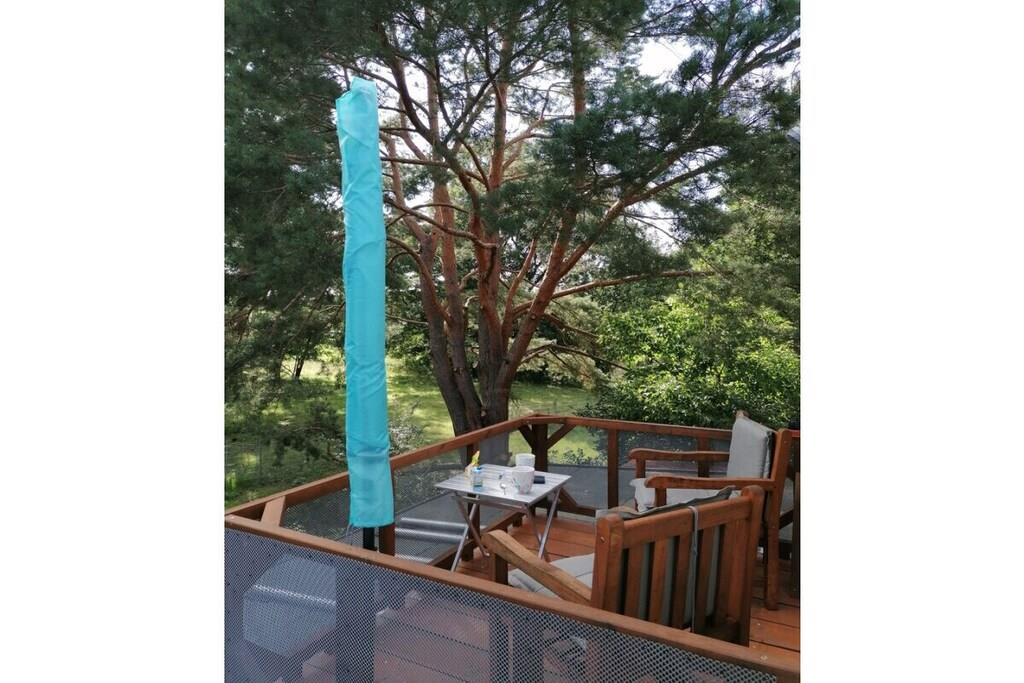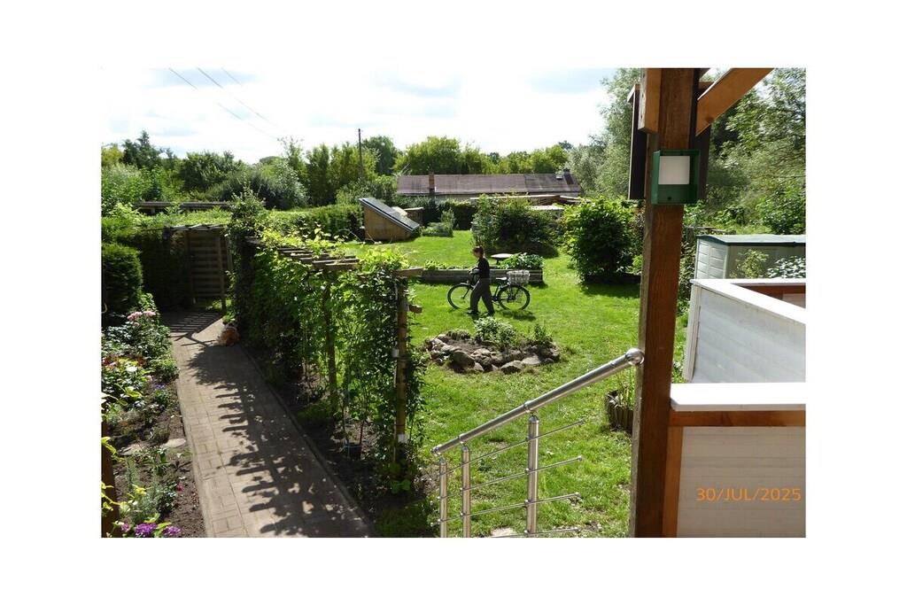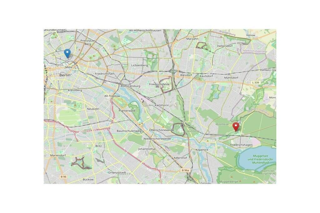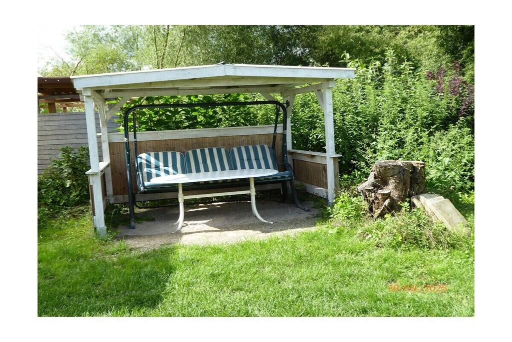 Lejlighed på 37 m² i grønne Berlin-omgivelser på øverste etage med tagterrasse, tekøkken med minikøleskab på øverste etage, brusebadeværelse, stue/soveværelse. Fuldt udstyret køkken i stueetagen, babyseng tilgængelig på forespørgsel. Have med grill og bålplads. Gynge. Cykler og kano til rådighed på forespørgsel.