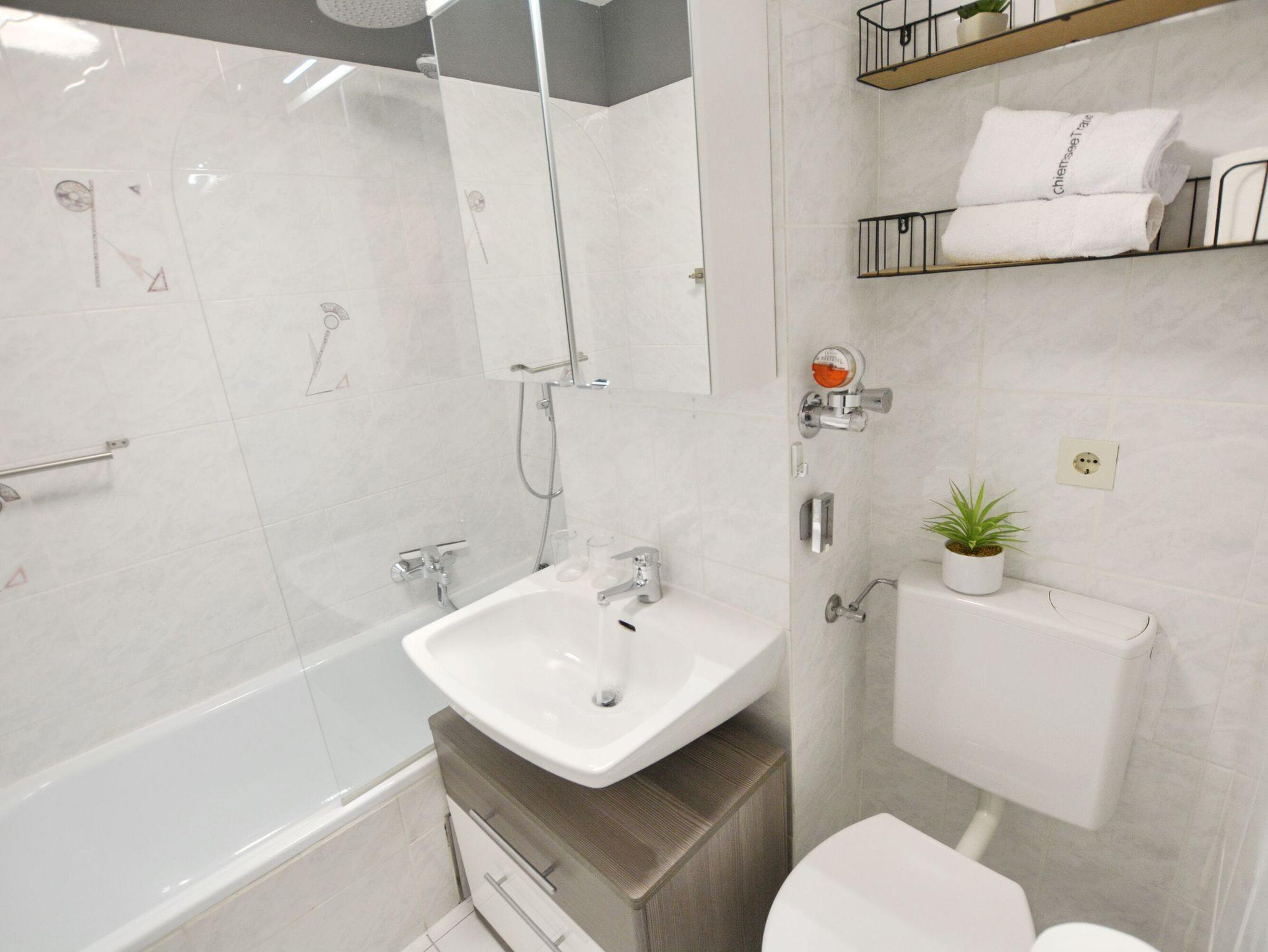 Klein aber fein präsentiert sich das 1-Zimmer-Apartment ChiemseeTraum, welches im 1.Stockwerk gelegen ist (es sind 2 Stockwerke jedoch zu gehen). Der geschickt und modern gestaltete Wohn-, Ess- und Schlafbereich bietet alles, um den Urlaub in vollen Zügen genießen zu können. Vom Ost-Balkon bietet sich ein Blick auf den Bach und die Berge. Vervollständigt wird das Feriendomizil durch offene Küche, Flur mit Garderobe, sowie Badezimmer mit Badewanne, Waschbecken und WC.