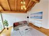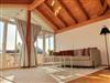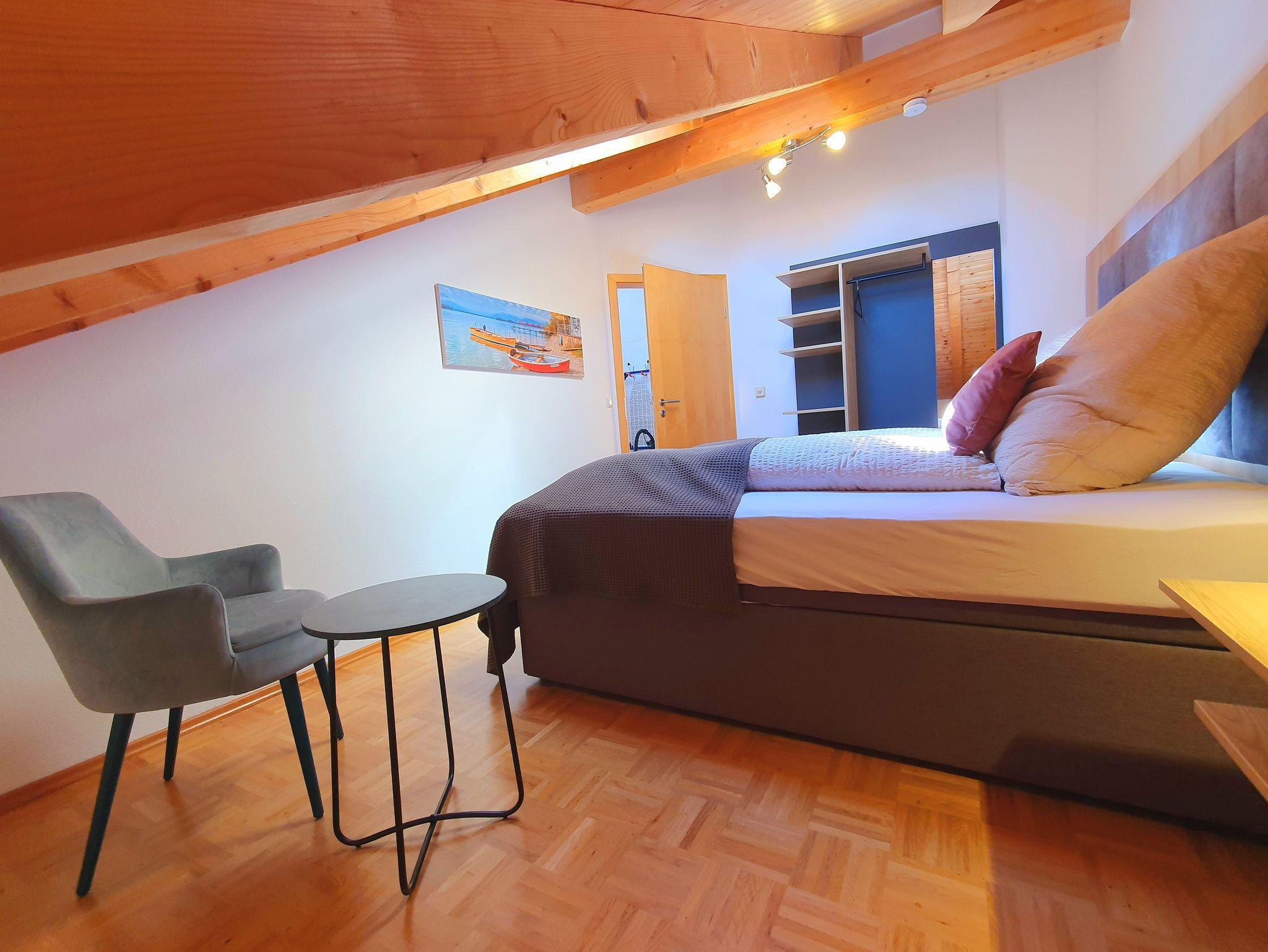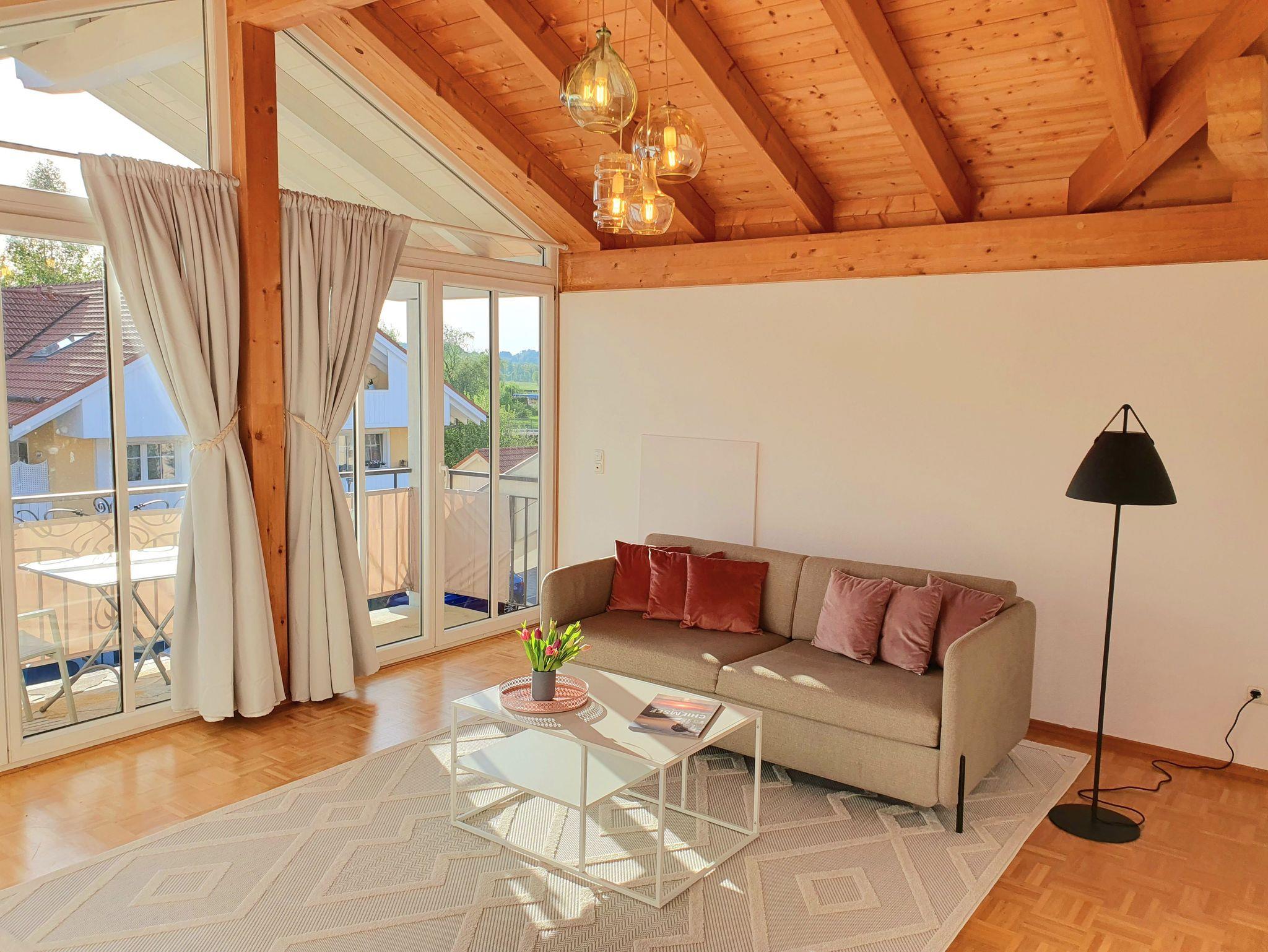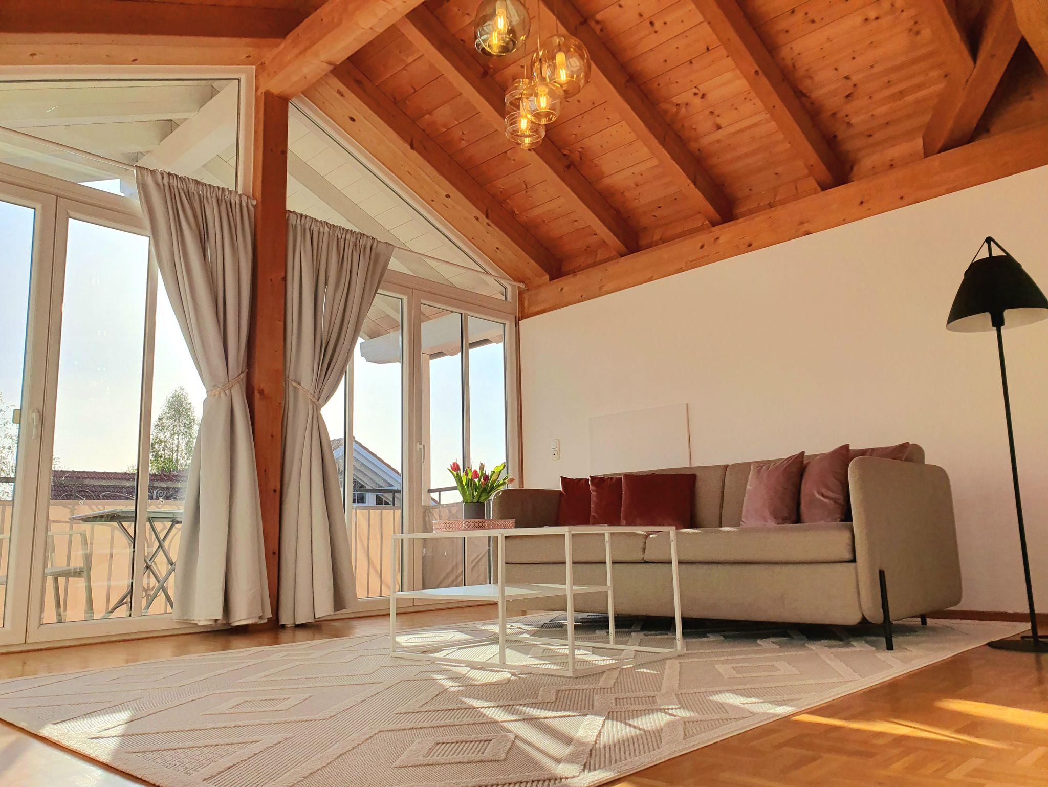 Ein echtes Highlight der Wohnung sind die sichtbaren Dachstuhlbalken, die großzügige Raumhöhe und die zwei Balkone. Auf dem Südbalkon können Sie auf einer Lounge-Liege für zwei Personen entspannen, während Sie auf dem Westbalkon die traumhafte Bergsicht und den Sonnenuntergang genießen. Ein Essplatz lädt zum Verweilen ein und macht die Wohnung perfekt für erholsame Tage.